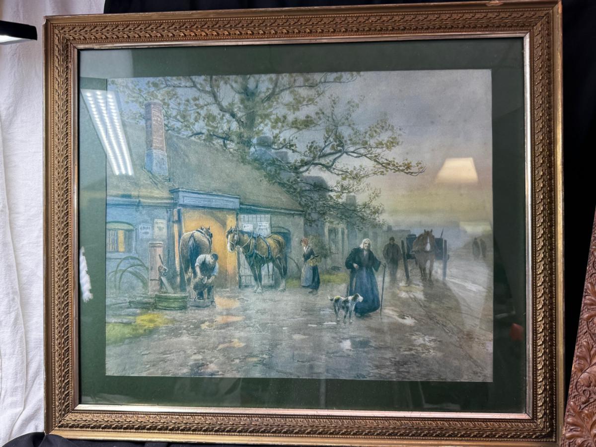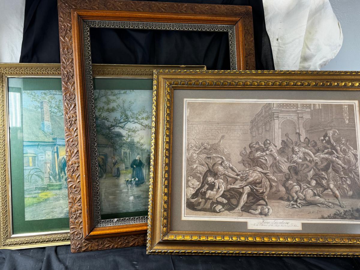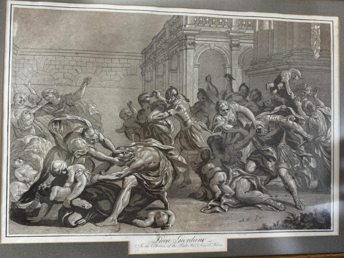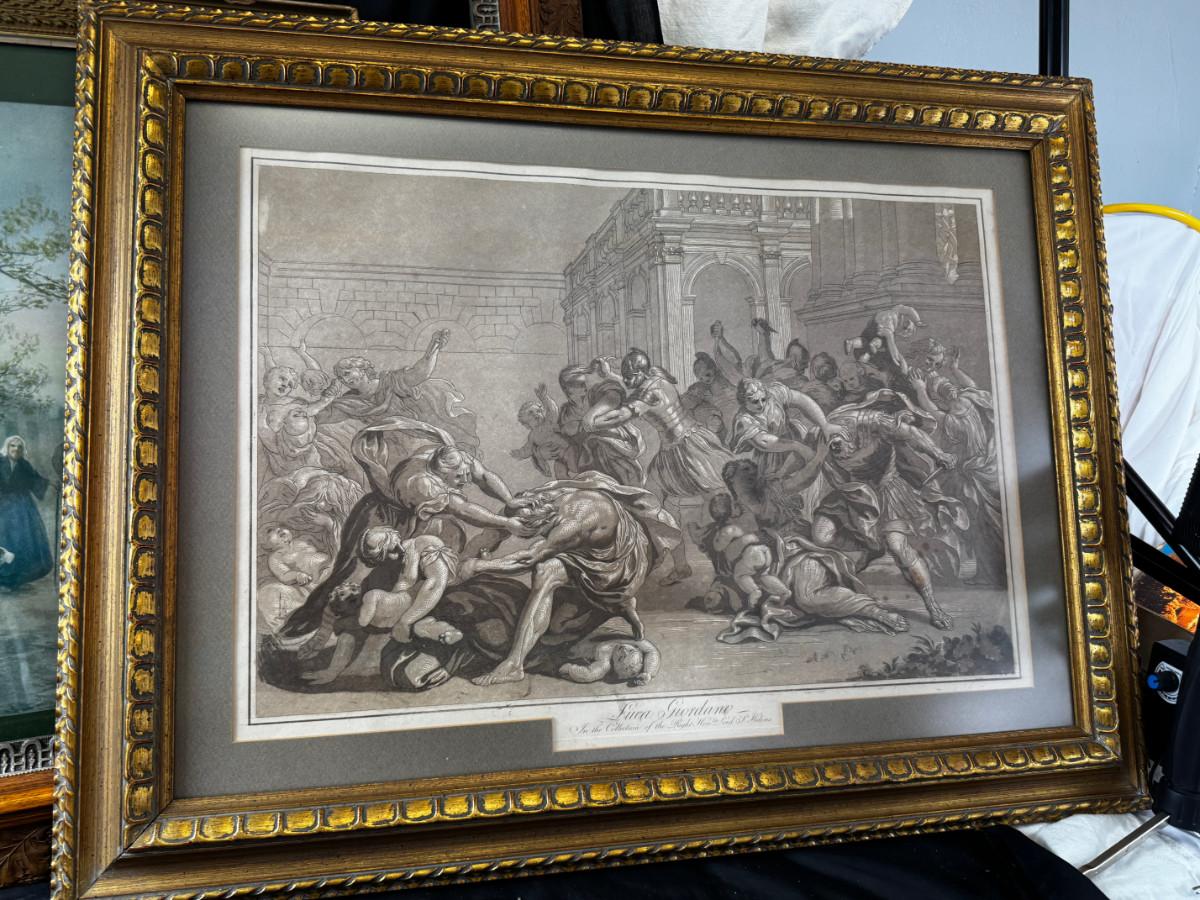 Ornate Oak and acorn frame only , This is an antique print depicting the classical subject of the Rape of the Sabine Women. The work is after a design by an artist, potentially Luca Giordano as inscribed on the image . Framed country print, unknown artist..