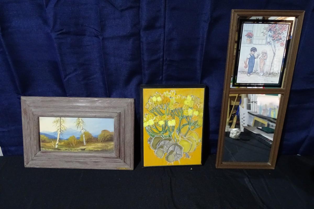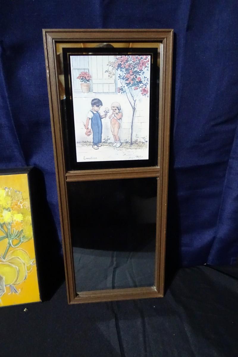 3 Vintage art pieces; Painting by Betsy Jones, 1974 Modernism; mirror and print décor piece by Georges Redon titled "Emotion"