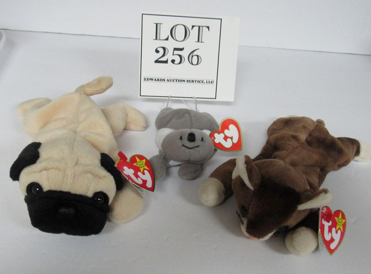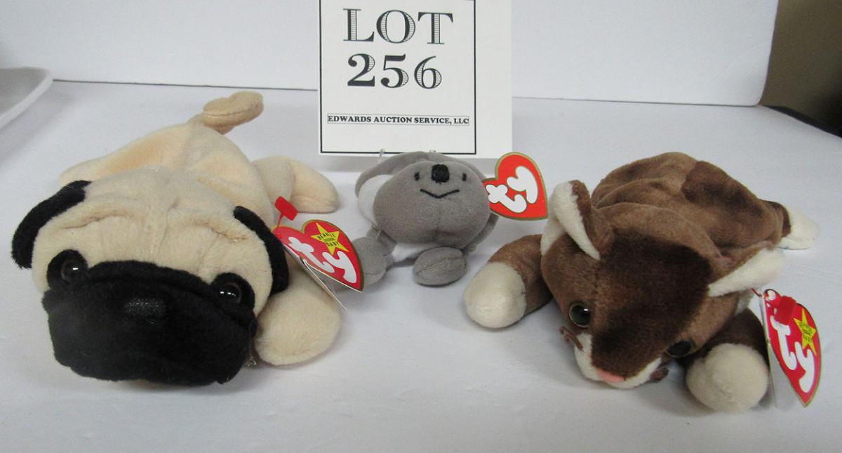 3 Vintage Beanie Babies:  Pounce the Cat, Puglsey the Pug Dog, Mel Teenie Beanie