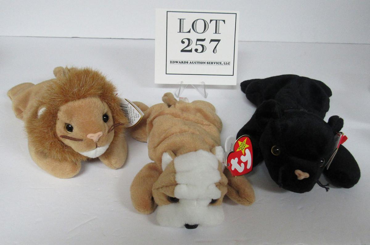 3 Vintage Beanie Babies:  Roary the Lion, Velvet the Black Panther, Wrinkle the Dog