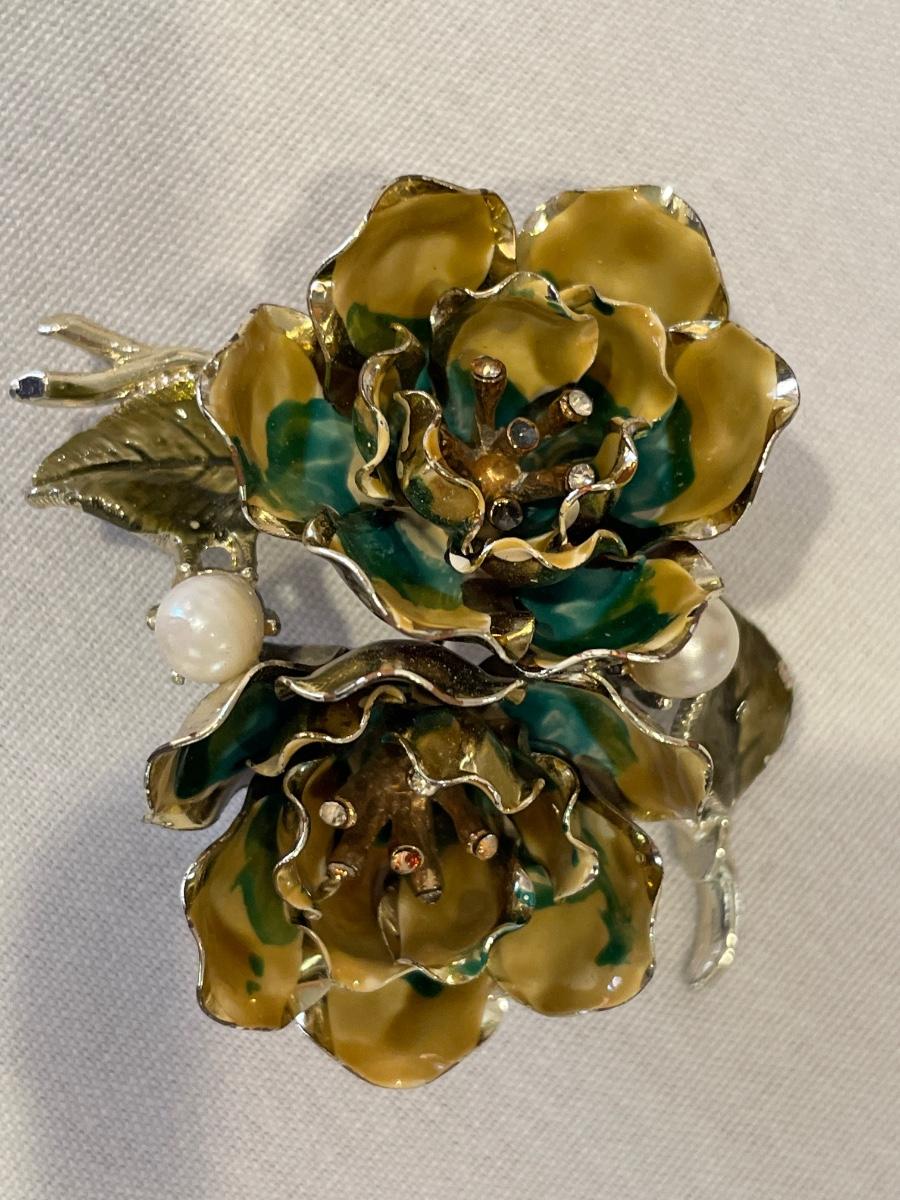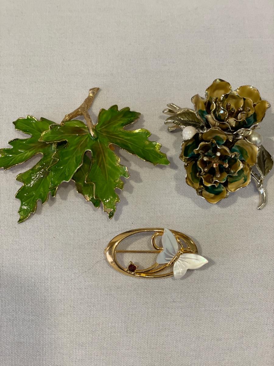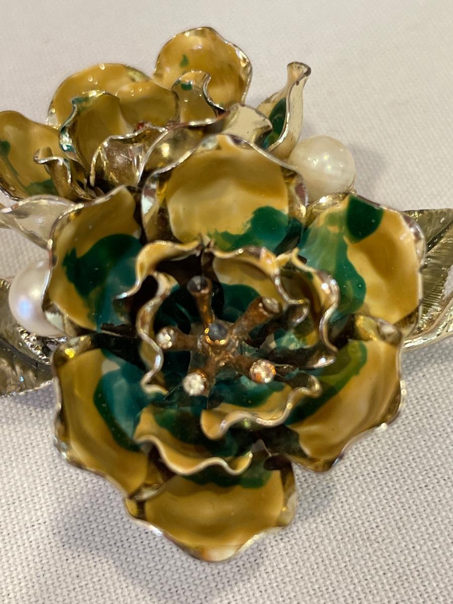 Large green and yellow flower brooch is Coro and is missing 2 small stones