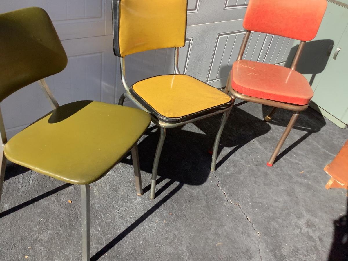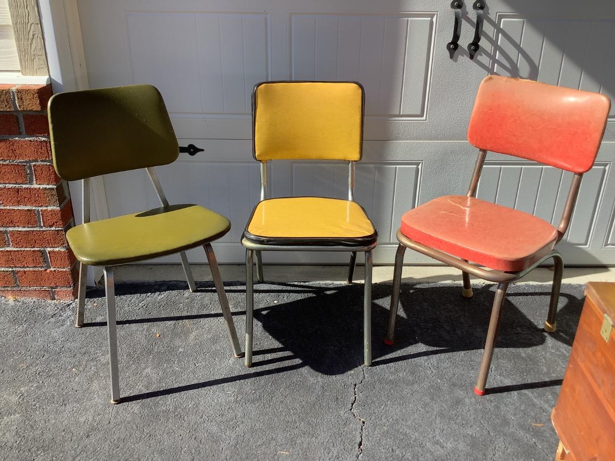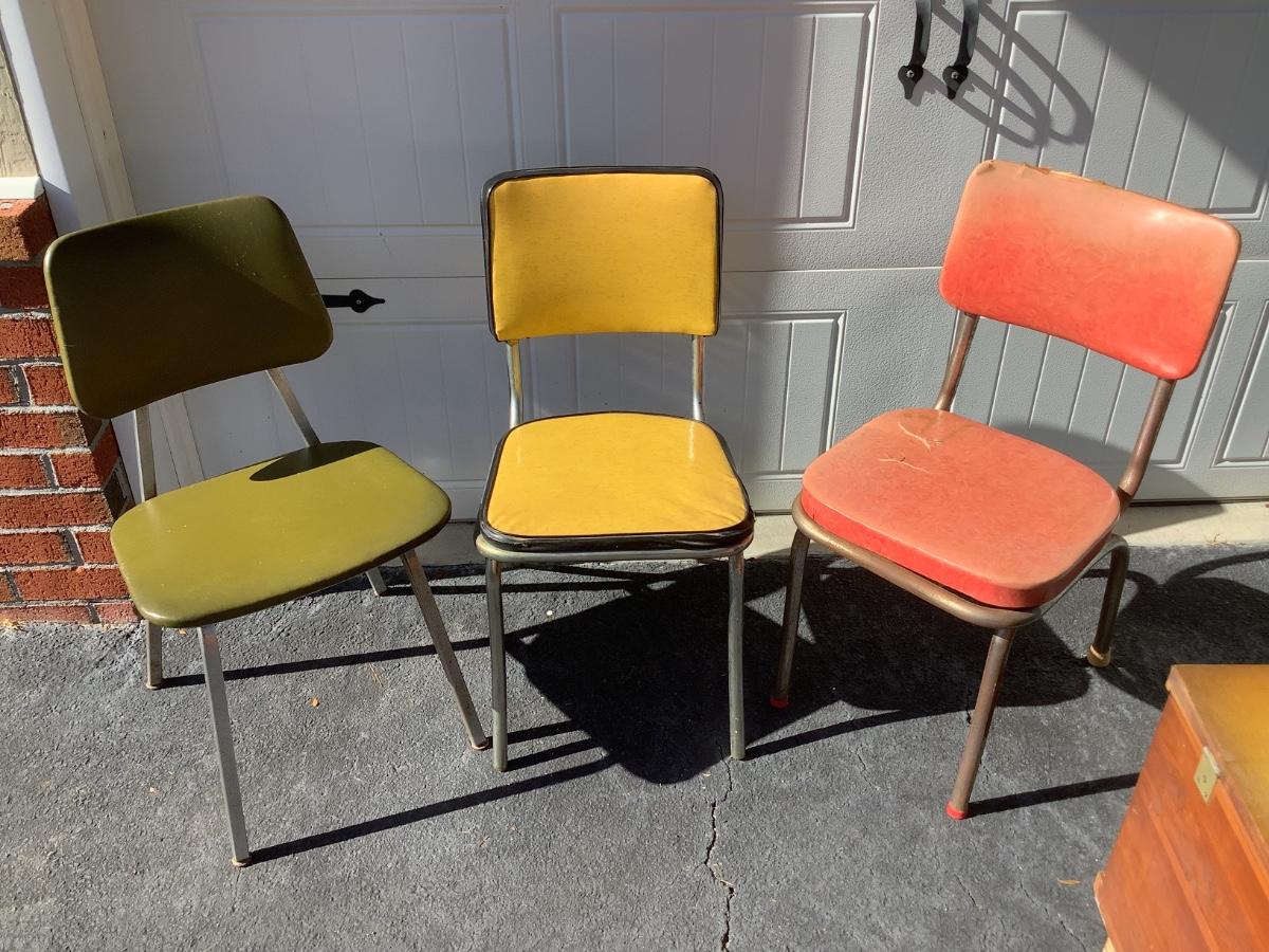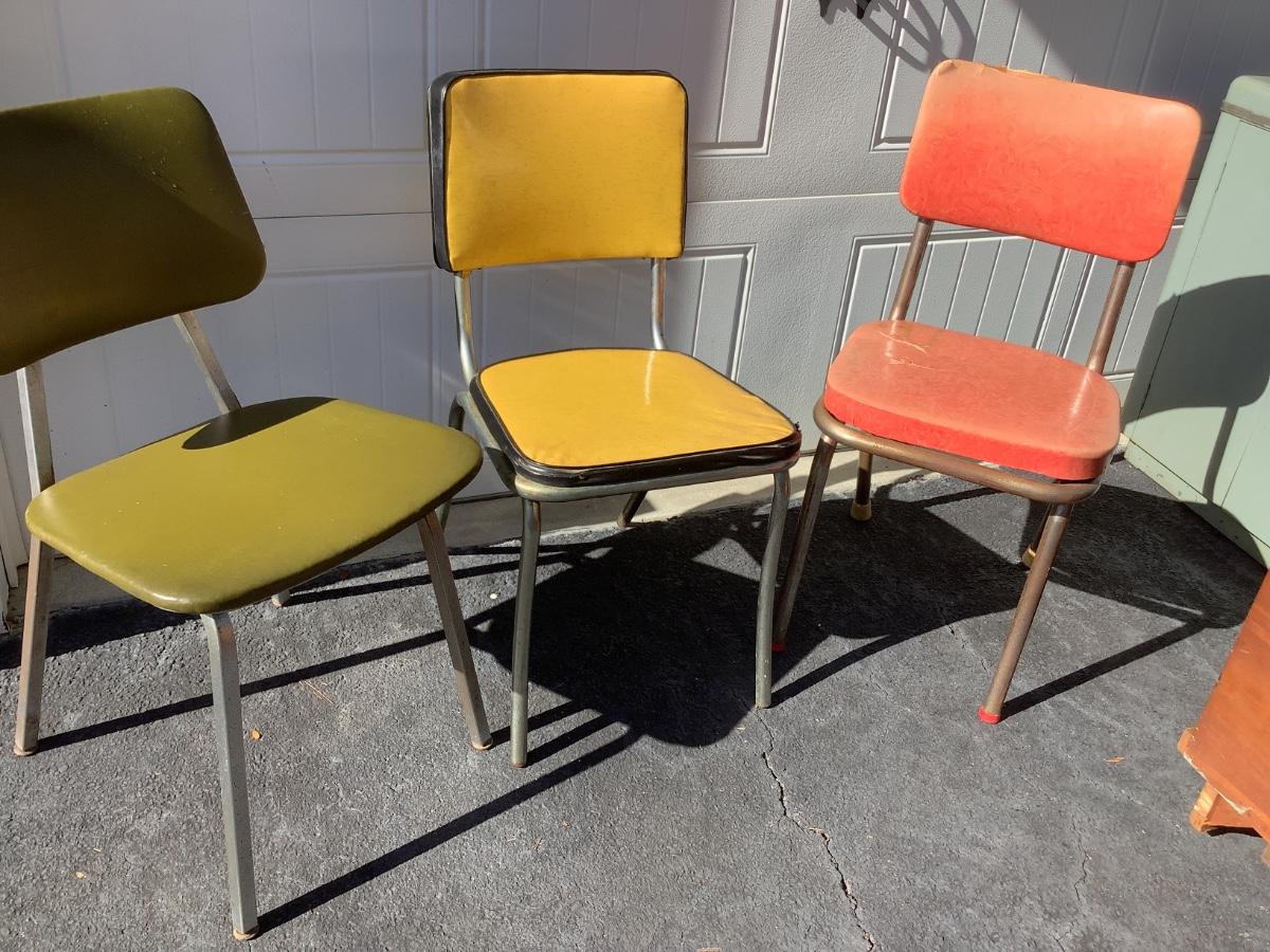 3 Vintage Chairs, green, yellow, red, approx 31"-32"H 16"-17"W 15"-16"depth