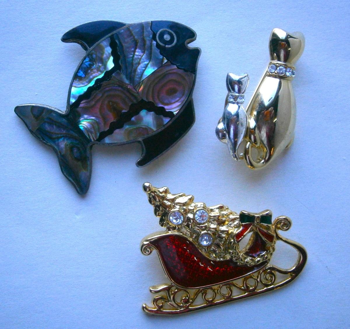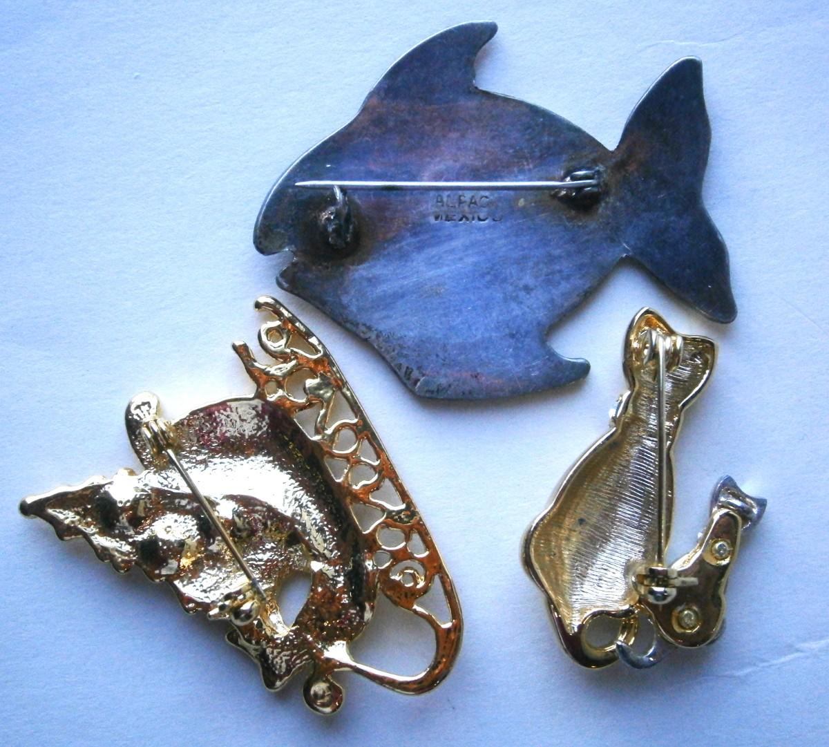 (3) Vintage Costume Jewelry Pins, 1 3/4 t 2 in. wide, metal with gold finish, fish is made in Mexico and is Alpaca with Mother of Pearl.