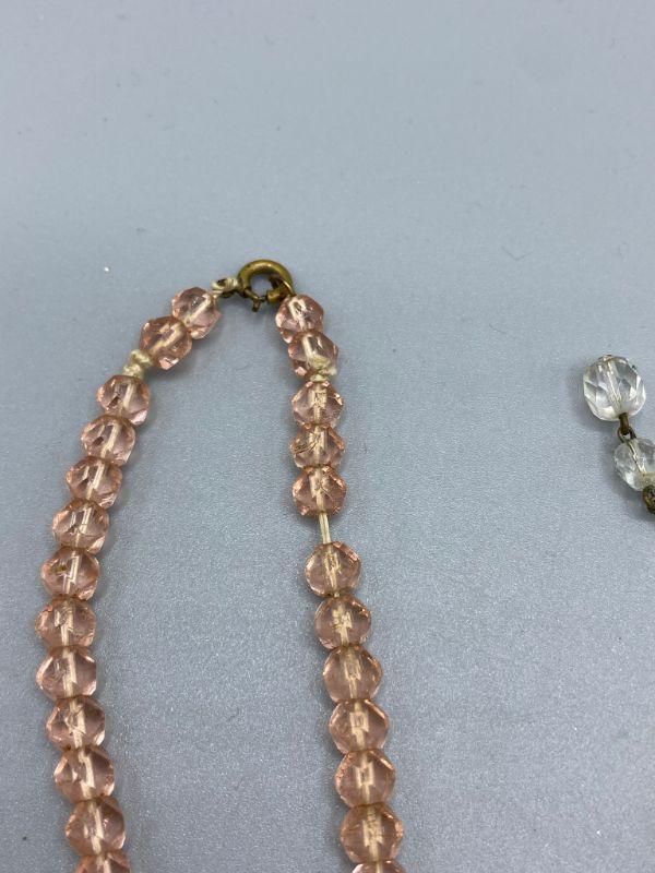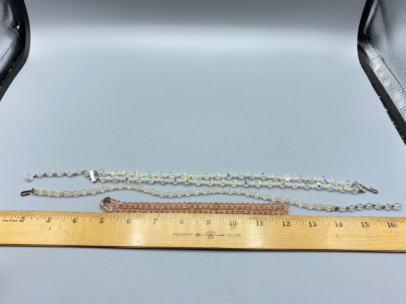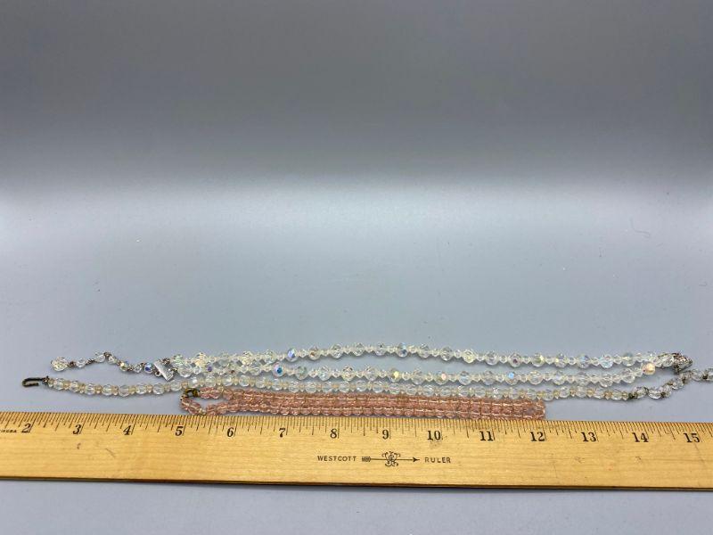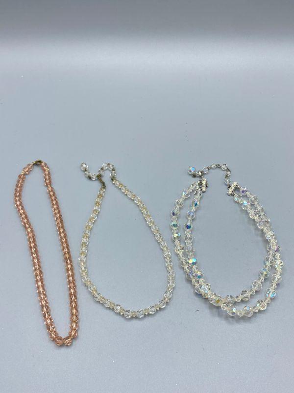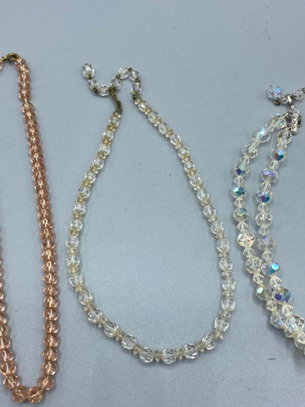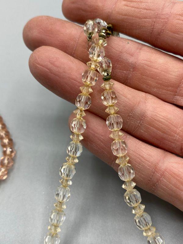 3 vintage beaded necklaces. Glass faceted beads. Choker styles. The peachy pink has been repaired and the knots are visible. The one in the center needs to be cleaned, looks like that may have been worn often. The double strand is in good condition, lots of sparkle.