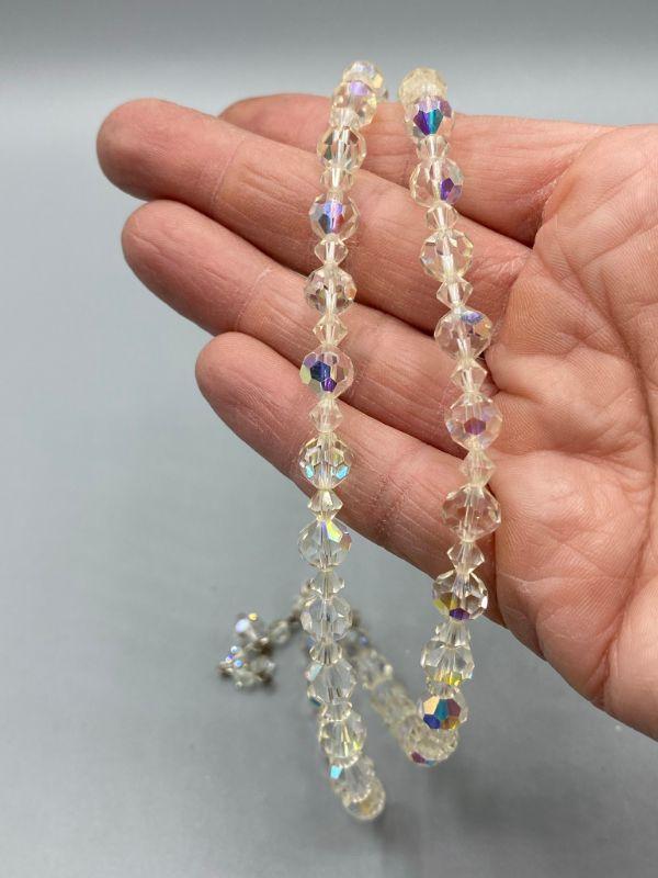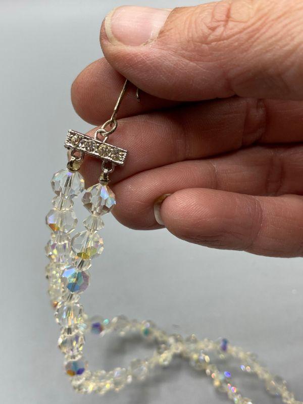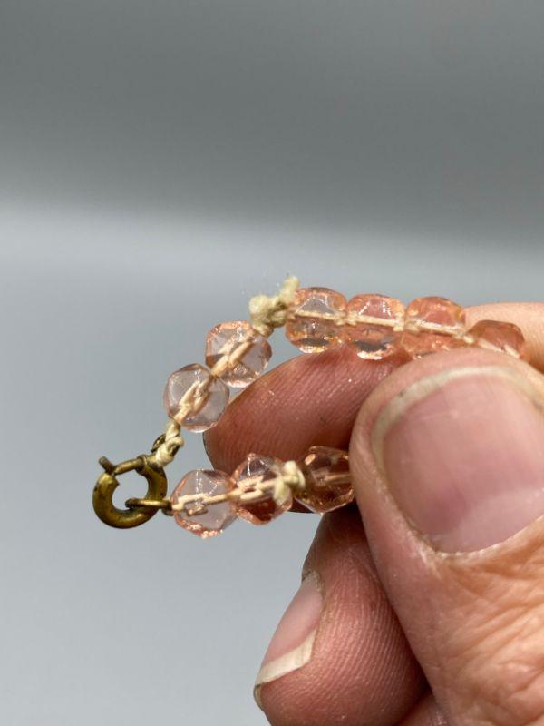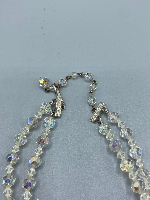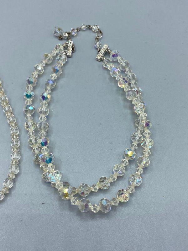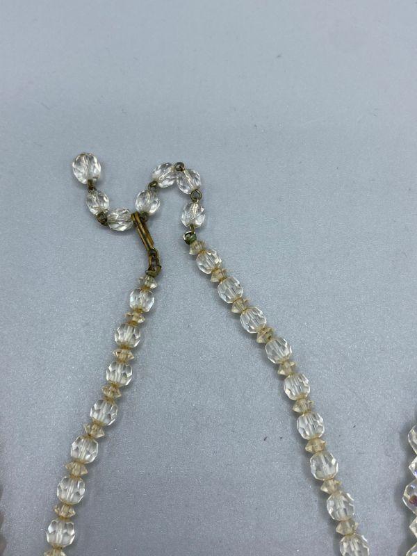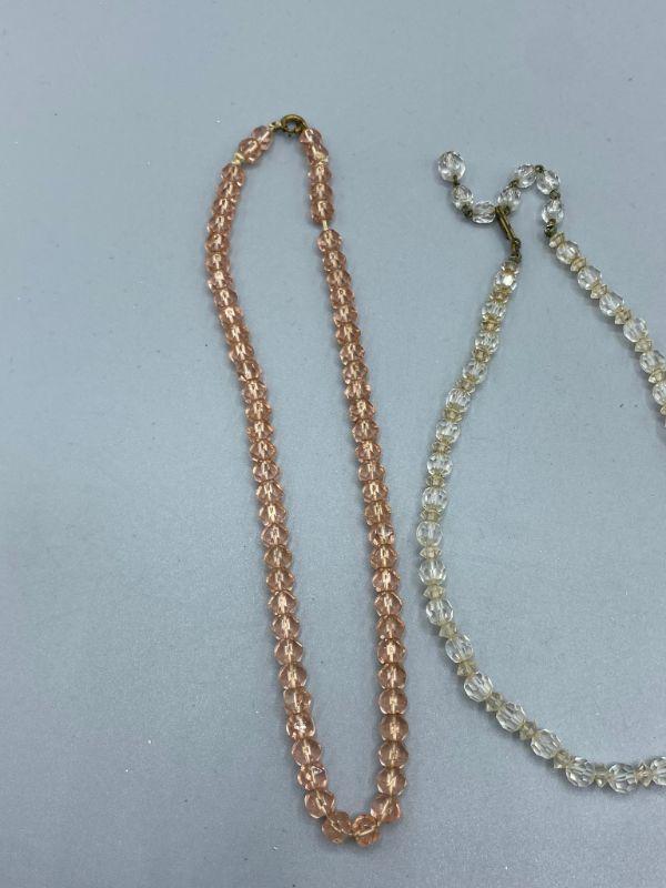 3 vintage beaded necklaces. Glass faceted beads. Choker styles. The peachy pink has been repaired and the knots are visible. The one in the center needs to be cleaned, looks like that may have been worn often. The double strand is in good condition, lots of sparkle.