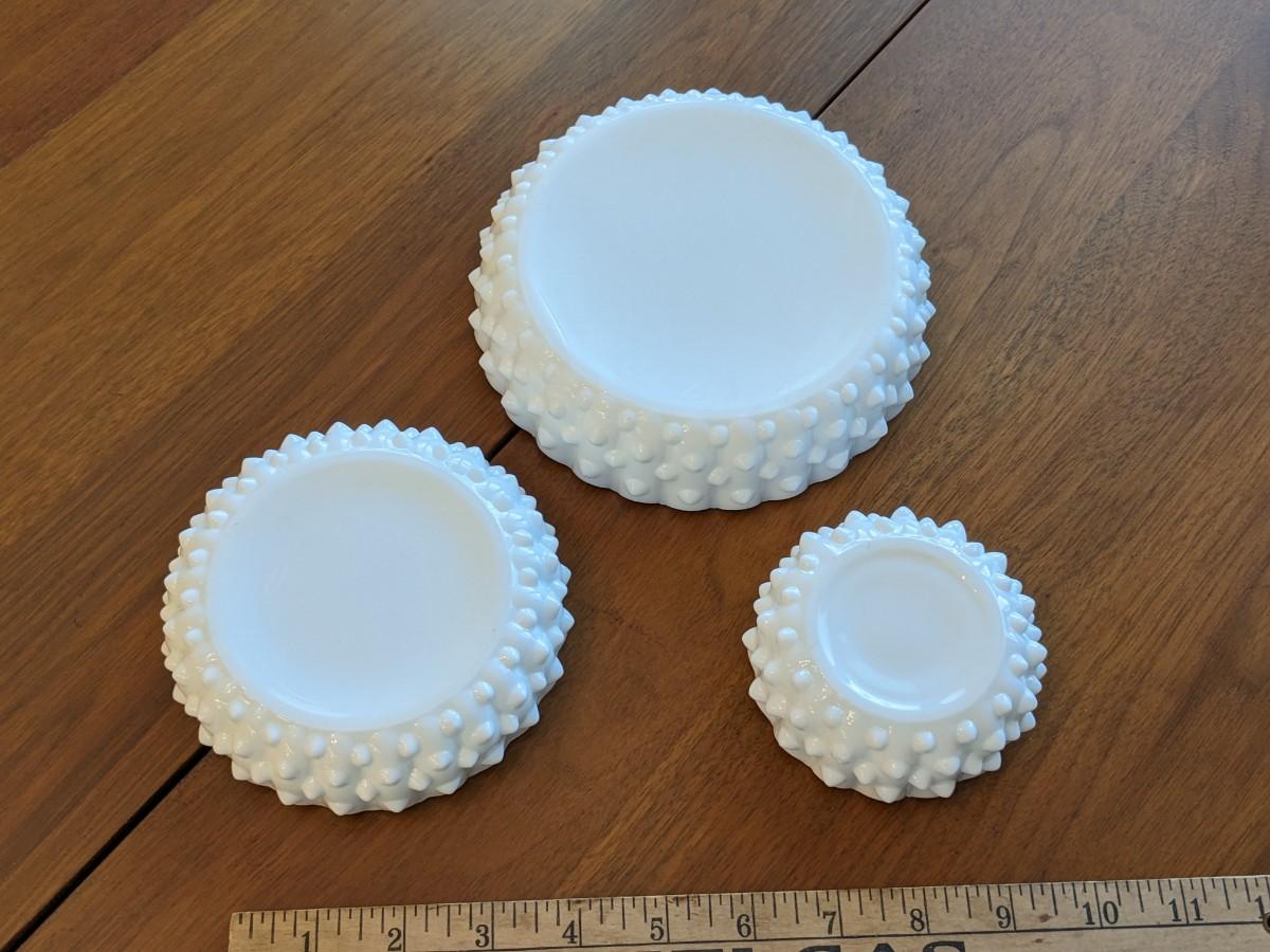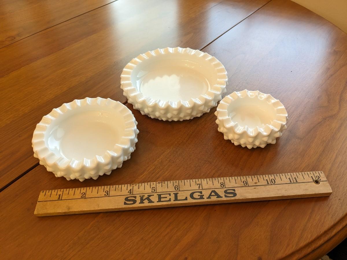 3 VINTAGE FENTON HOBNAIL MILK GLASS ASHTRAYS