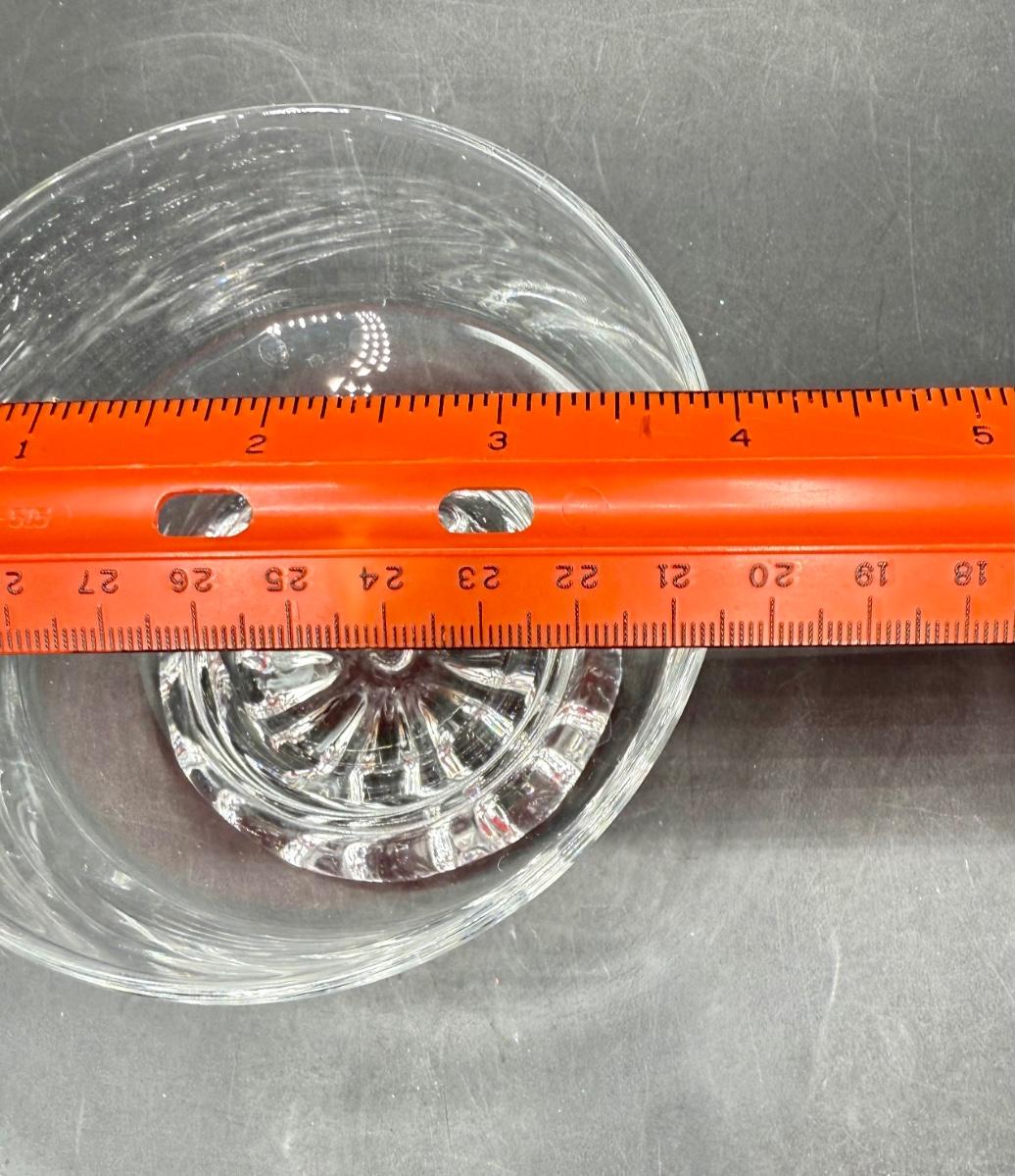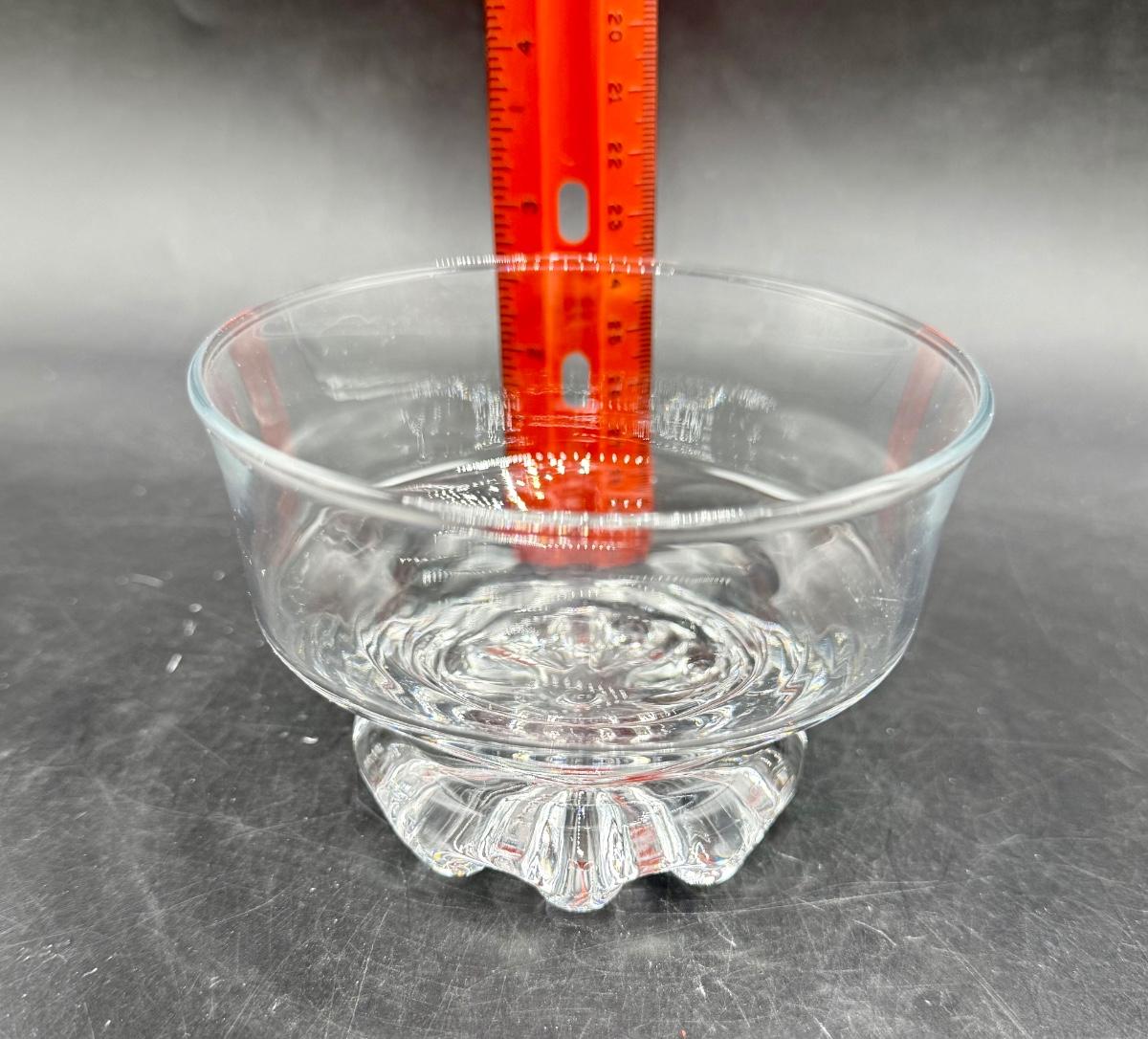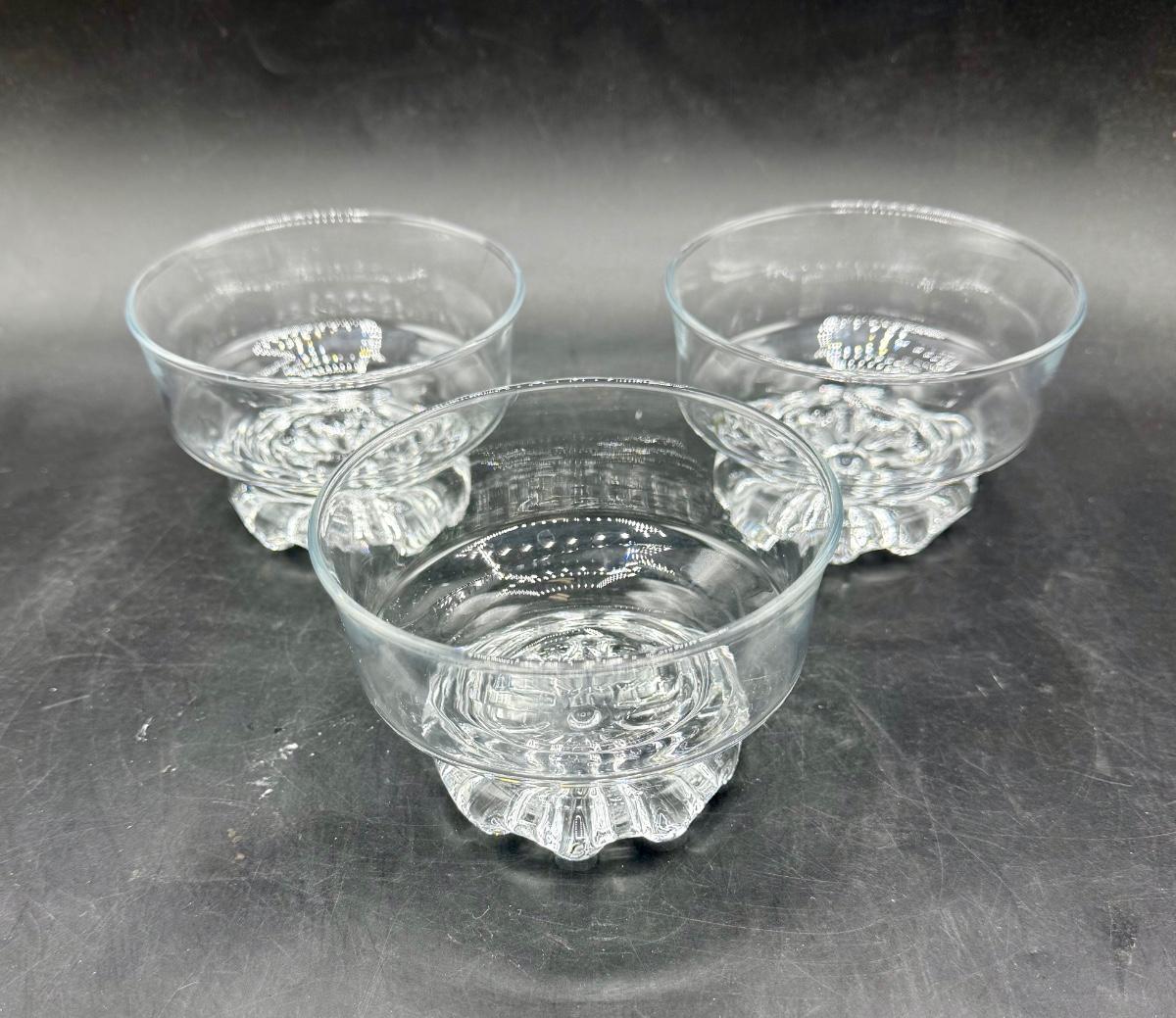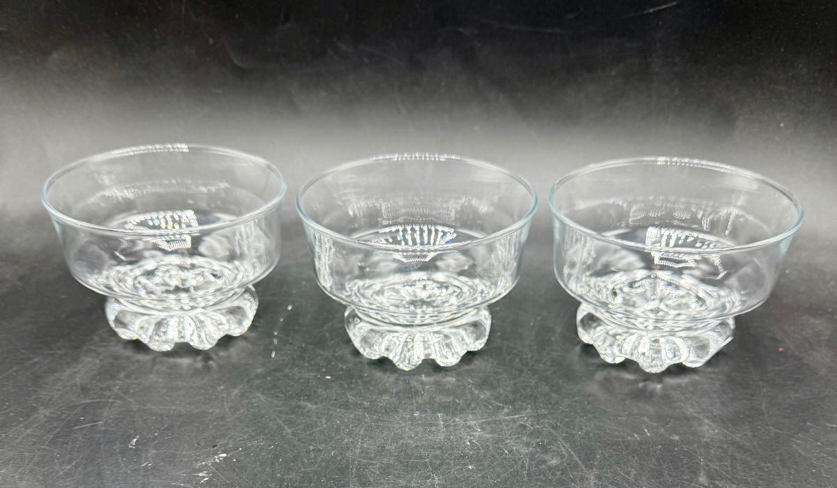 Nice set of footed glass dessert dishes. All in good condition, no chips. Approx. 2.75" high and nearly 4" across.