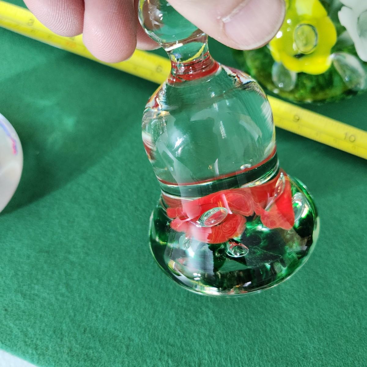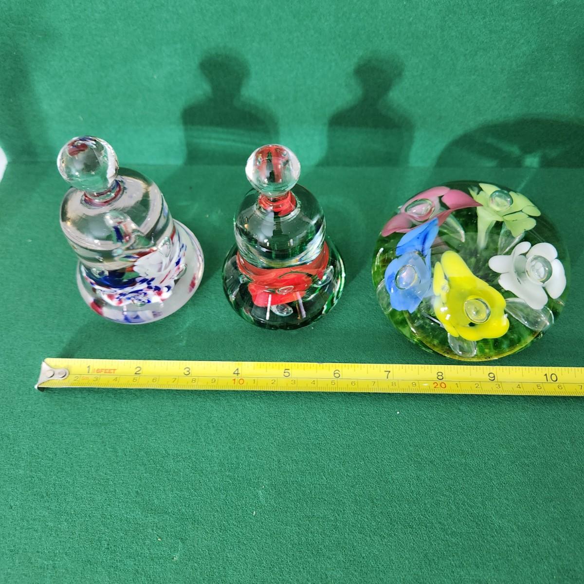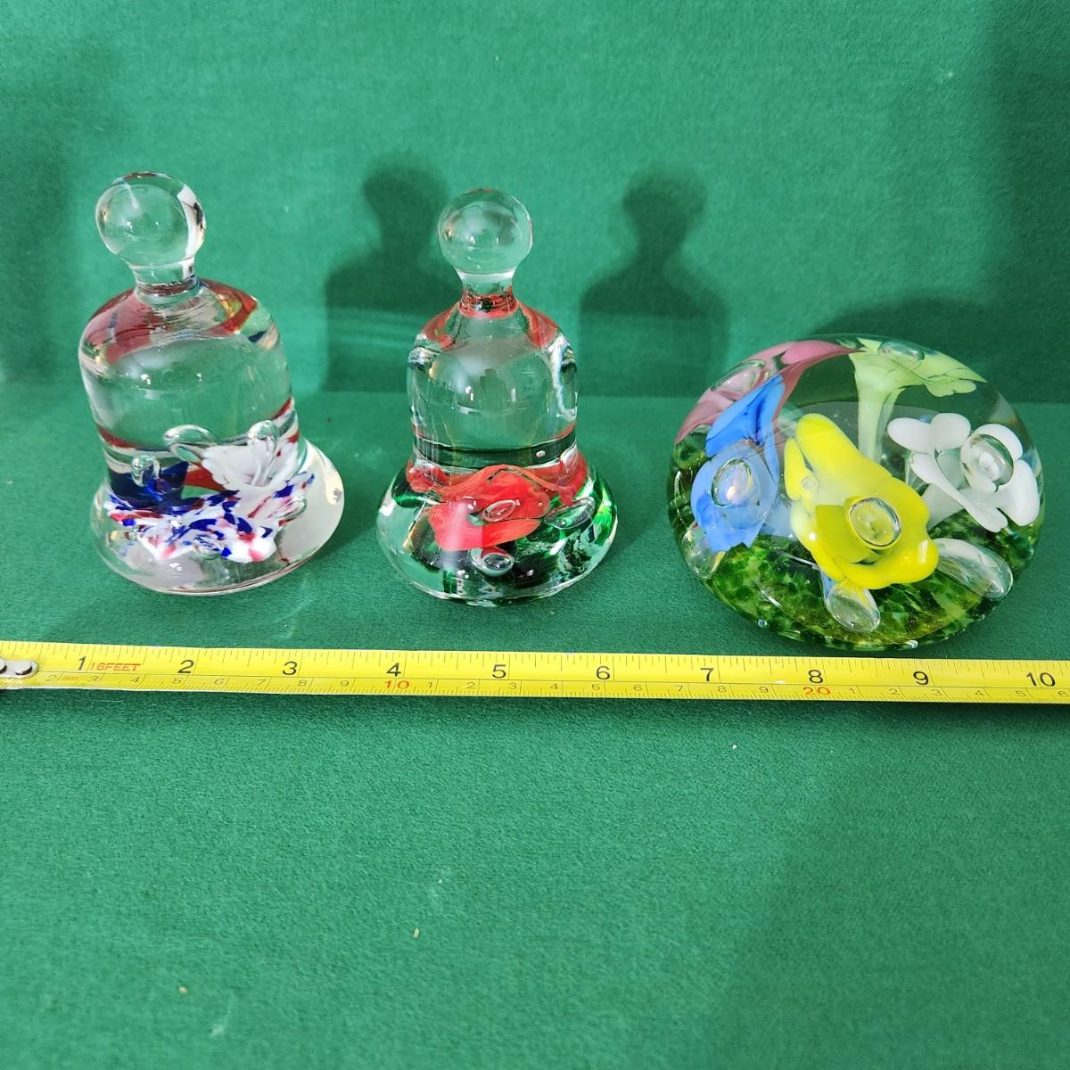 3 Vintage Joe St. Clair Art Glass Flowers Bells & Paperweight