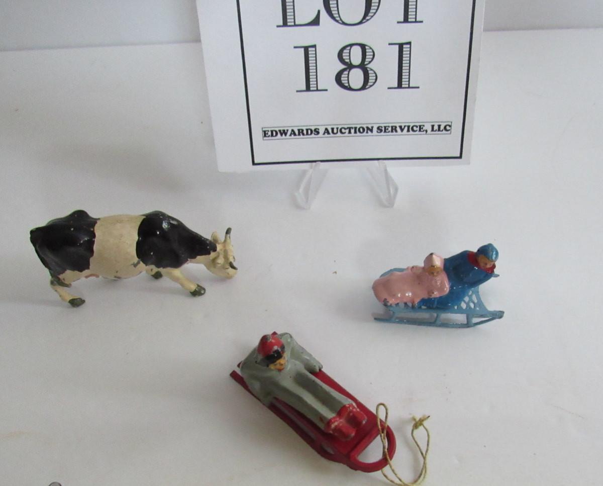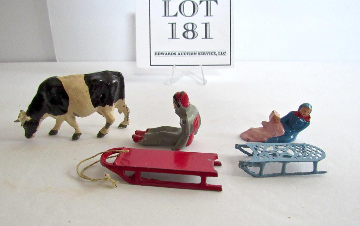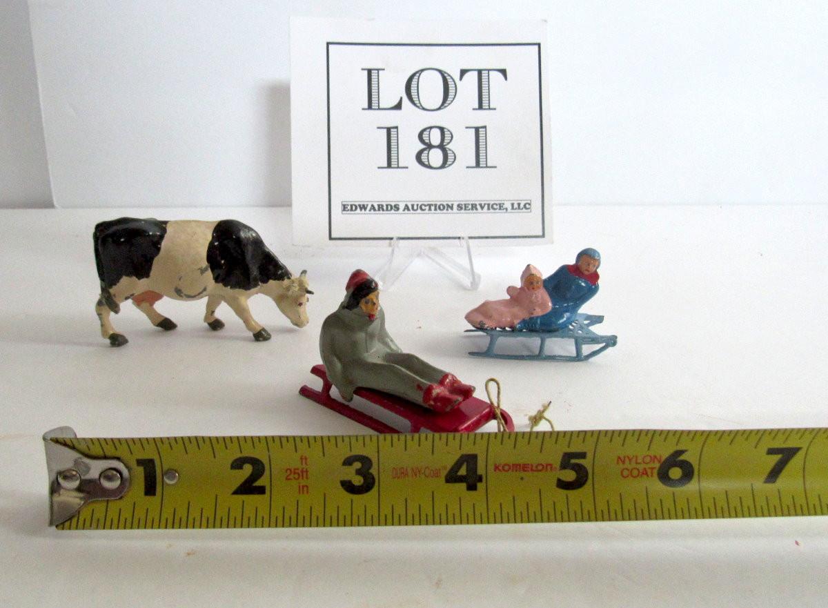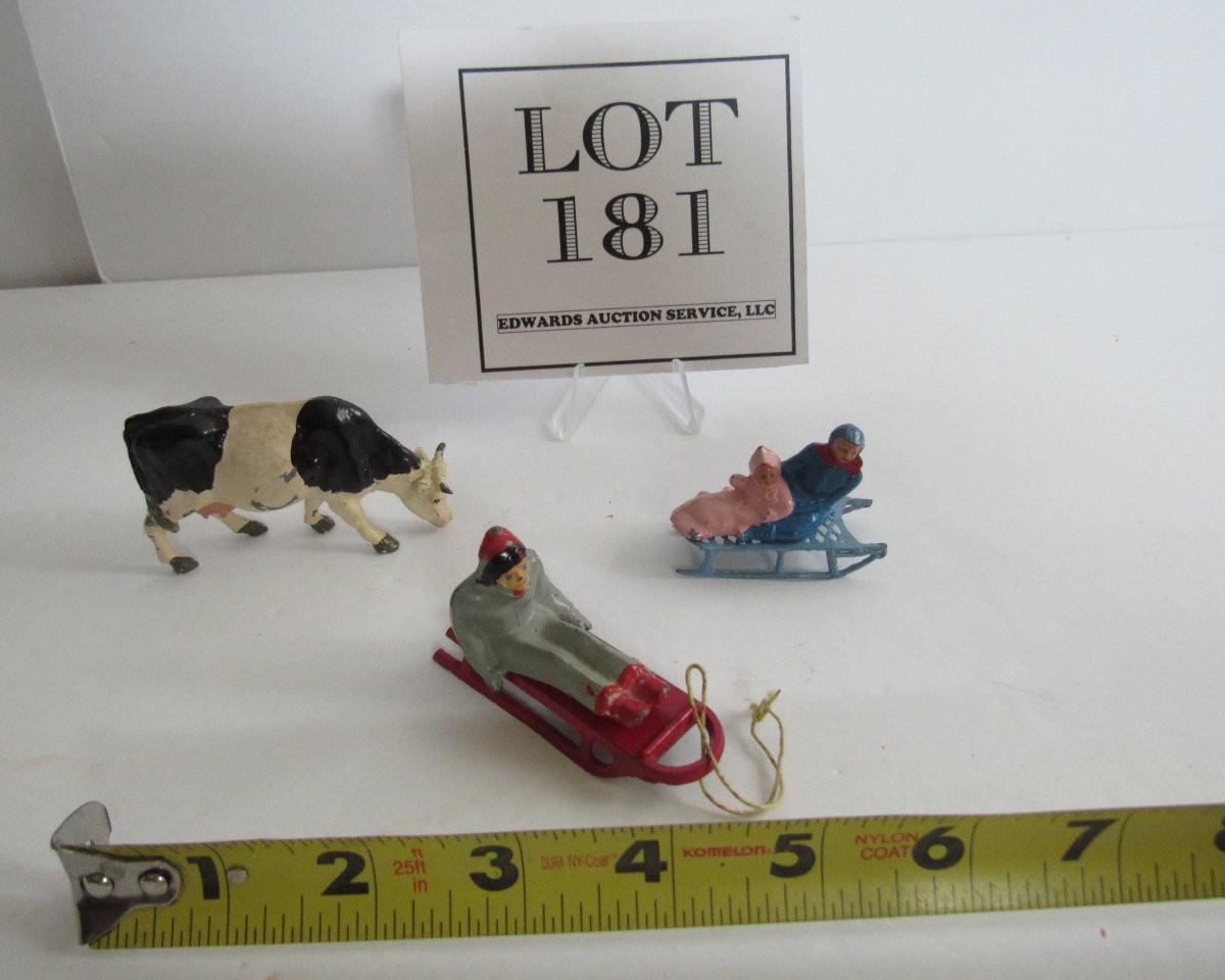 3 Vintage Lead Christmas Figures, People on Sleds, Cow