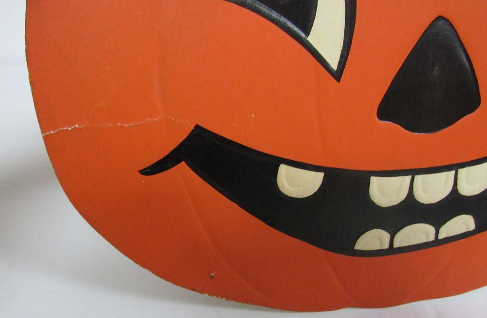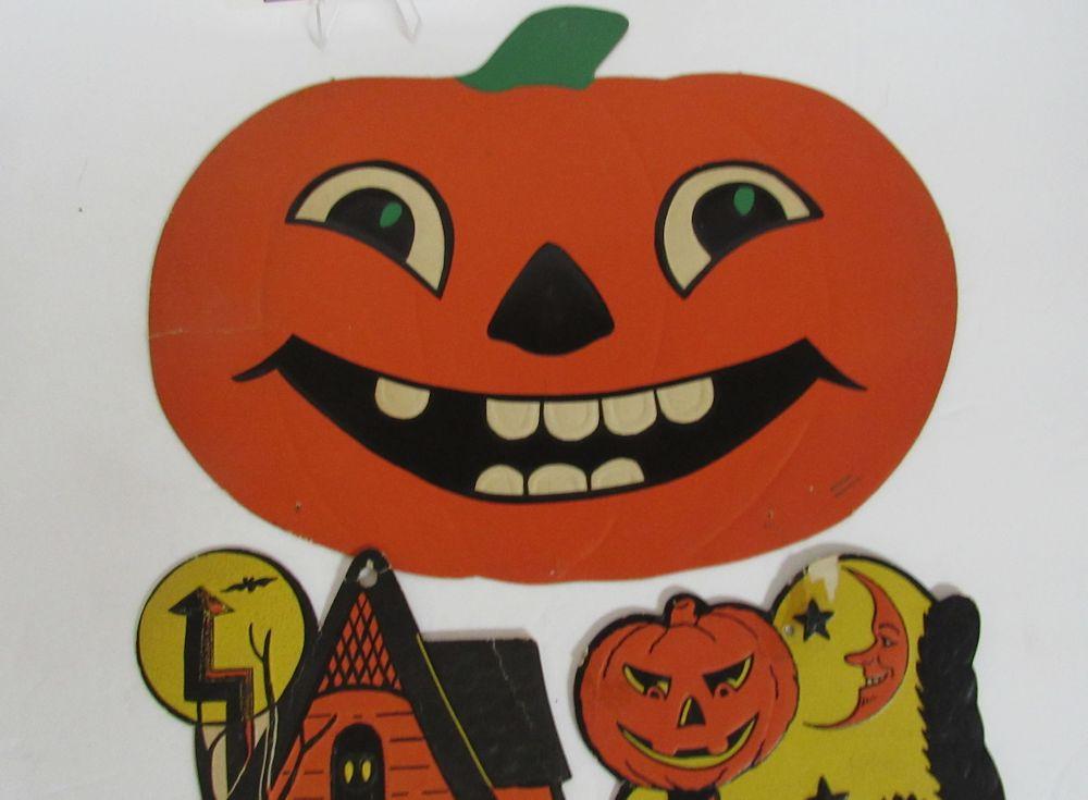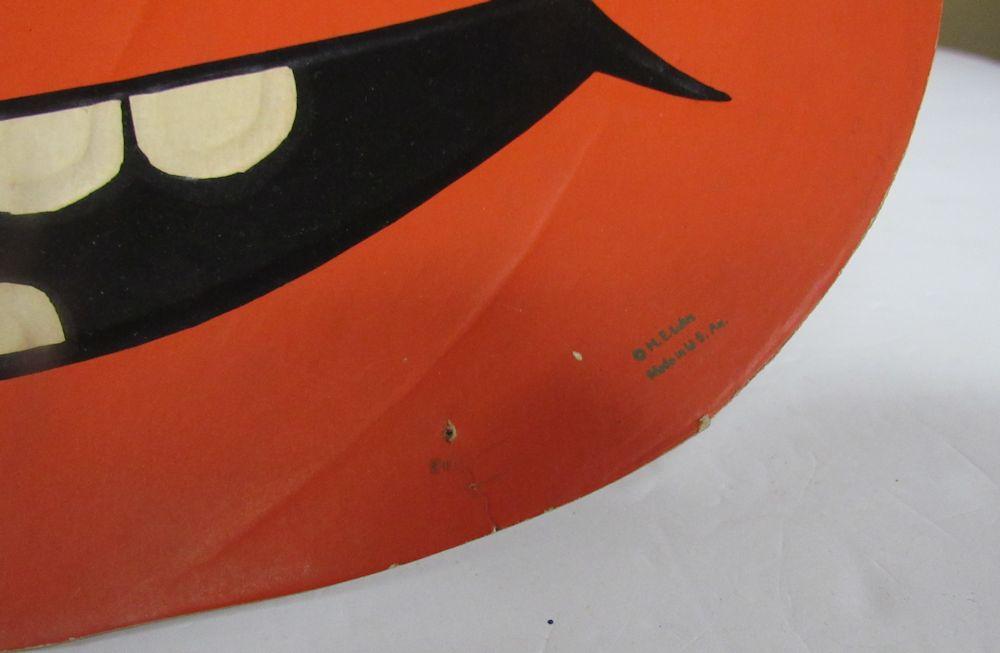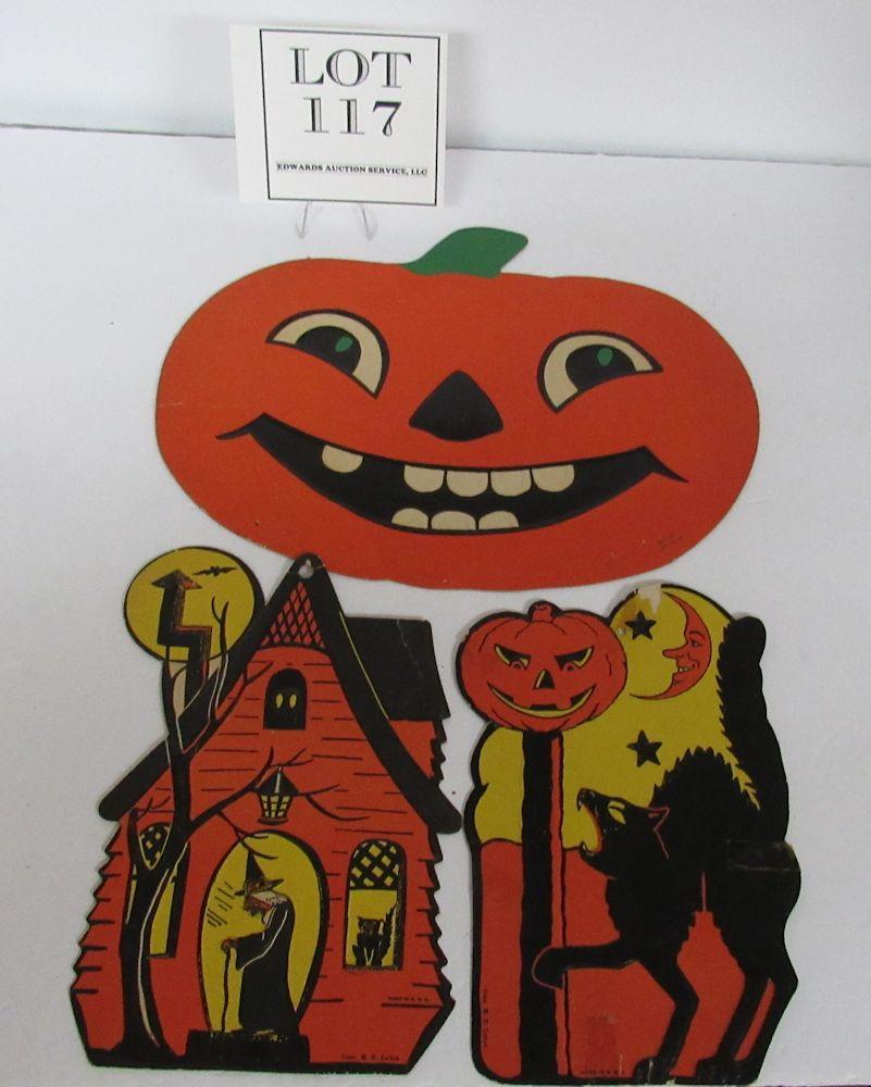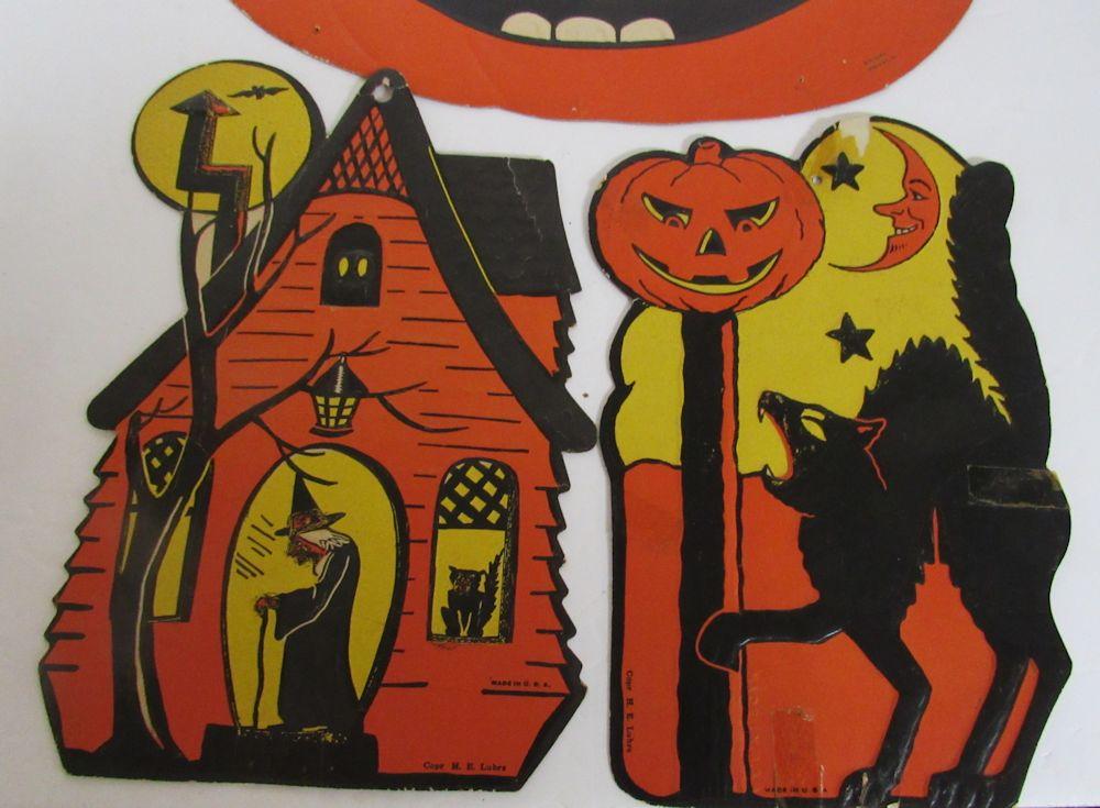 The Jack-o-lantern has a slight bend on one side as seen in magnified photo, some minor wear and pin holes, the house has minor wear and a slight bend on the roof, the cat has some paper loss, tape throughout and minor bends, etc. See all photos. Shipping is available at shipping cost plus $5.00 handling fee on up to 8 lots, $10.00 handling fee on 9 or more lots or two boxes.