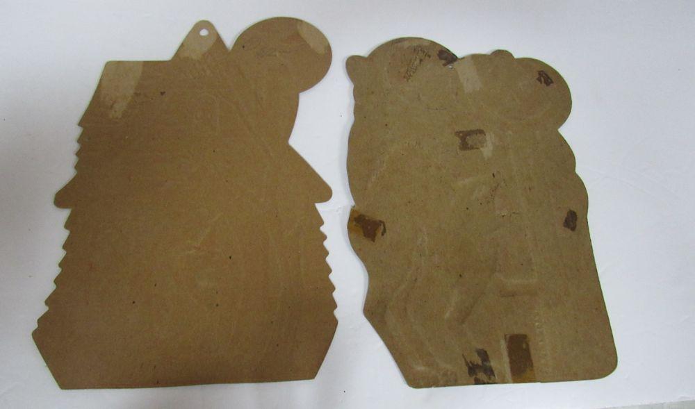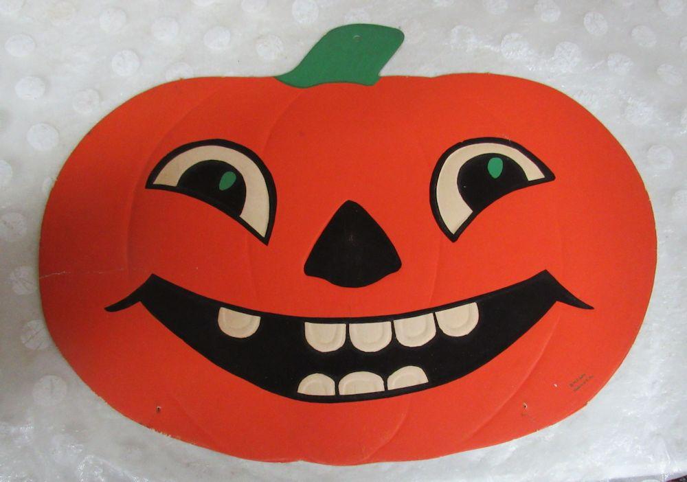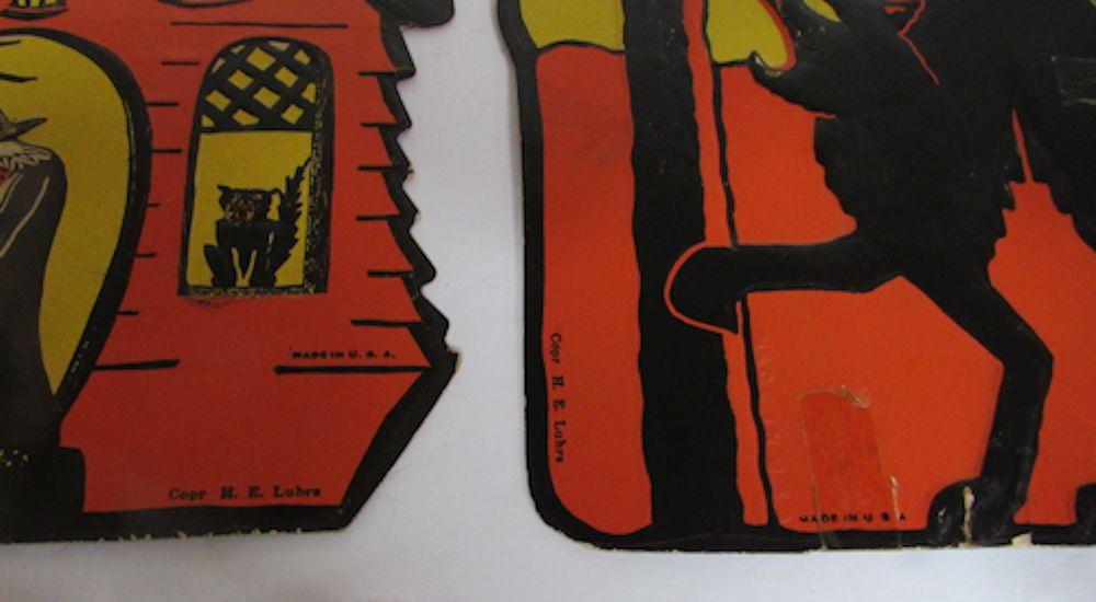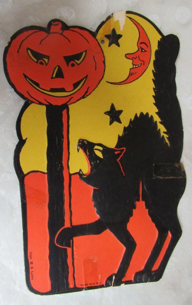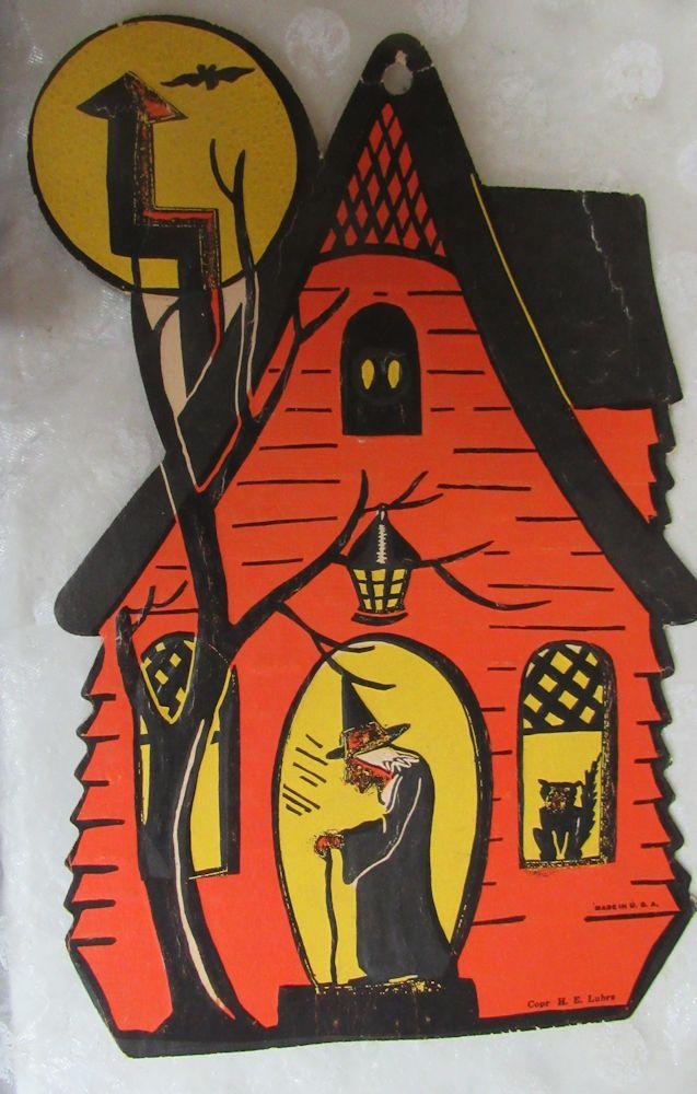 The Jack-o-lantern has a slight bend on one side as seen in magnified photo, some minor wear and pin holes, the house has minor wear and a slight bend on the roof, the cat has some paper loss, tape throughout and minor bends, etc. See all photos. Shipping is available at shipping cost plus $5.00 handling fee on up to 8 lots, $10.00 handling fee on 9 or more lots or two boxes.