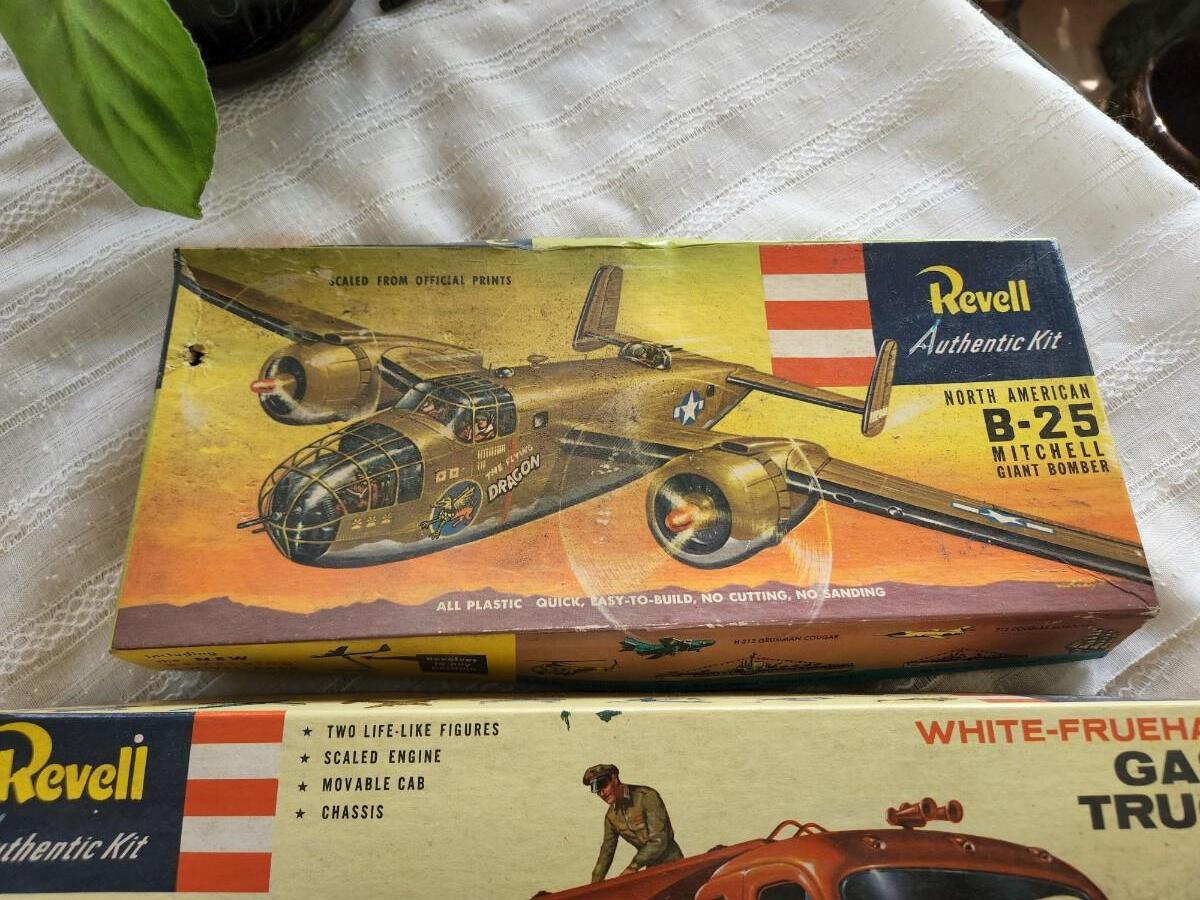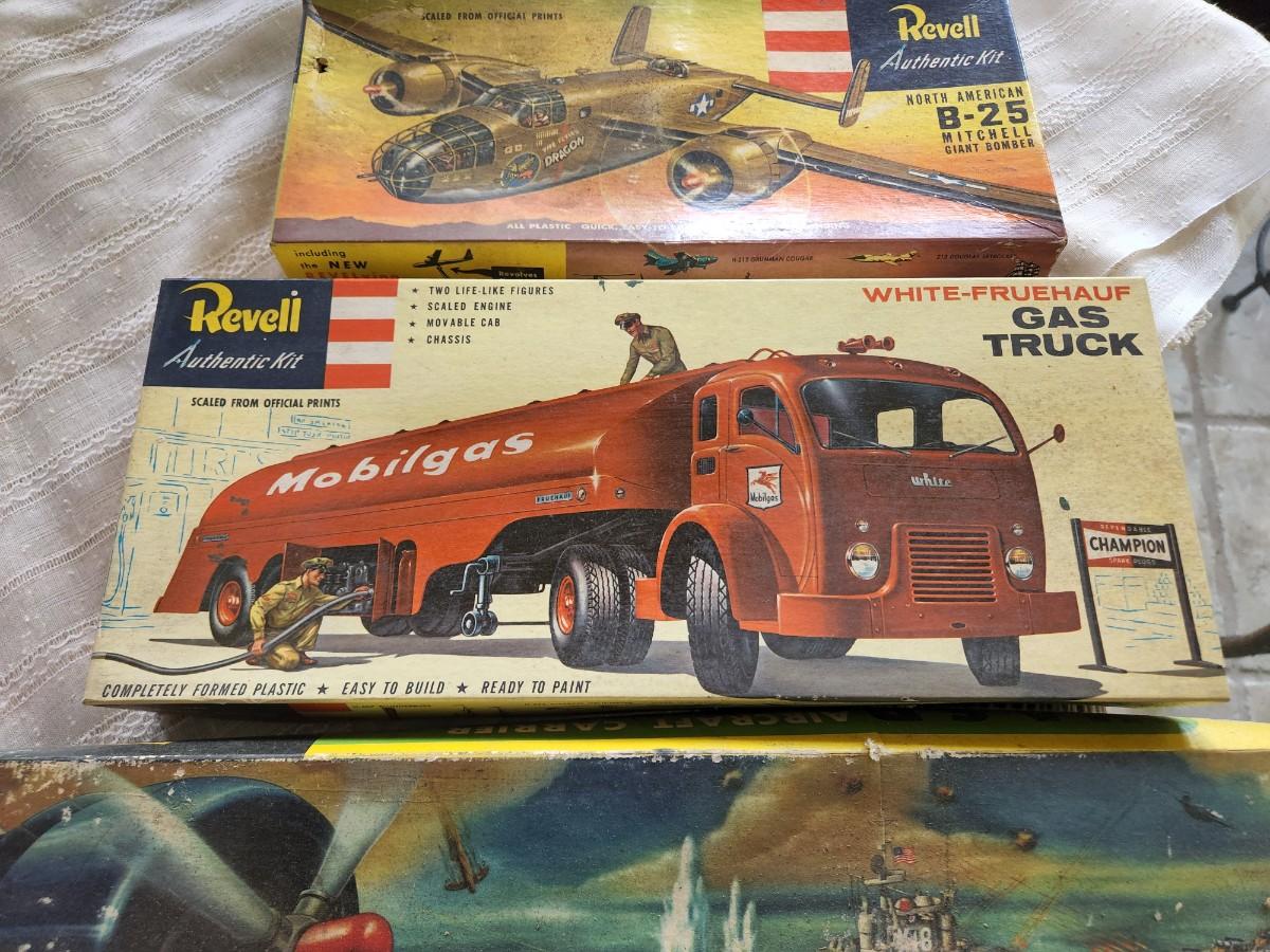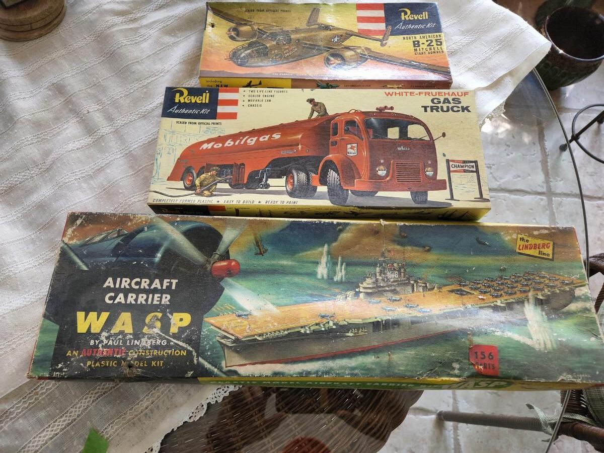 3 Vintage Model Kits Revell B-25 Mobilgas Gas Truck, Aircraft Carrier Wasp