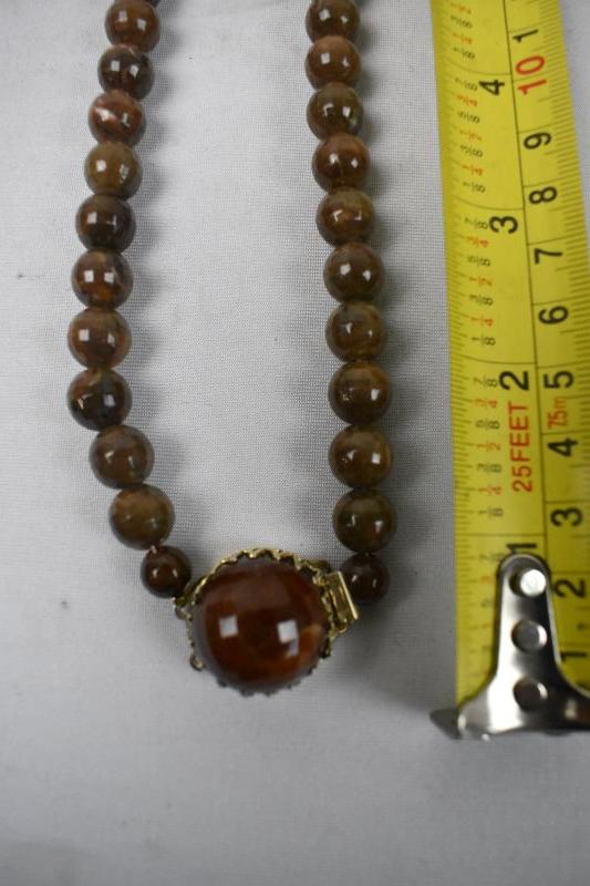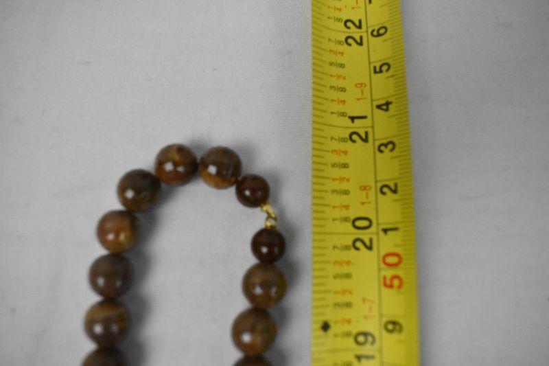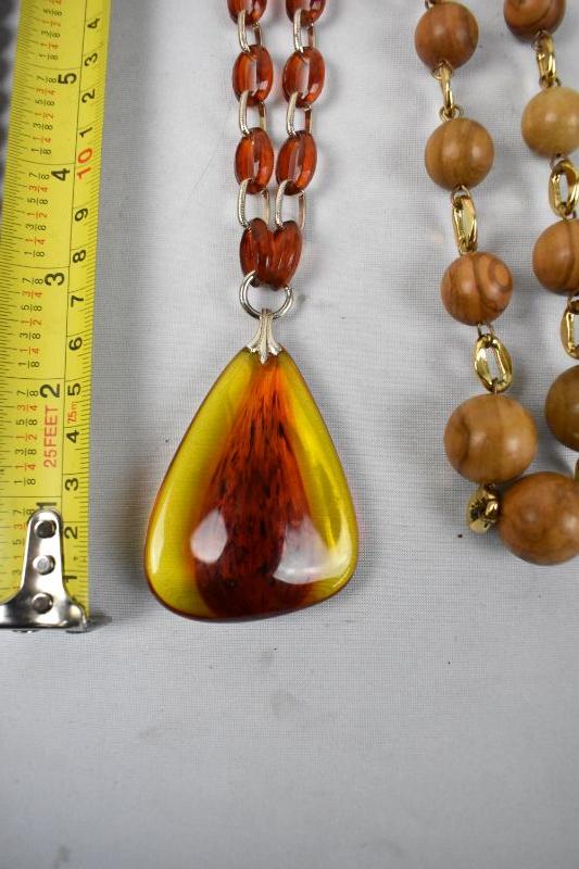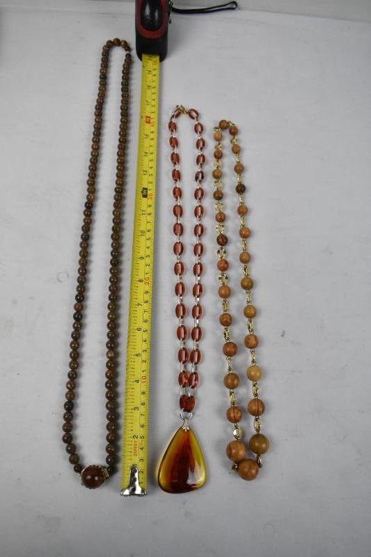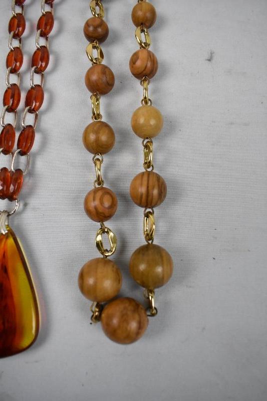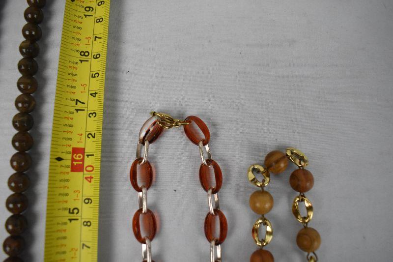 3 Vintage Necklaces: Brown Beaded, Orange Linked, Wood Linked