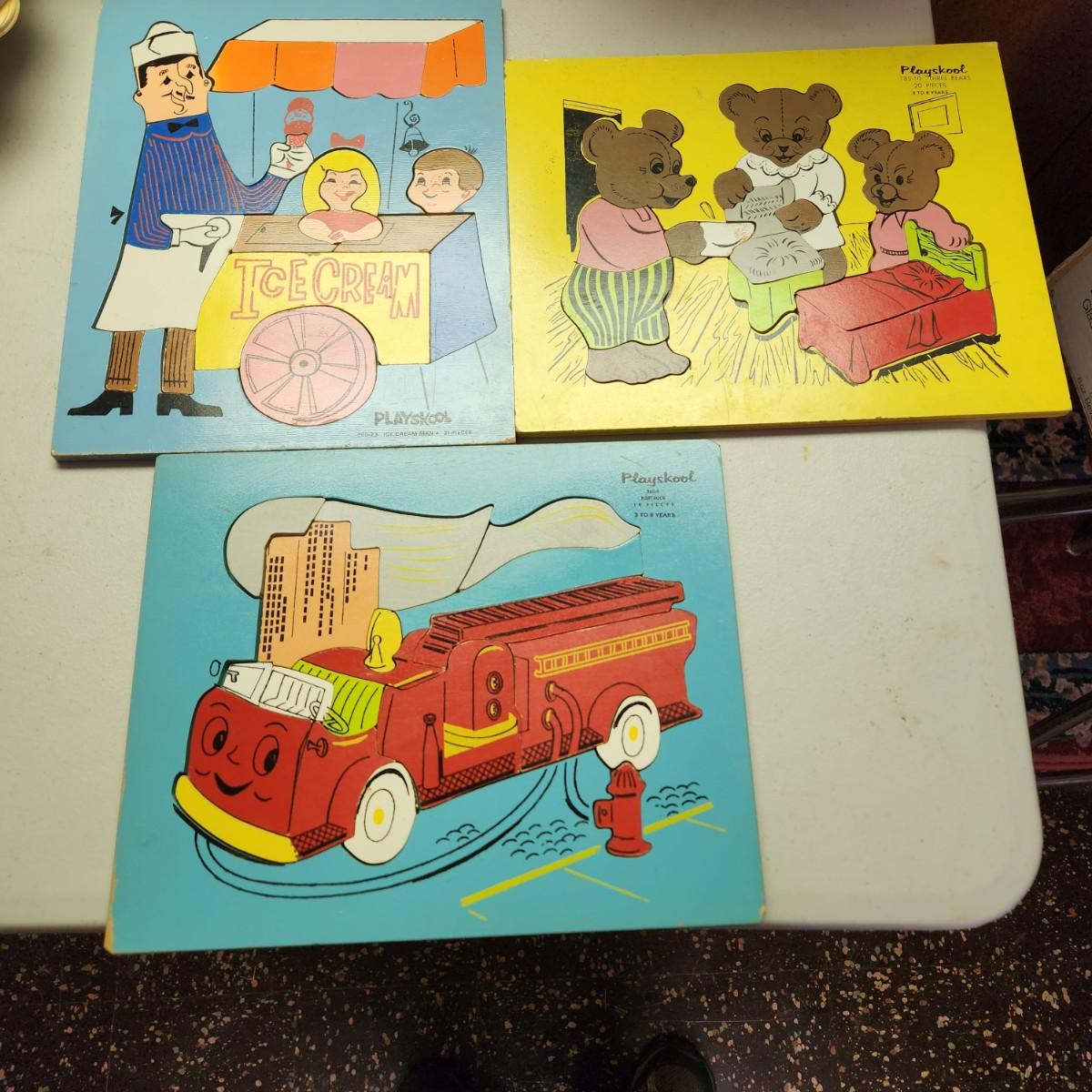 3 Vintage Playskool Block Puzzles   Firetruck Ice Cream 3 Bears   lot 615