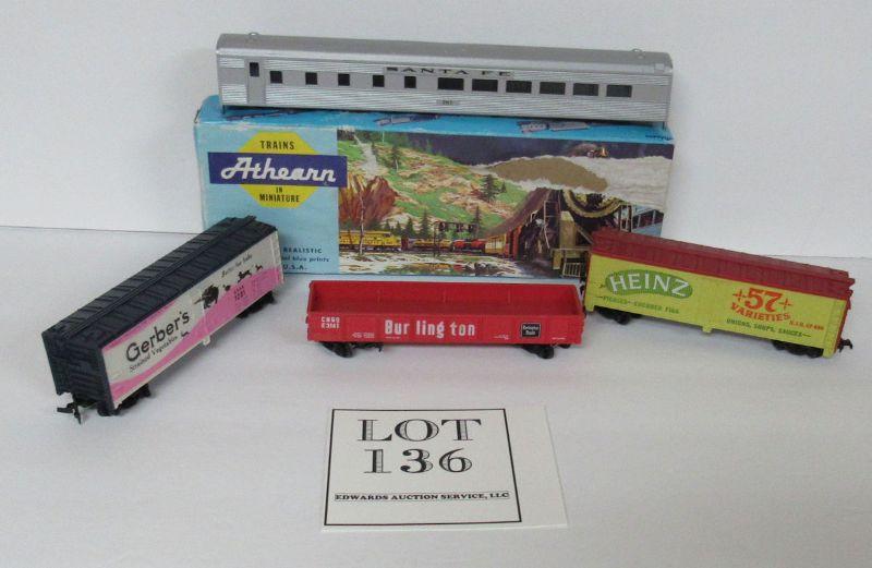 3 Vintage Train Cars & Plastic Athearn Train Model