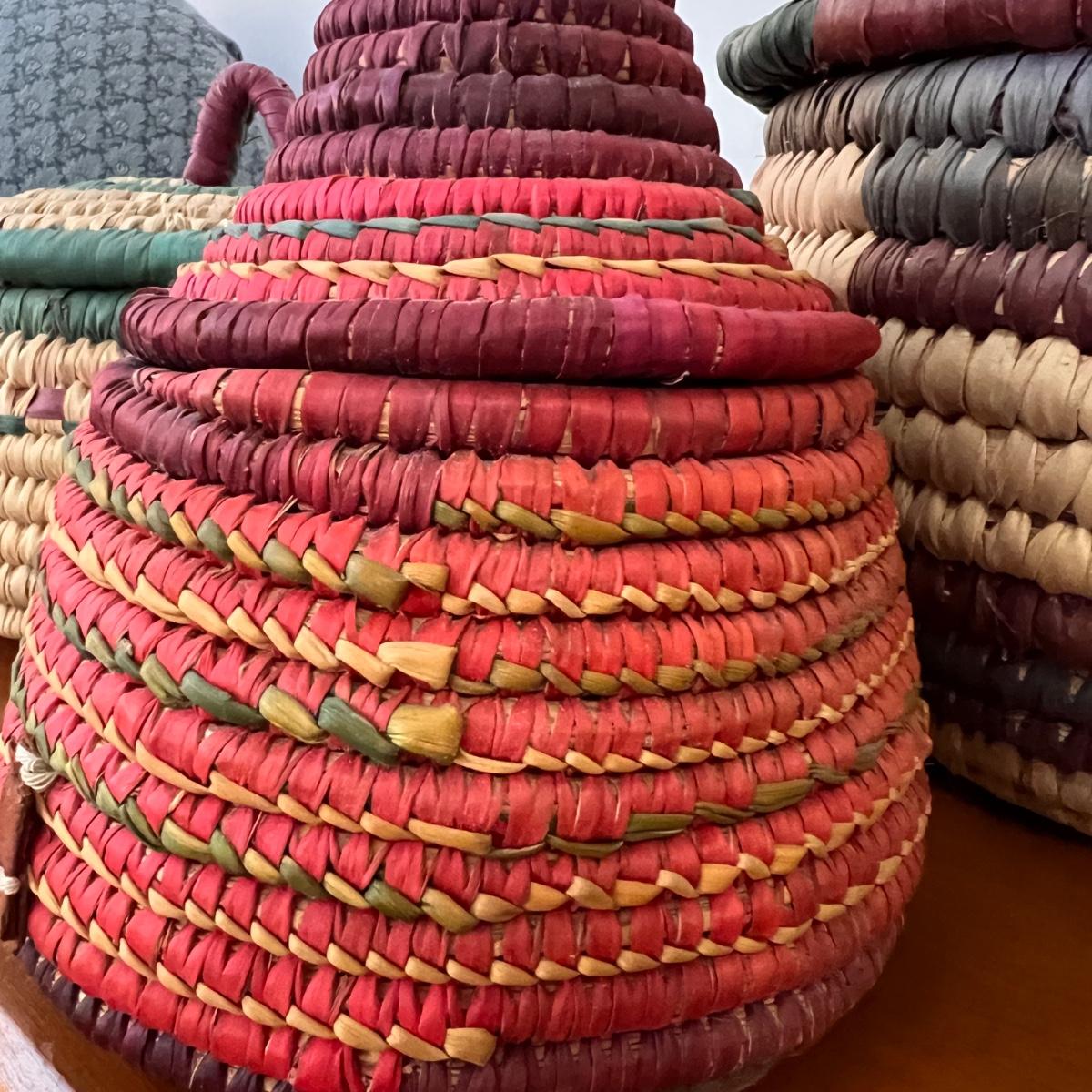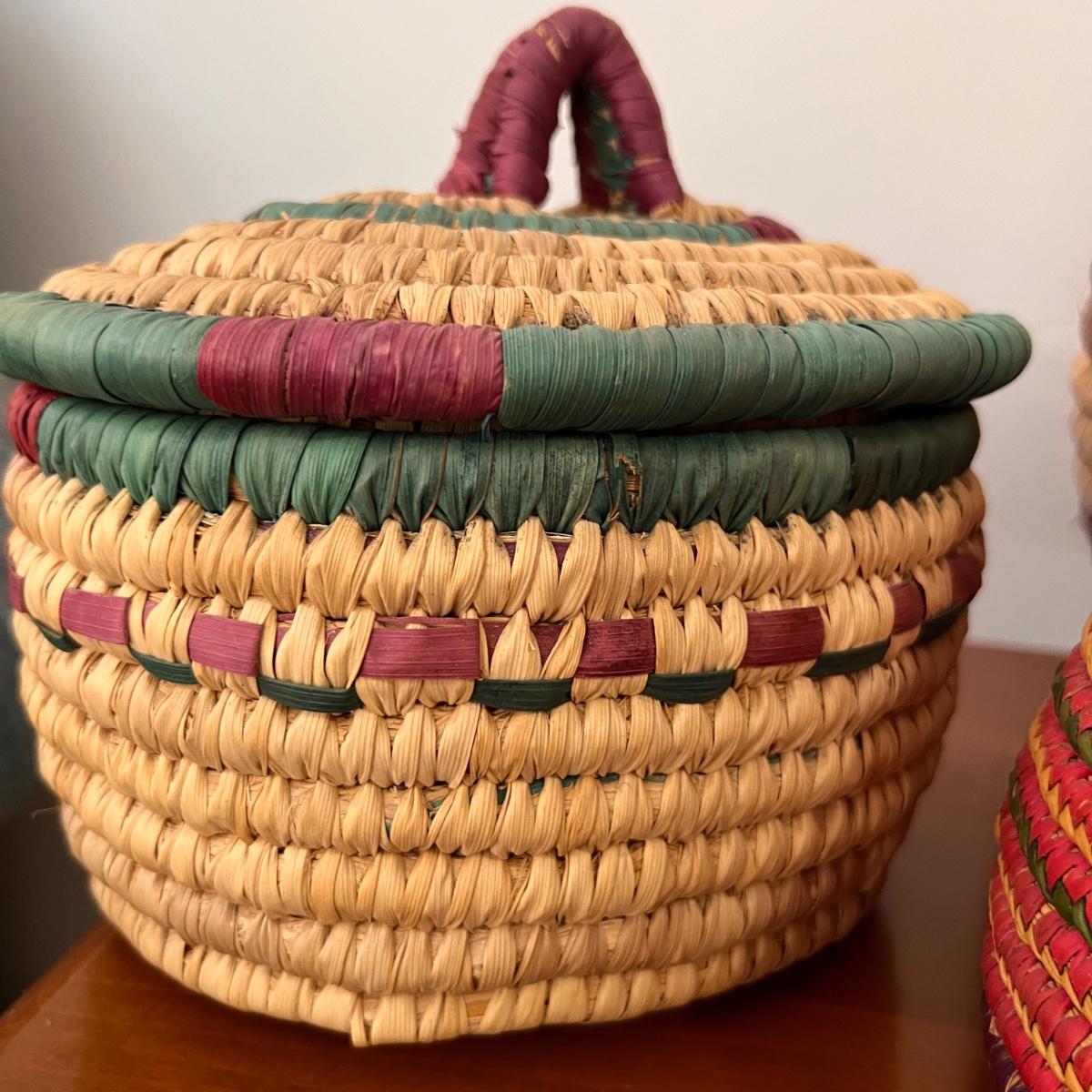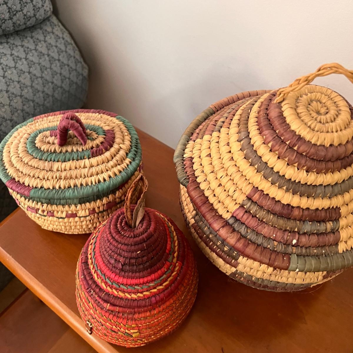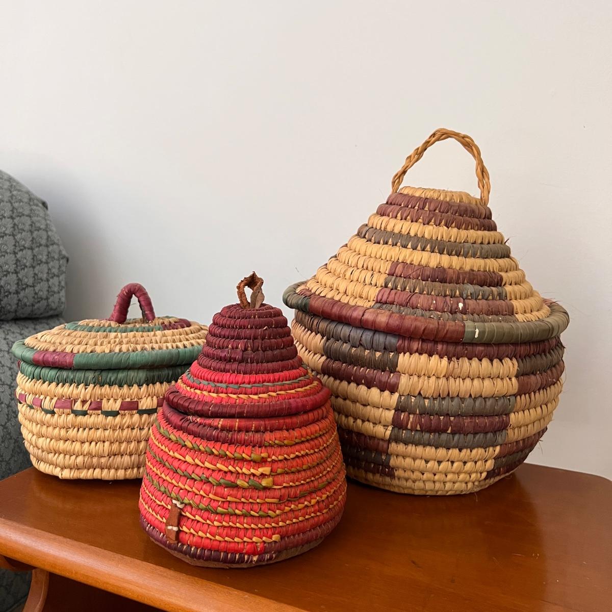 3 beautiful tightly woven baskets handmade by Arabian female weavers. Purchased in Abha, Saudi Arabia in the late 1980's in the only market at that time run by women. Made of dyed palm fronds, The red pink one has camel leather bottom. Lids fit snuggly.