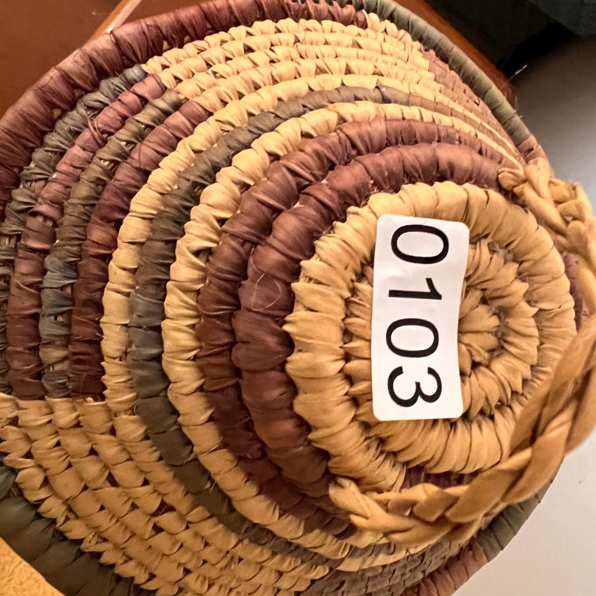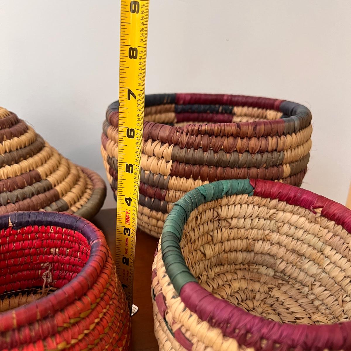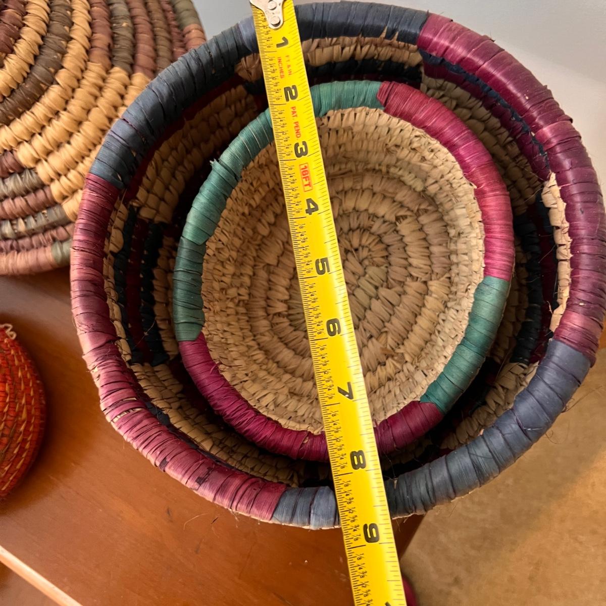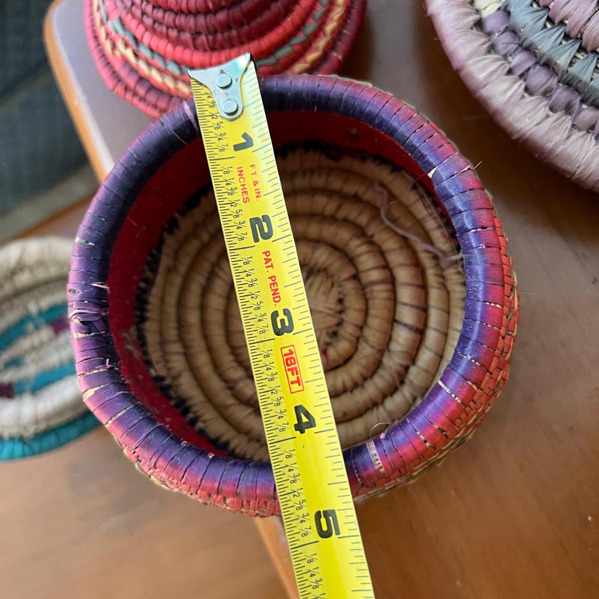 3 beautiful tightly woven baskets handmade by Arabian female weavers. Purchased in Abha, Saudi Arabia in the late 1980's in the only market at that time run by women. Made of dyed palm fronds, The red pink one has camel leather bottom. Lids fit snuggly.