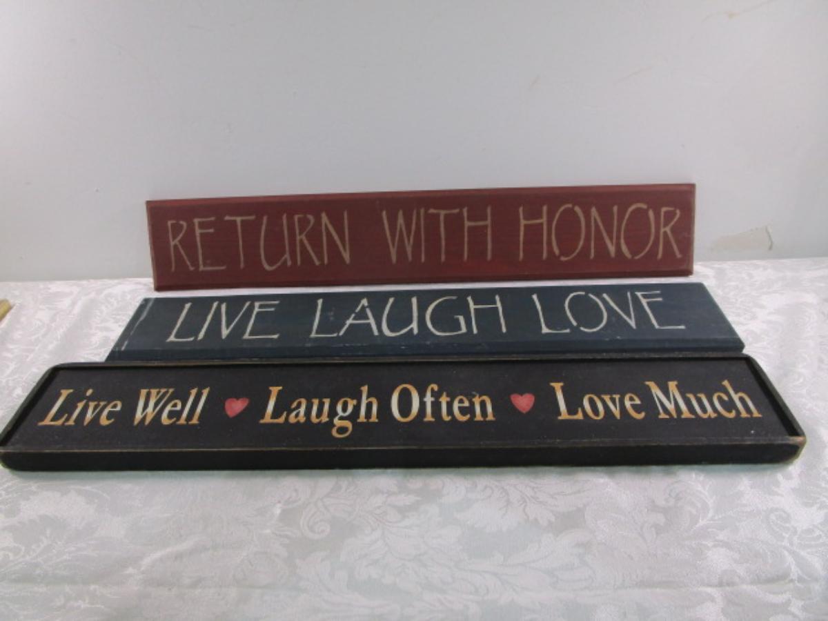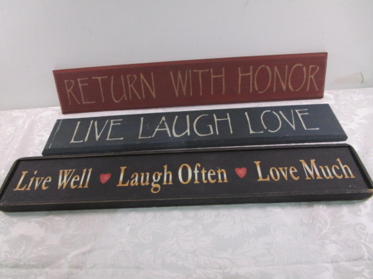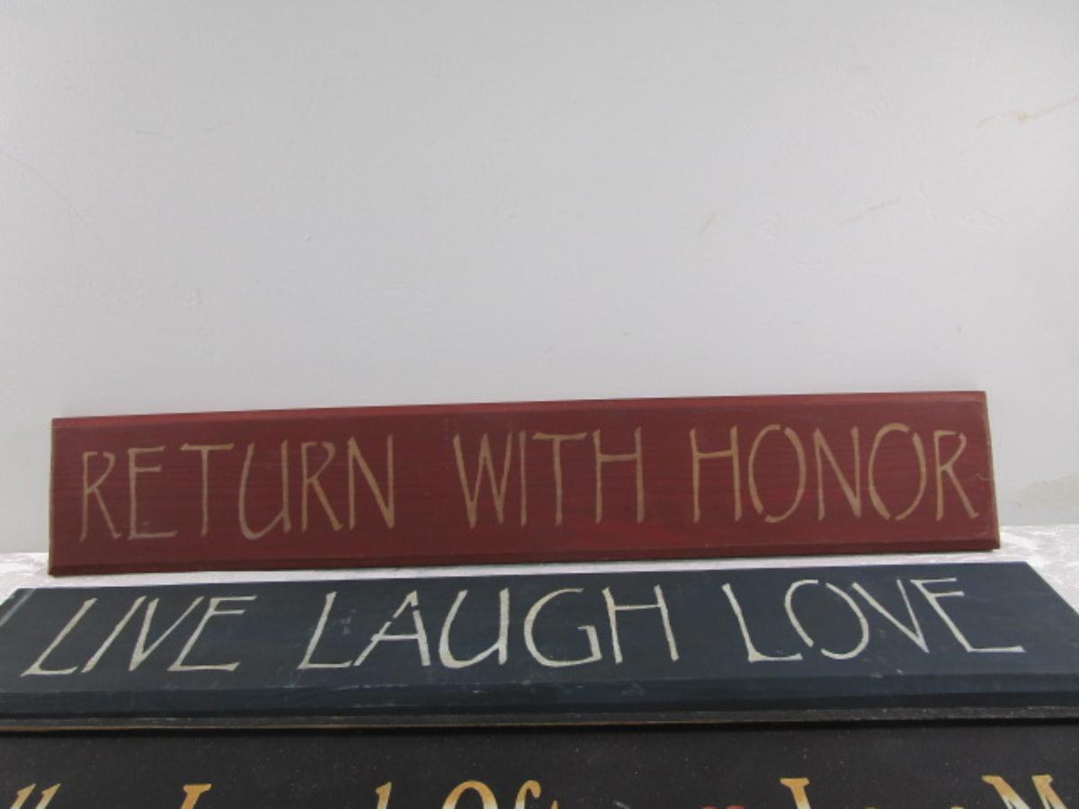 "Return With Honor" 23-7/8" x 4-1/18", "Live, Laugh, Love" 23-7/8" x 4-1/18" "Live Well, Laugh Often, Love Much" is 24-1/2" long x 4-1/8" tall