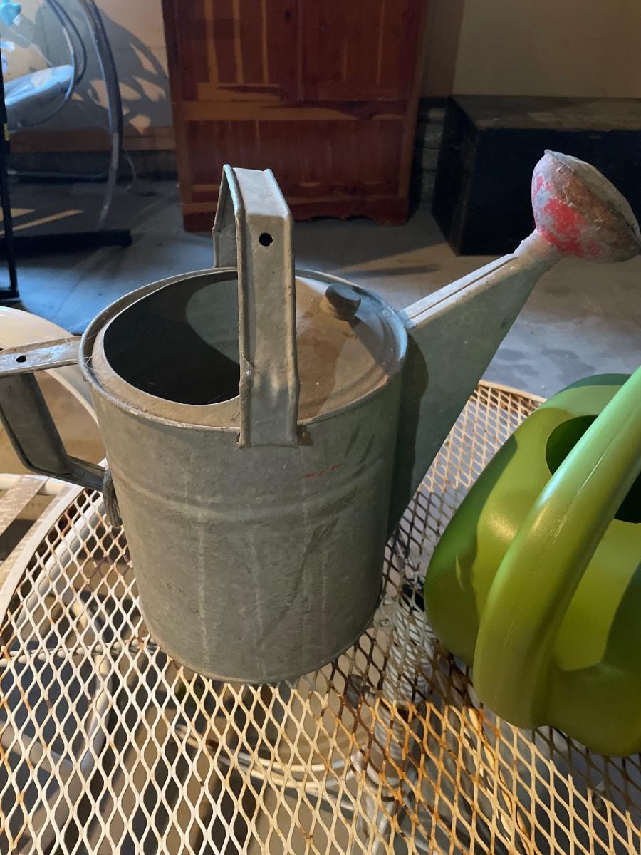 One vintage metal watering can two plastic cans