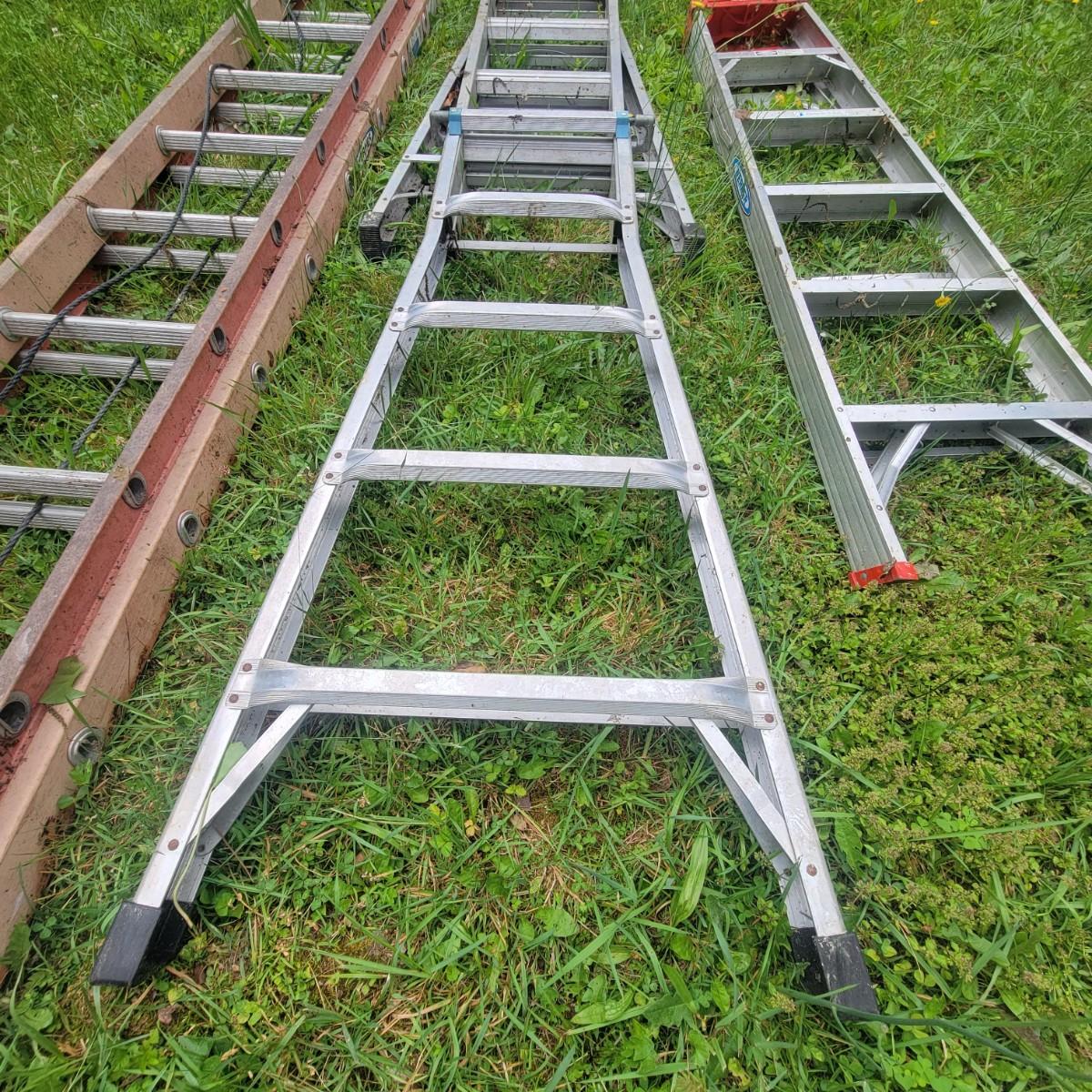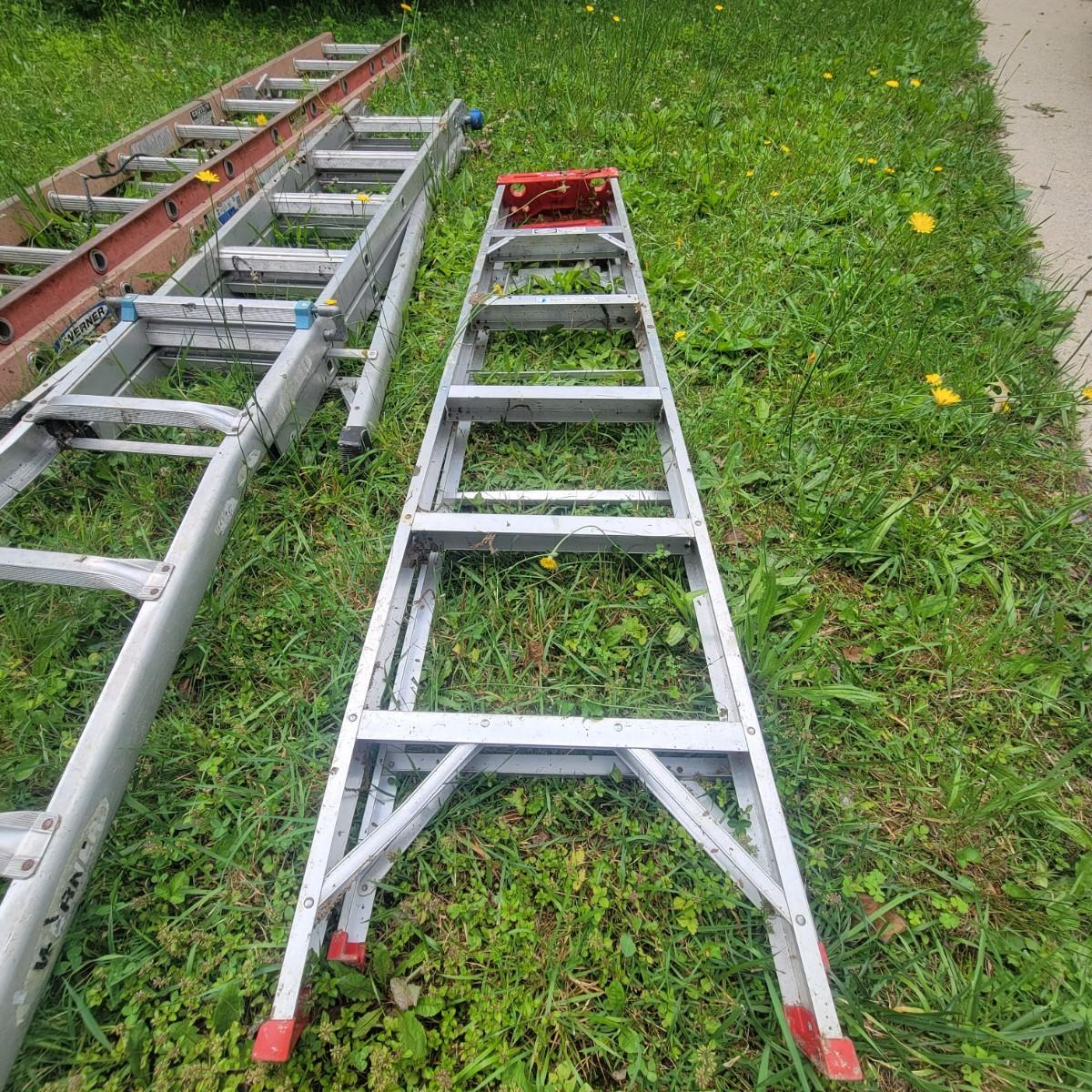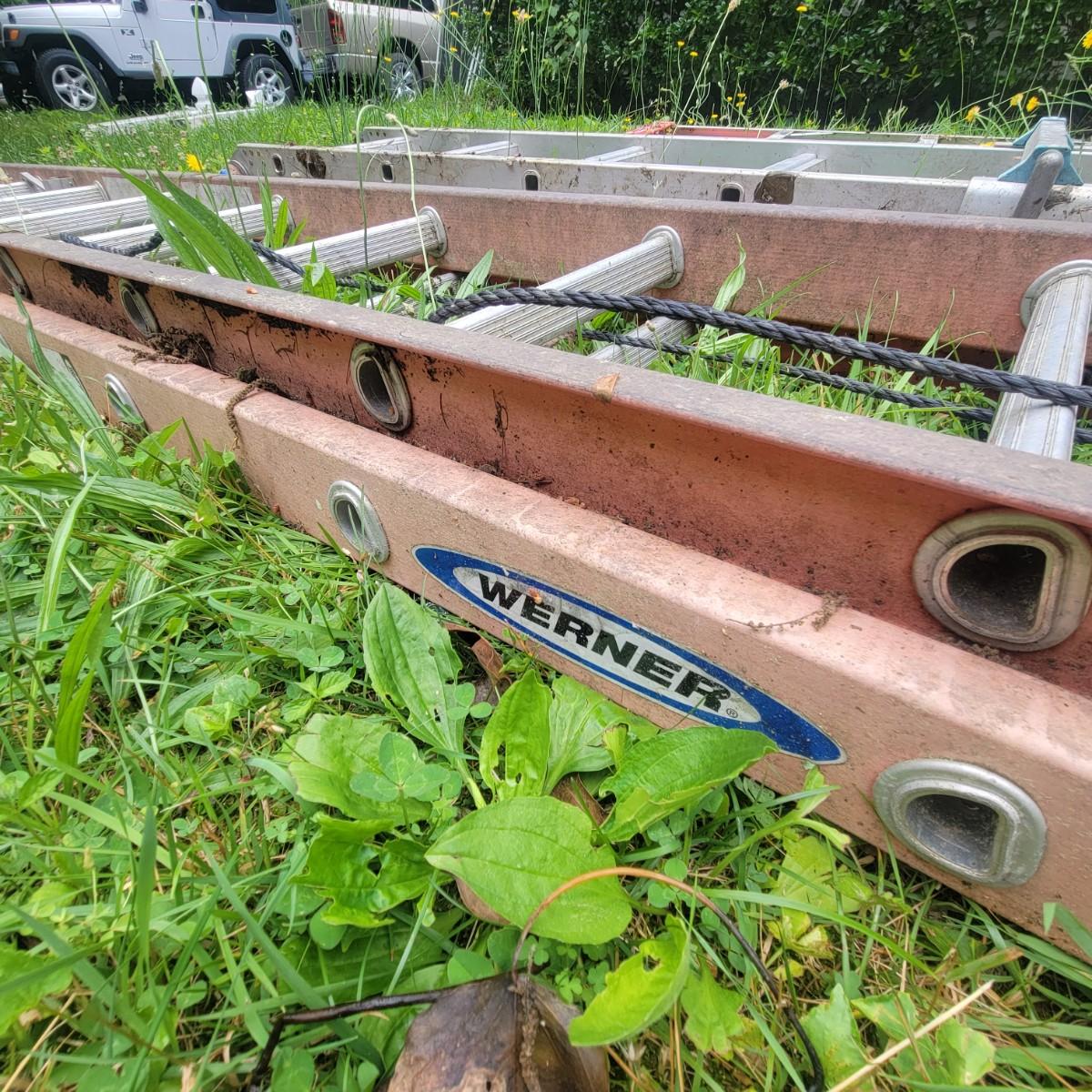 Werner 6' standard aluminum A frame ladder, one leg support has a minor bend in it. See photos. Werner adjustable folding ladder with wide legs. Ladder will adjust from 5.5' to to over 9 feet. Werner fiberglass framed extension ladder. 300lbs ladder that extends to 24' 11". Local pickup only