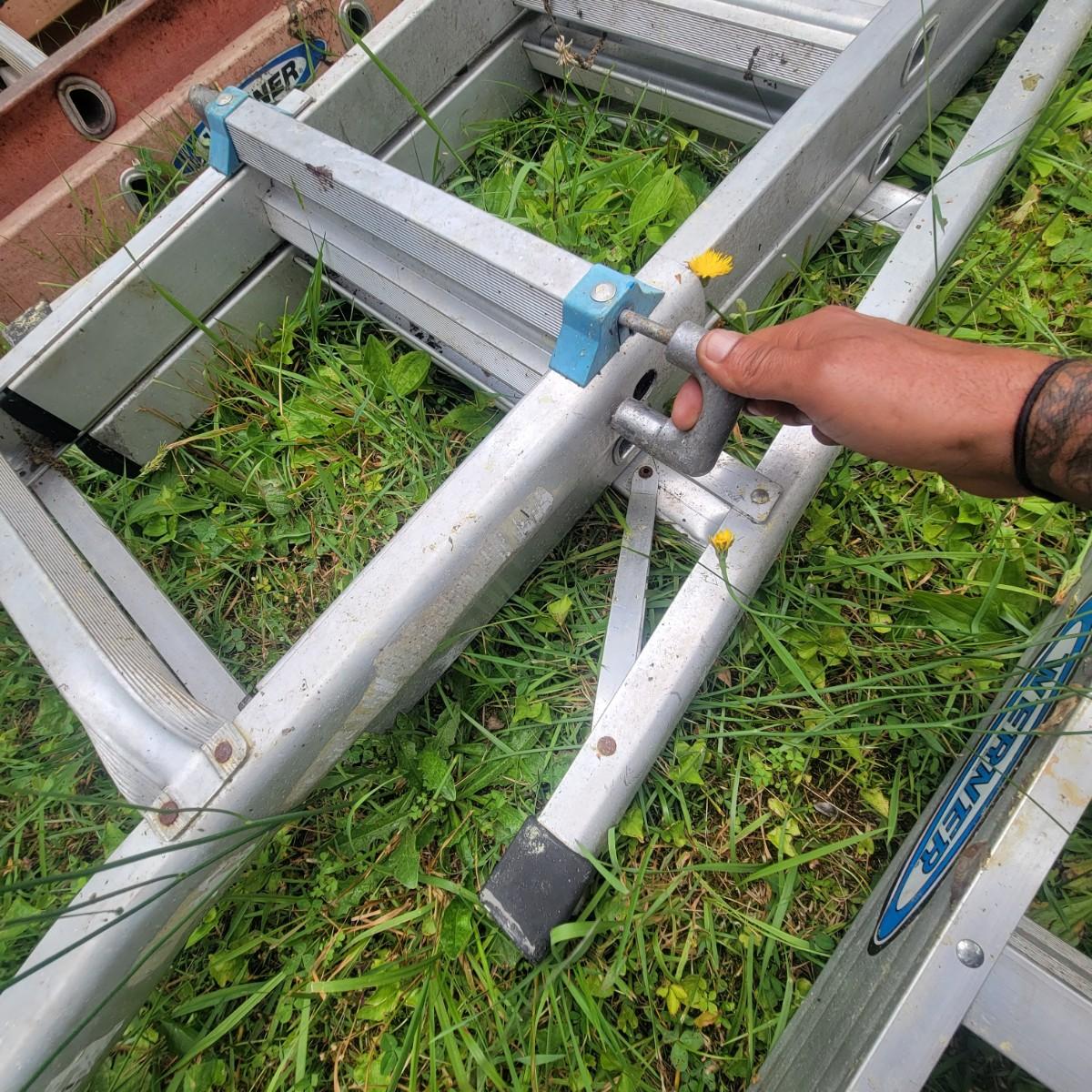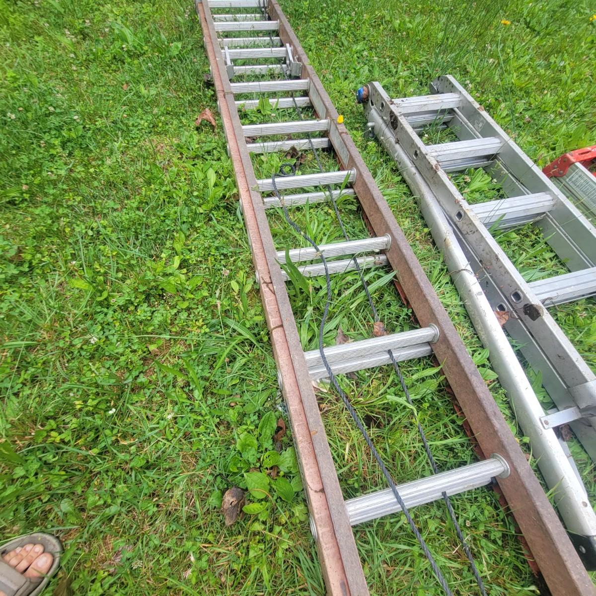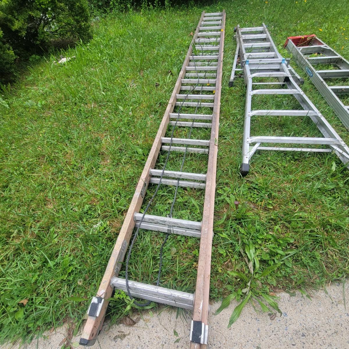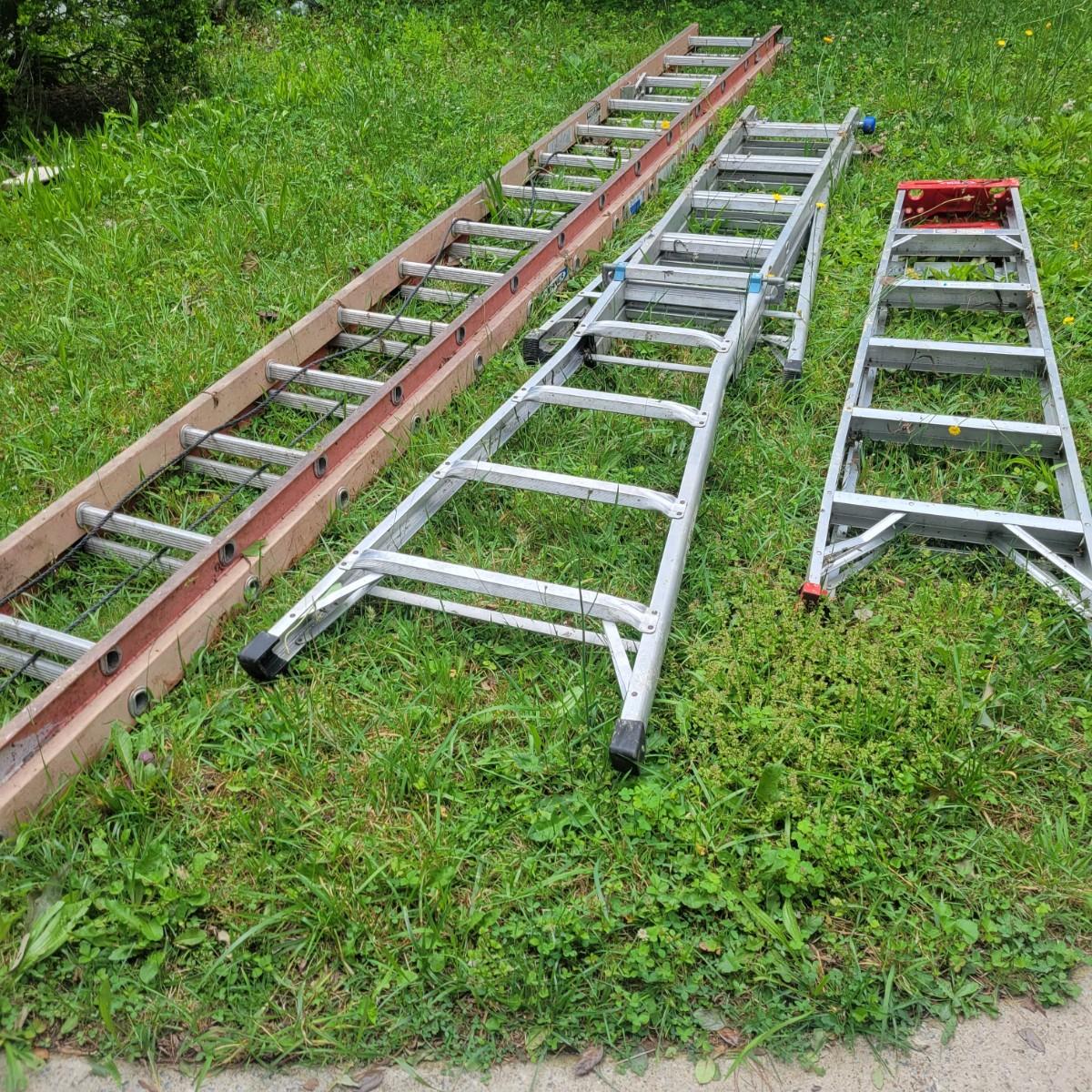 Werner 6' standard aluminum A frame ladder, one leg support has a minor bend in it. See photos. Werner adjustable folding ladder with wide legs. Ladder will adjust from 5.5' to to over 9 feet. Werner fiberglass framed extension ladder. 300lbs ladder that extends to 24' 11". Local pickup only