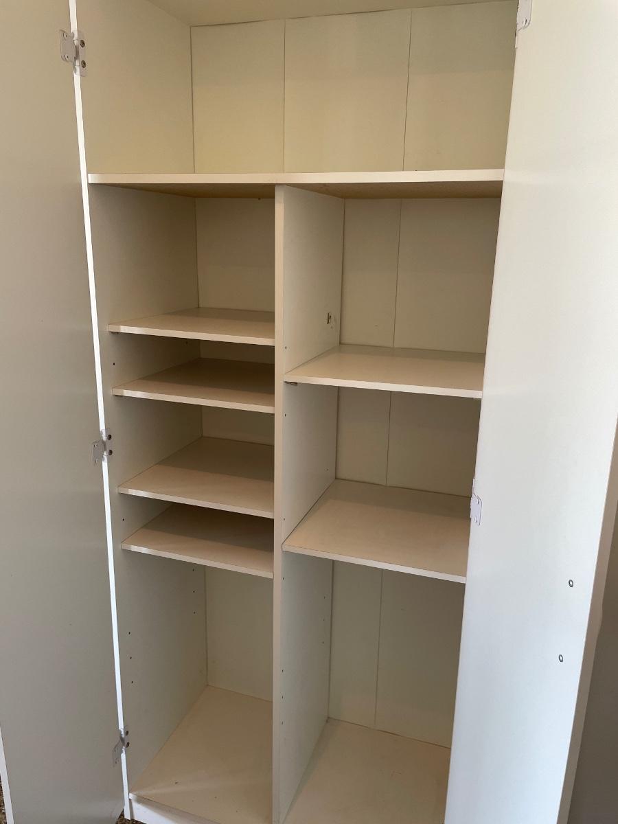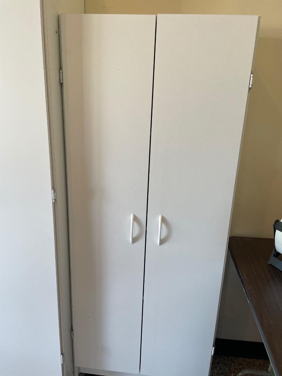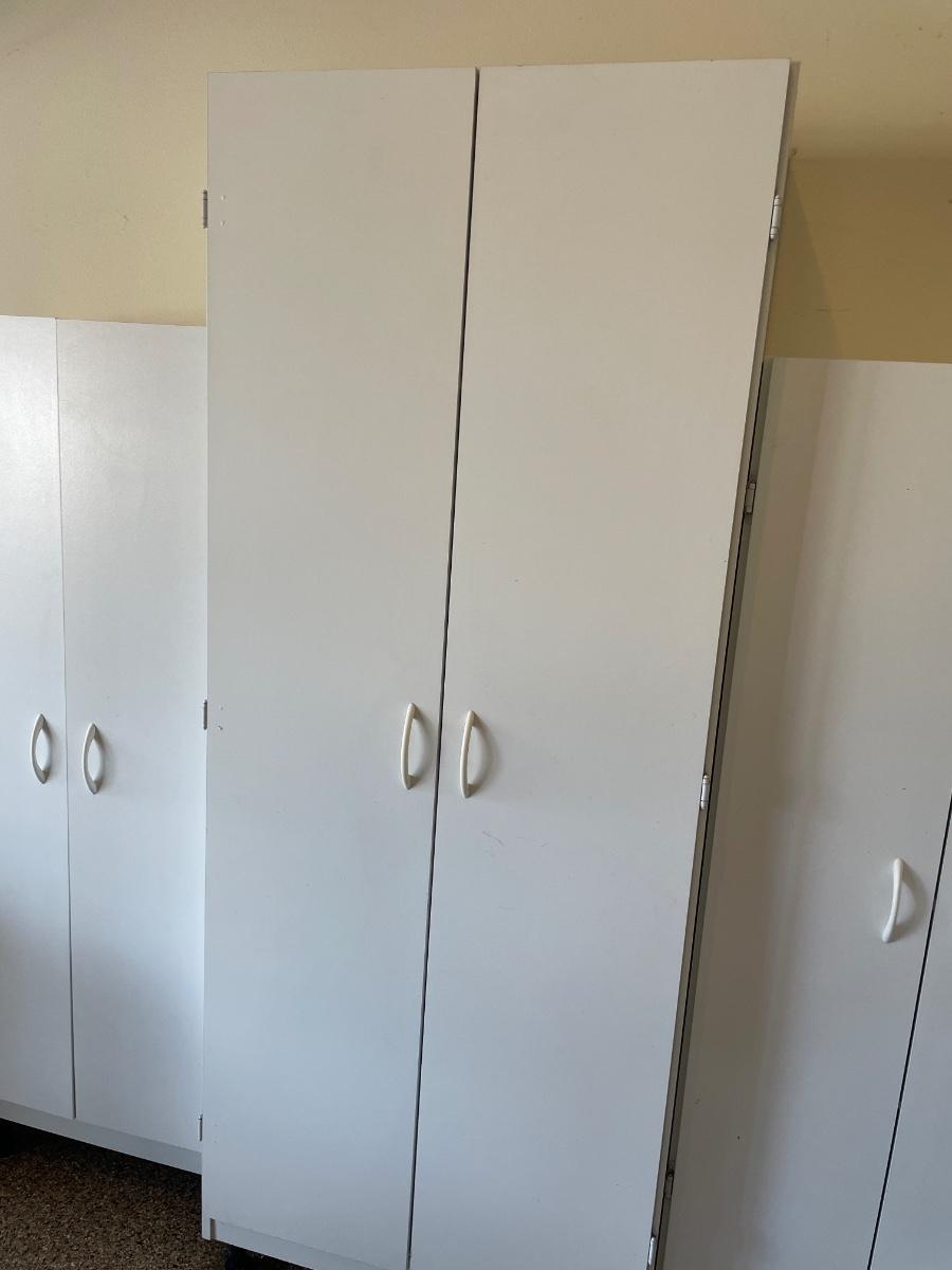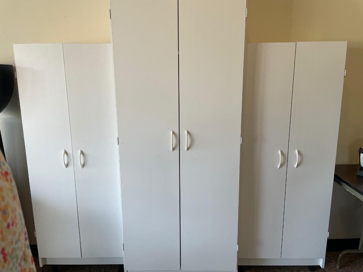 3 white storage cabinets