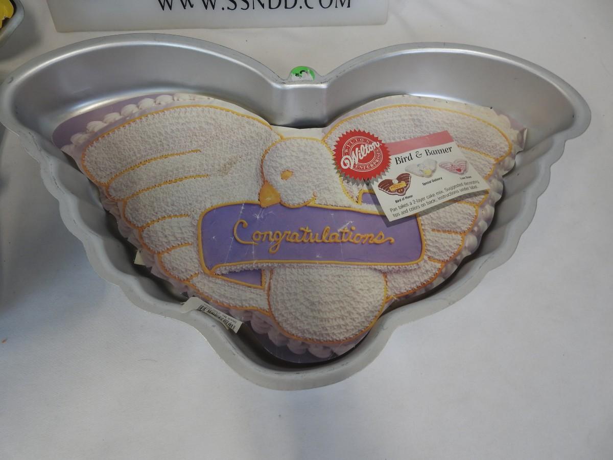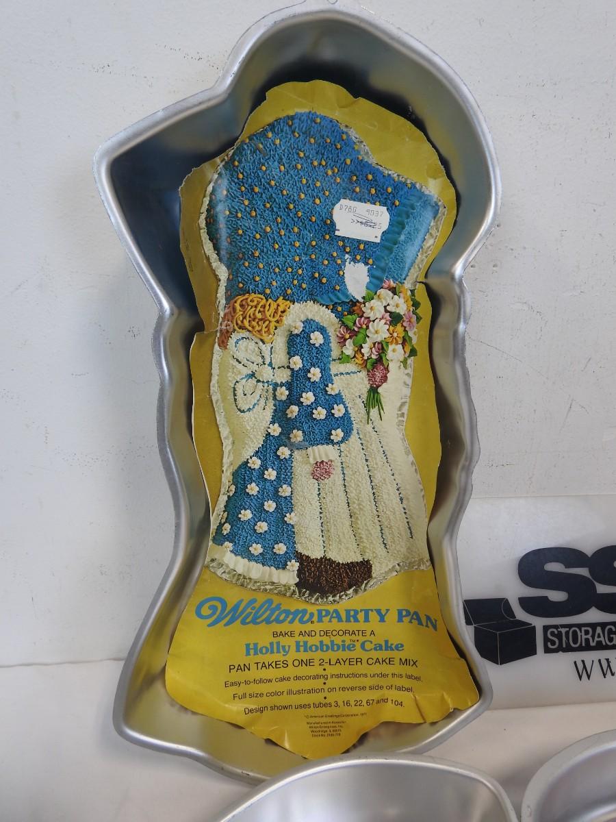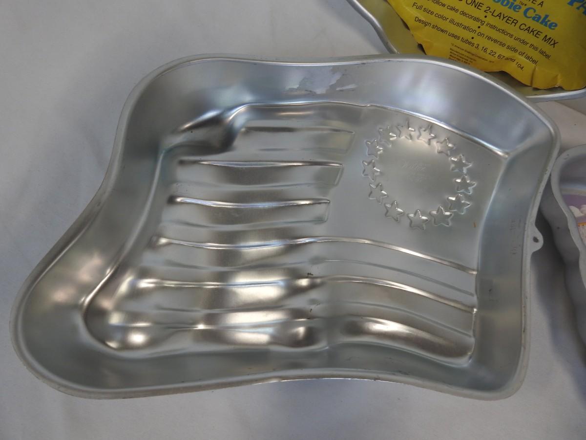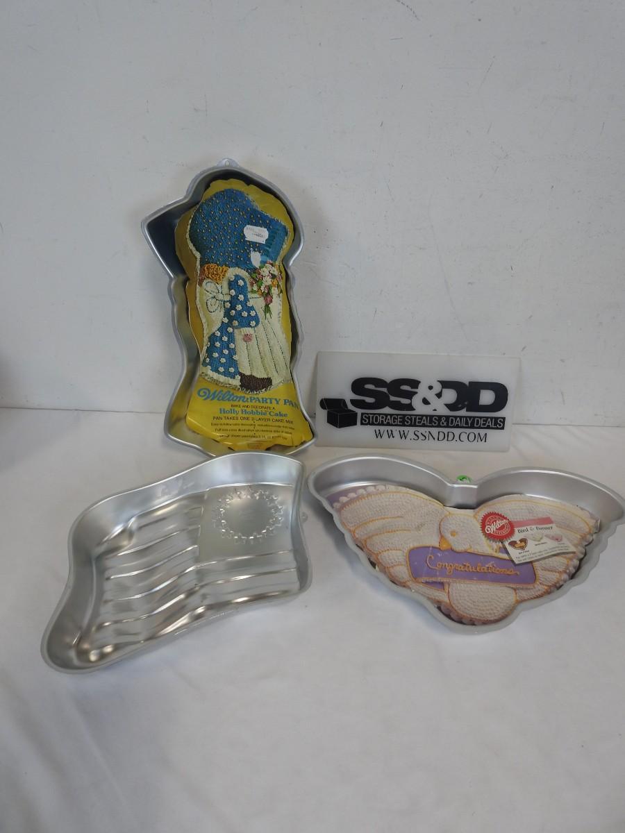 3 Wilton Metal Cake Pans: Holly Hobbie 1975, Bird & Banner 1987, & Flag - Vintage