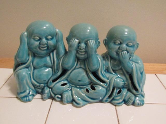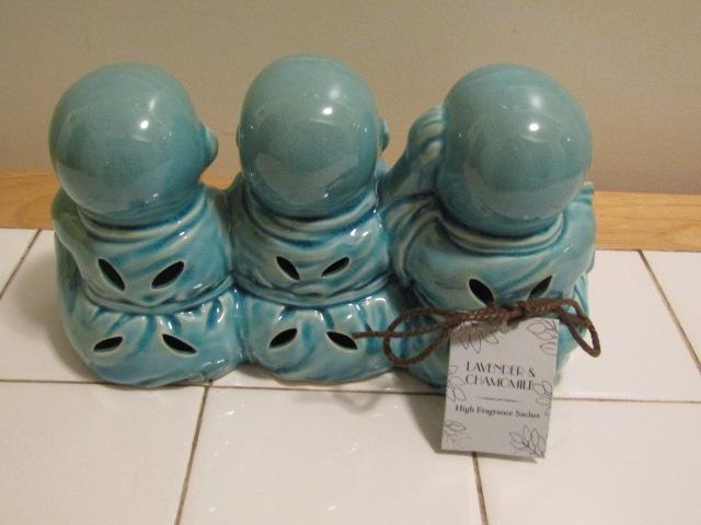 3 Wise Buddhas Ceramic Fragrance Sachet 4 3/4" x 9". Fragrance has diminished, but appears that something else can be inserted into sachet.