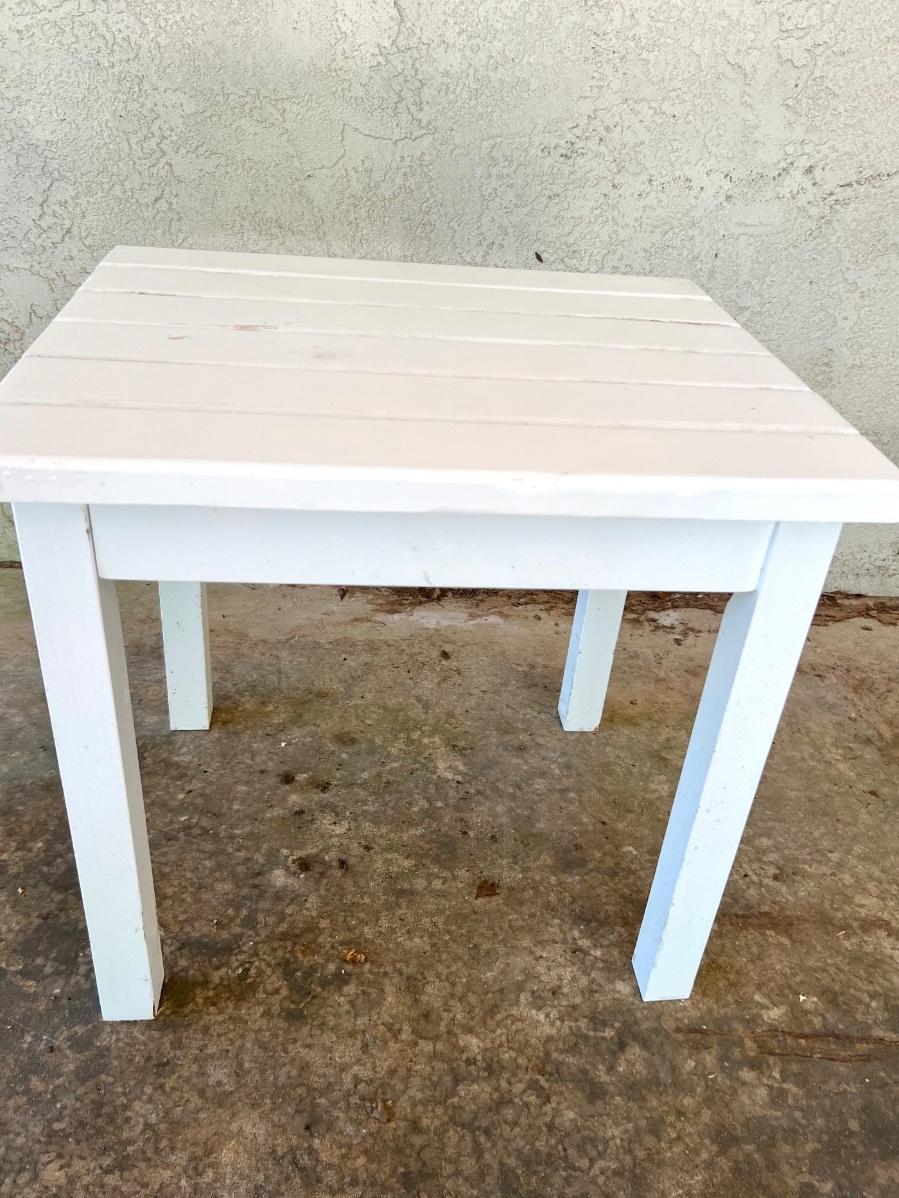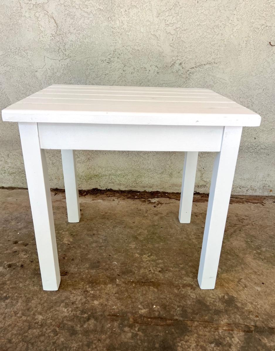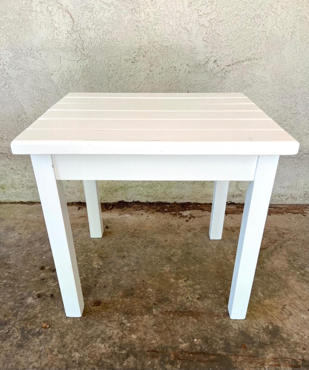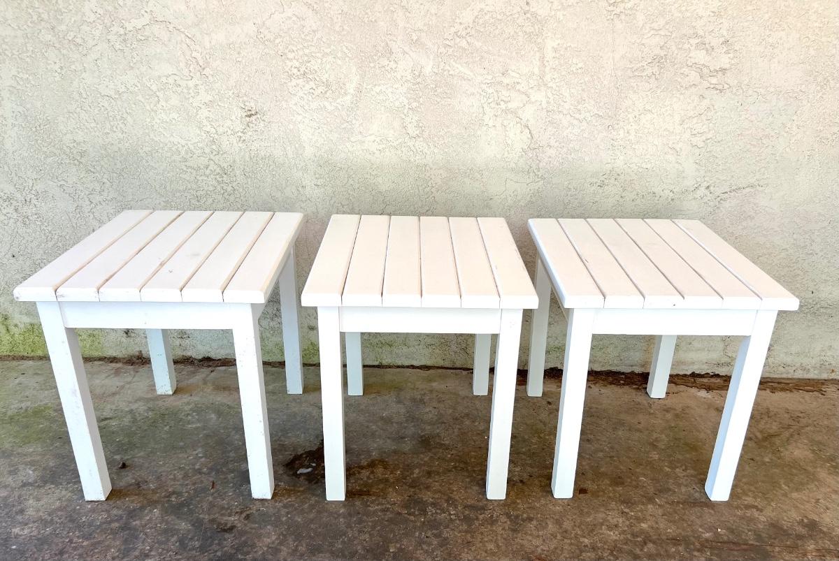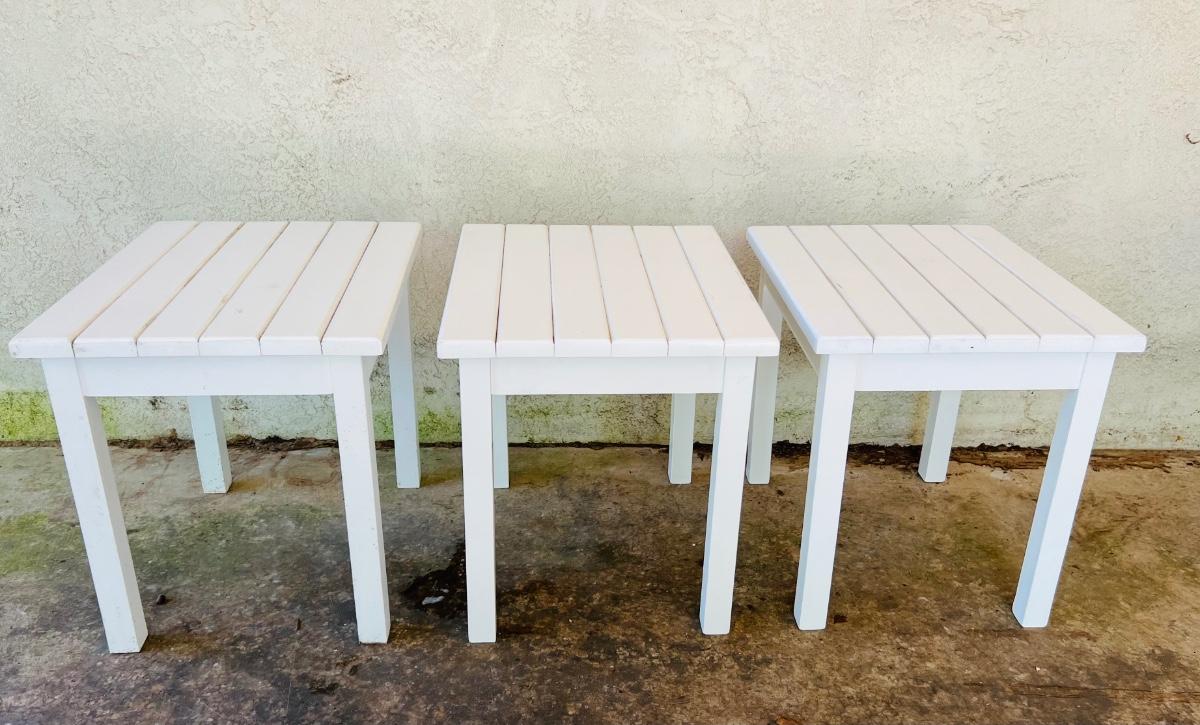 3 White Wooden Side Tables could be used inside or outside. These were used inside. Measures 18 inches tall, 16 inches deep and 19 inches wide.