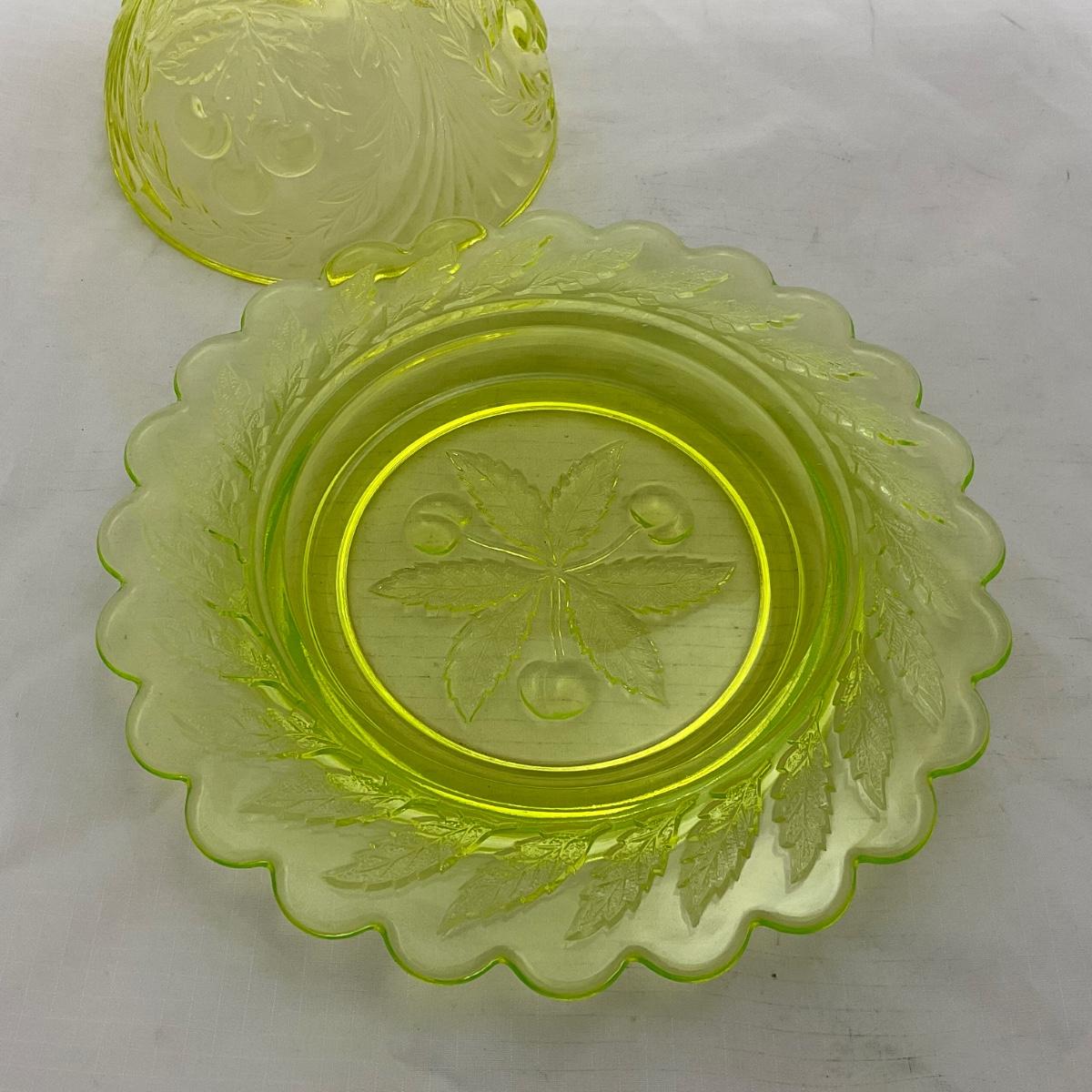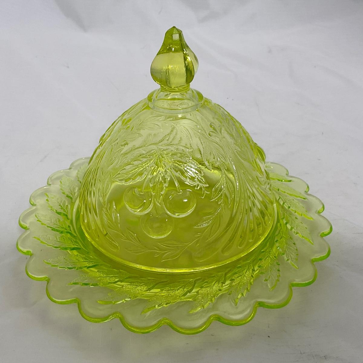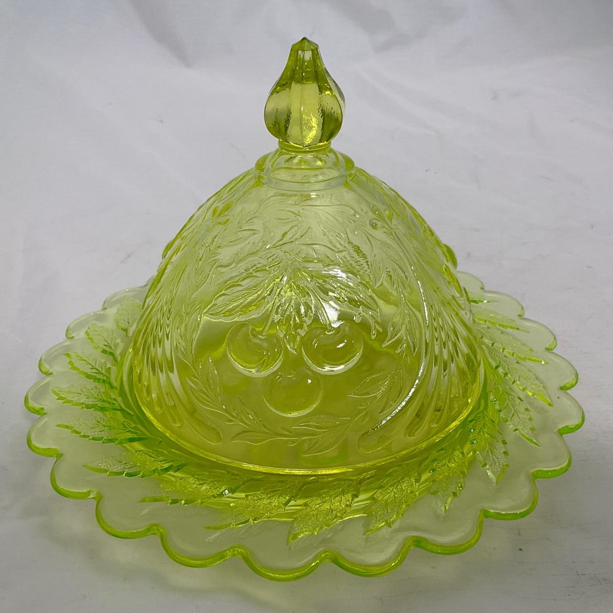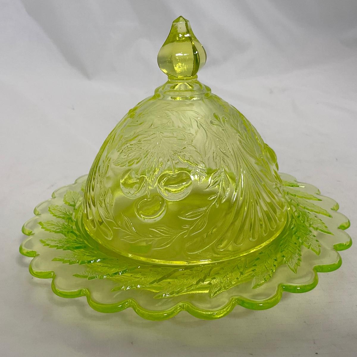 -3- Yellow Vaseline Covered Butter Dish | Cherries Pattern | Uranium Glass