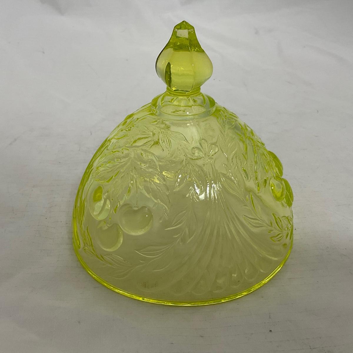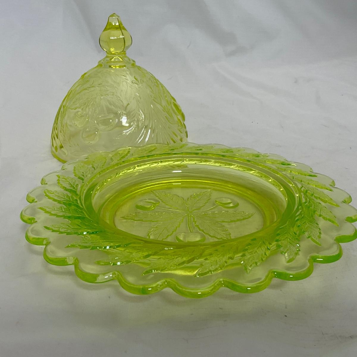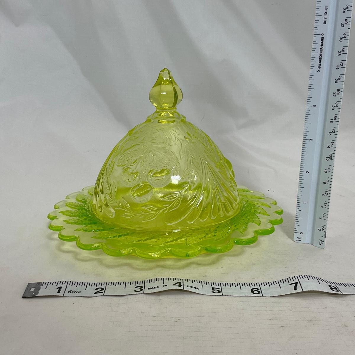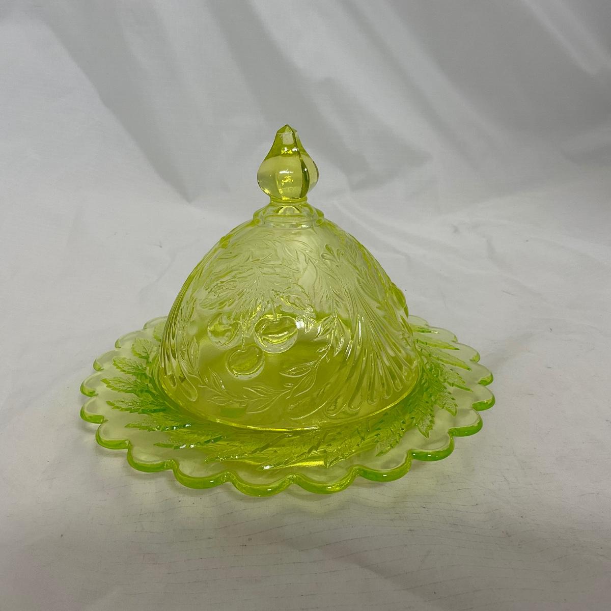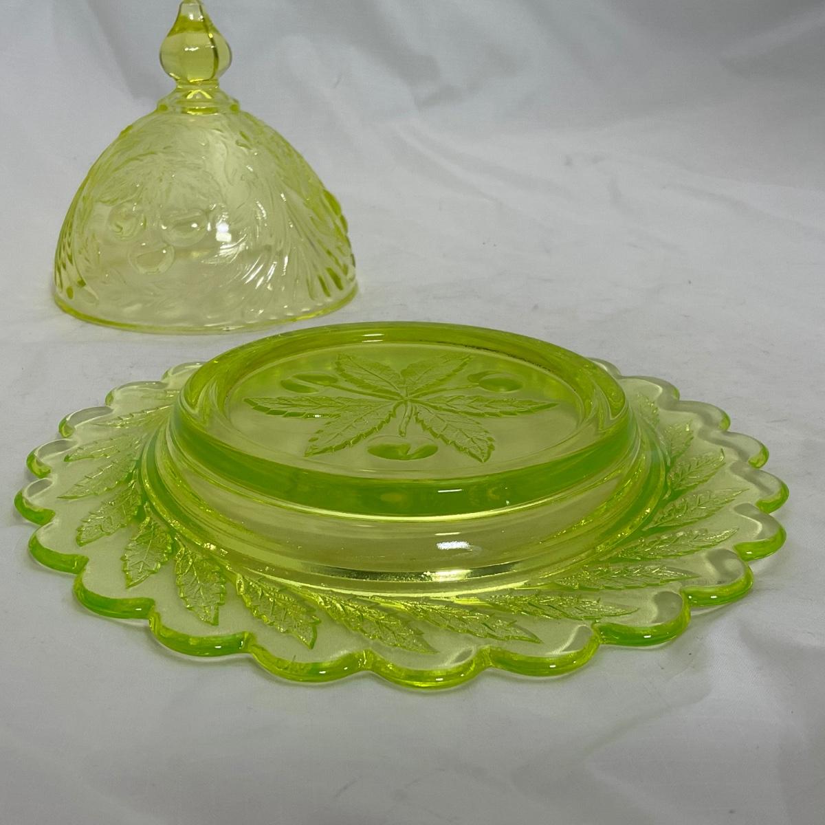 -3- Yellow Vaseline Covered Butter Dish | Cherries Pattern | Uranium Glass