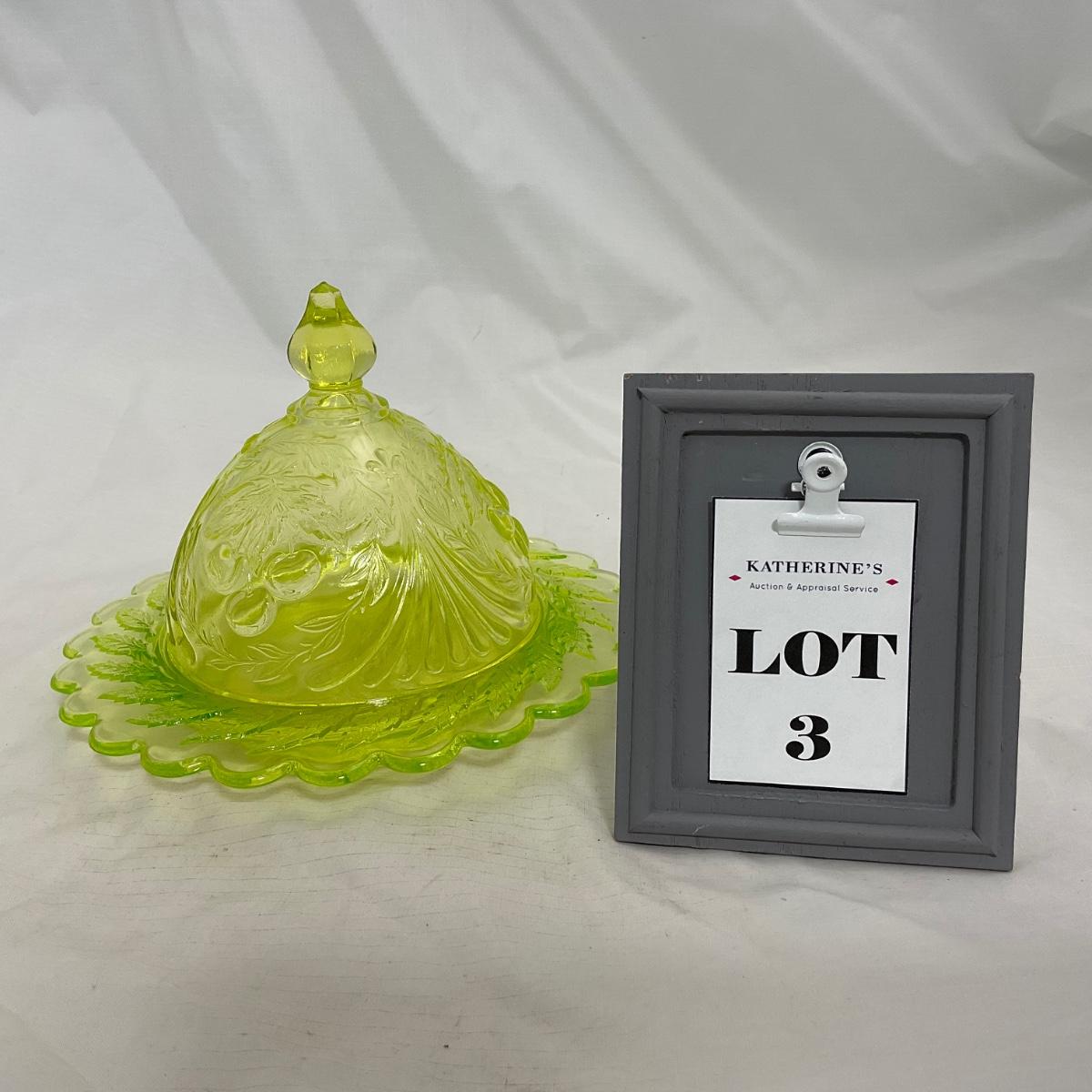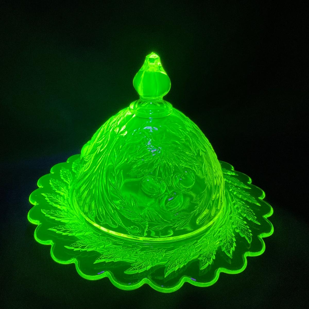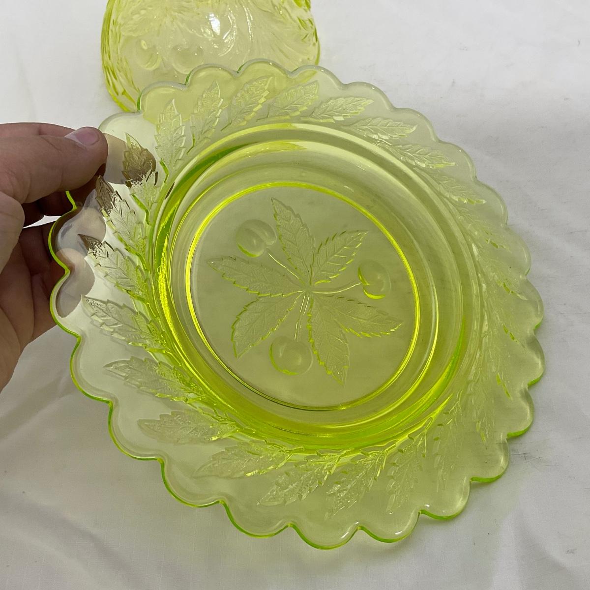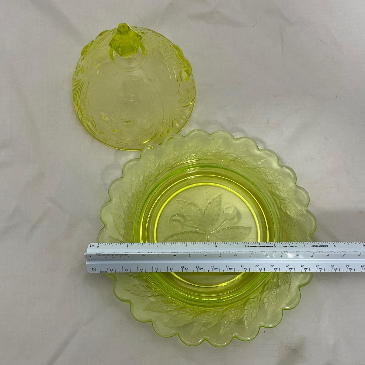-3- Yellow Vaseline Covered Butter Dish | Cherries Pattern | Uranium Glass