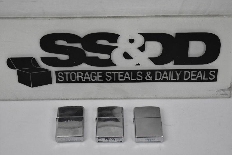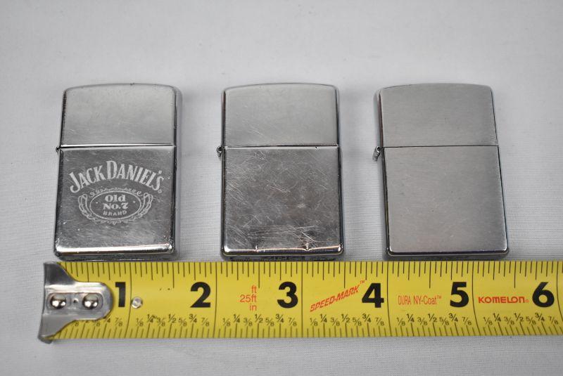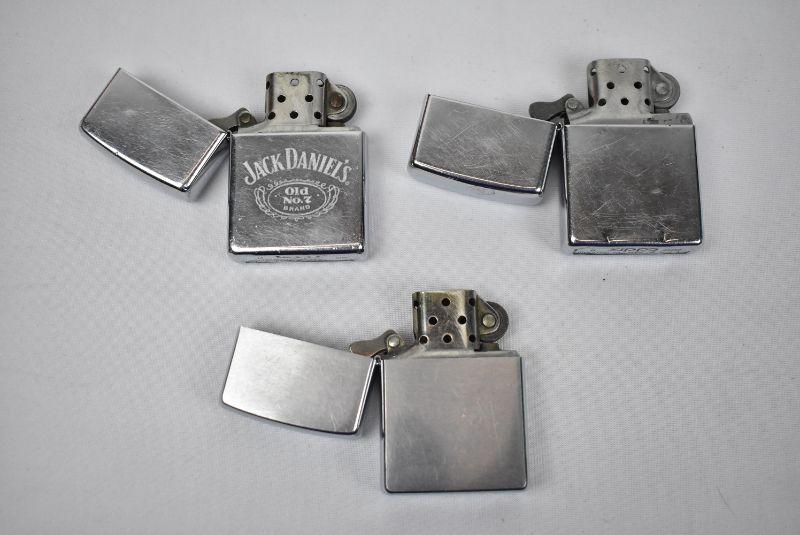 3 Zippo Lighters, 1 says "Jack Daniel's"