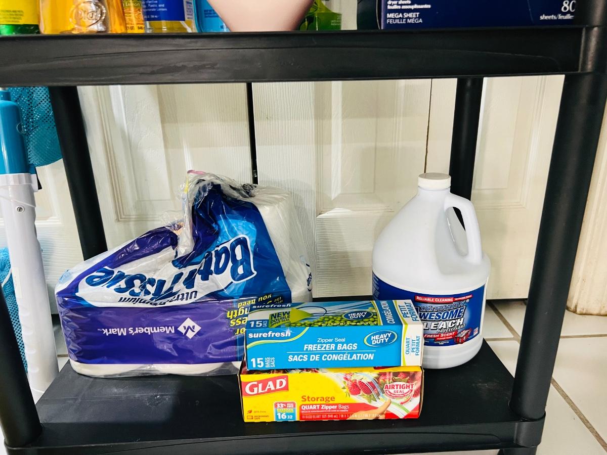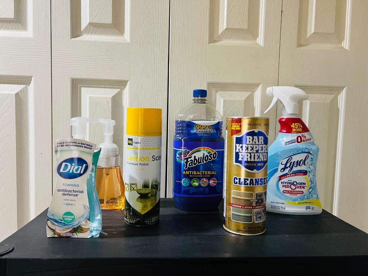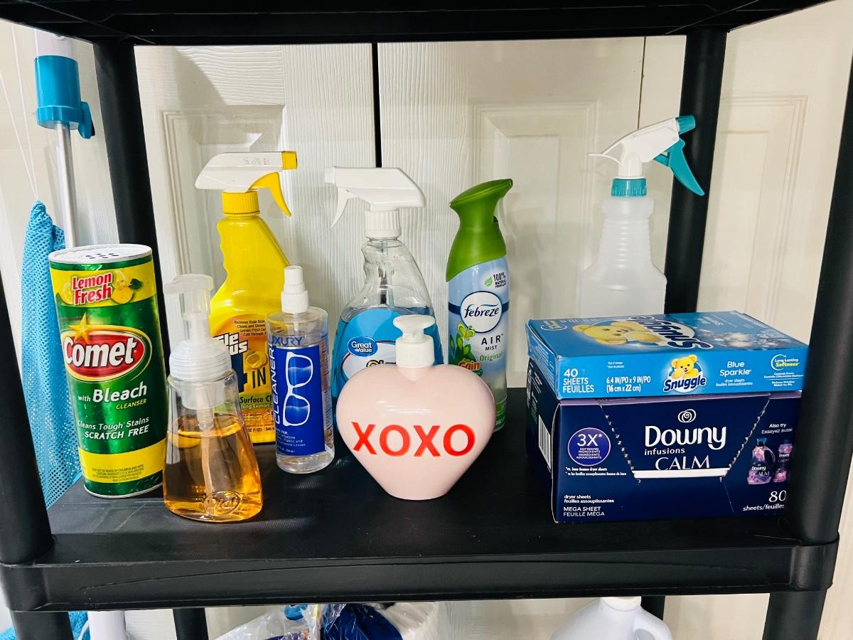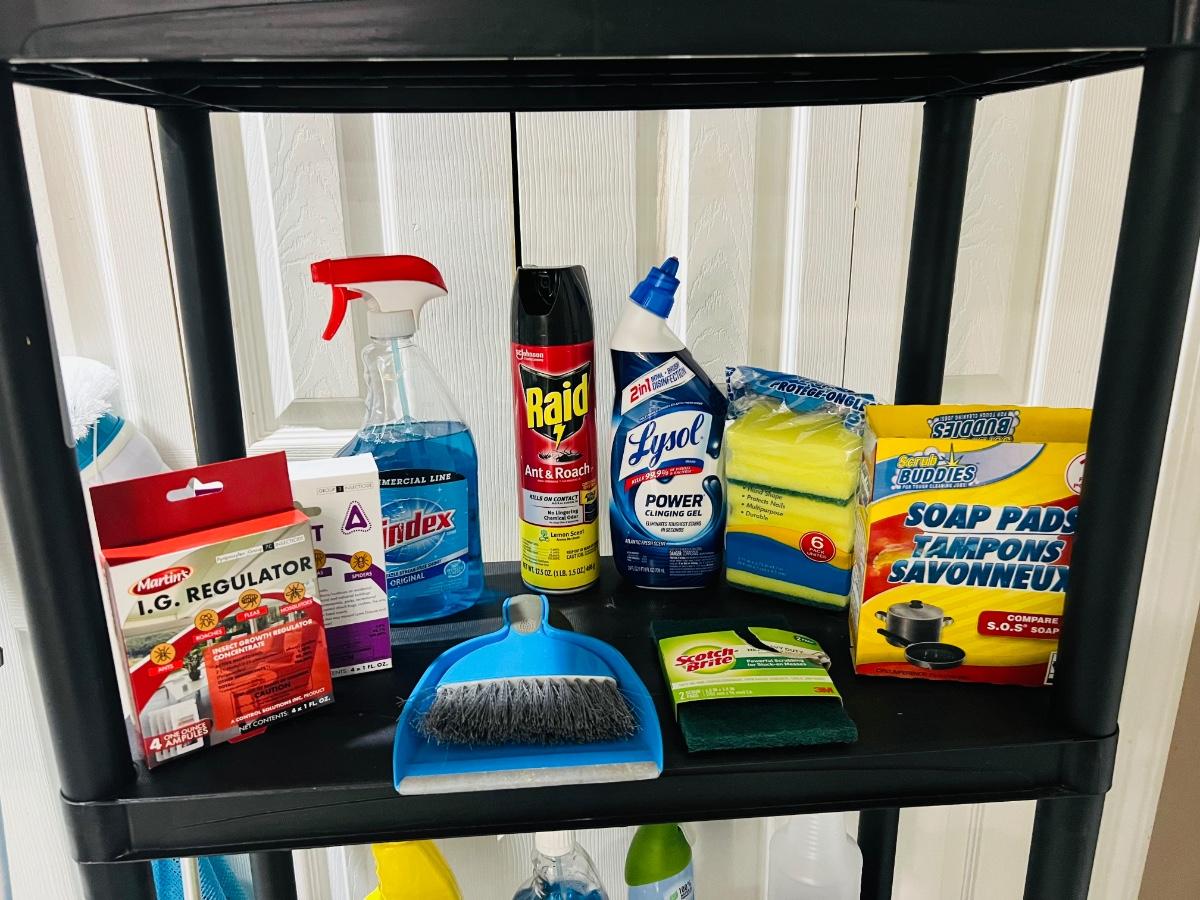 Over 30+ items that include cleaning supplies and tools to help you clean. Everything you see here is at least 75% full or more. Comes with everything you see pictured, however, the shelf is not included