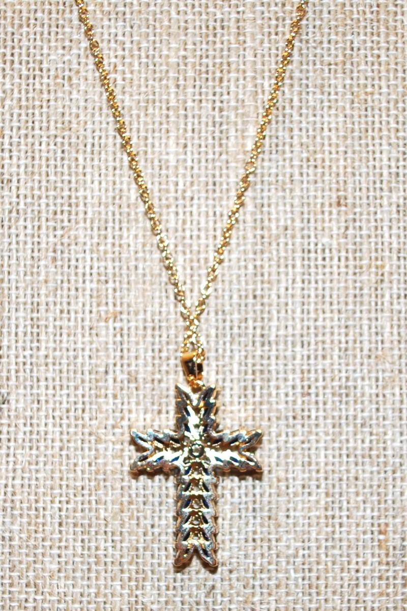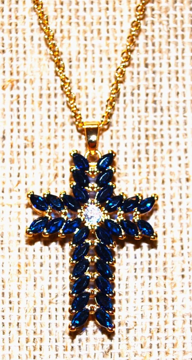 30 Dark Blue Marquis Cut Stones Cross PENDANT (1" x ¾") on a Gold Tone Necklace 18" L