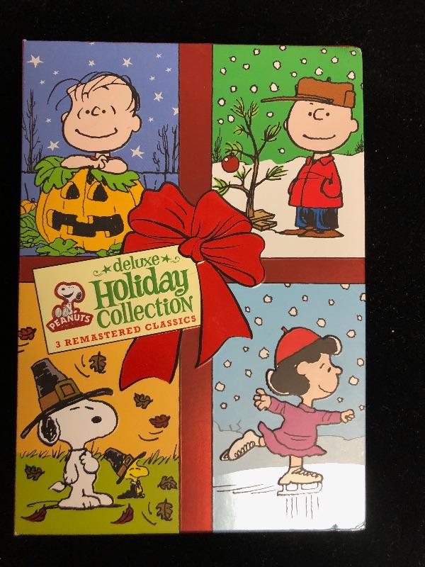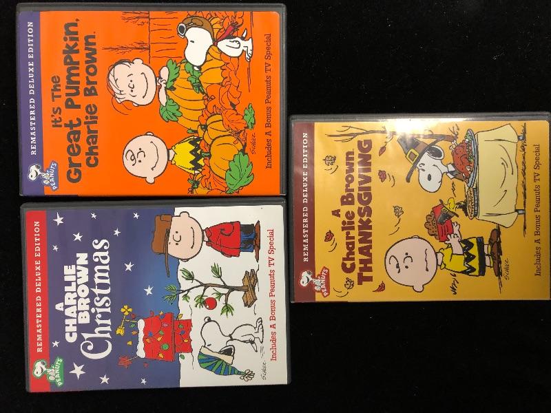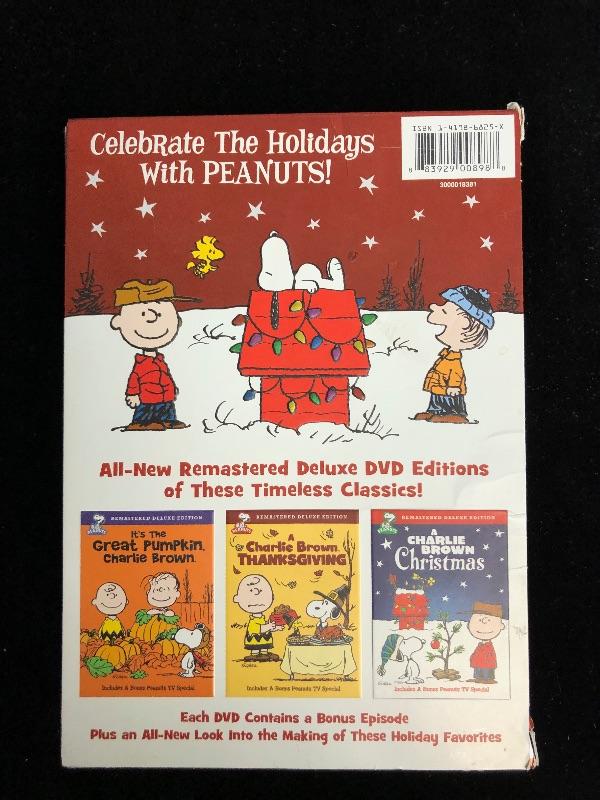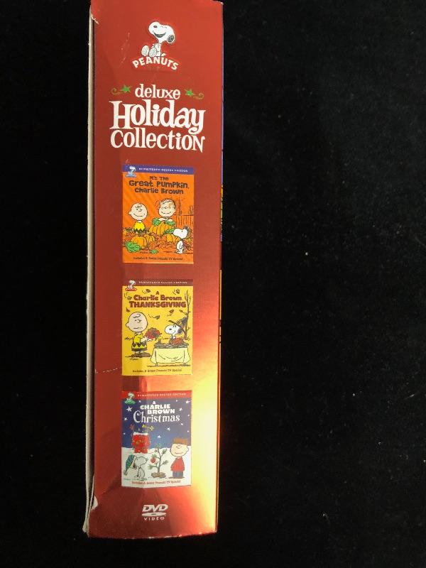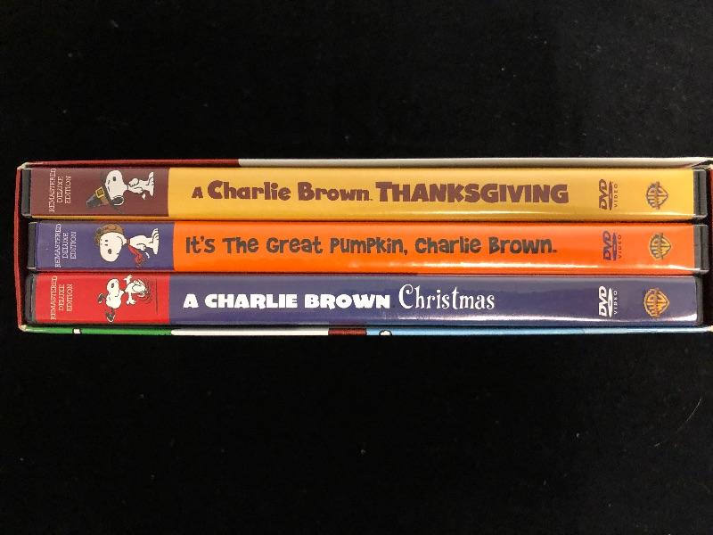 Box set includes it's the great pumpkin, a Charlie Brown thanksgiving, a Charlie Brown Christmas.