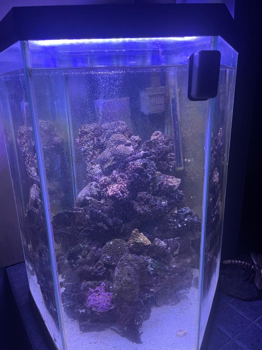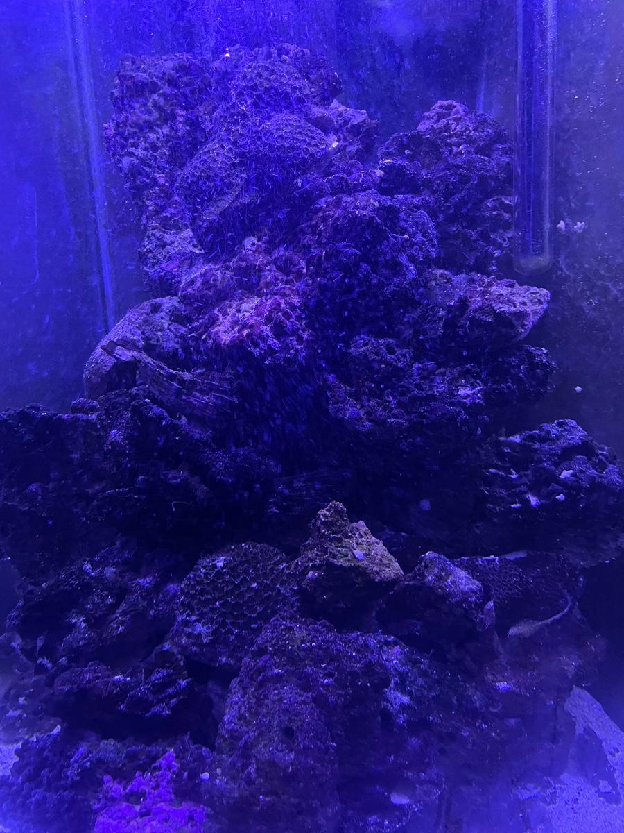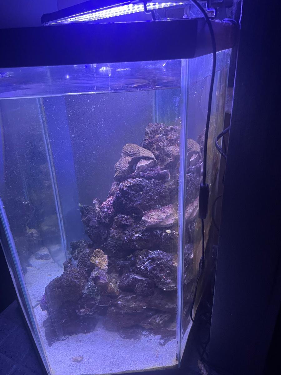 Includes live rock. Purchaser needs to be familiar with taking down and transporting the live rock safely. Lights on tank create a bright white to deep blue color. New lights.