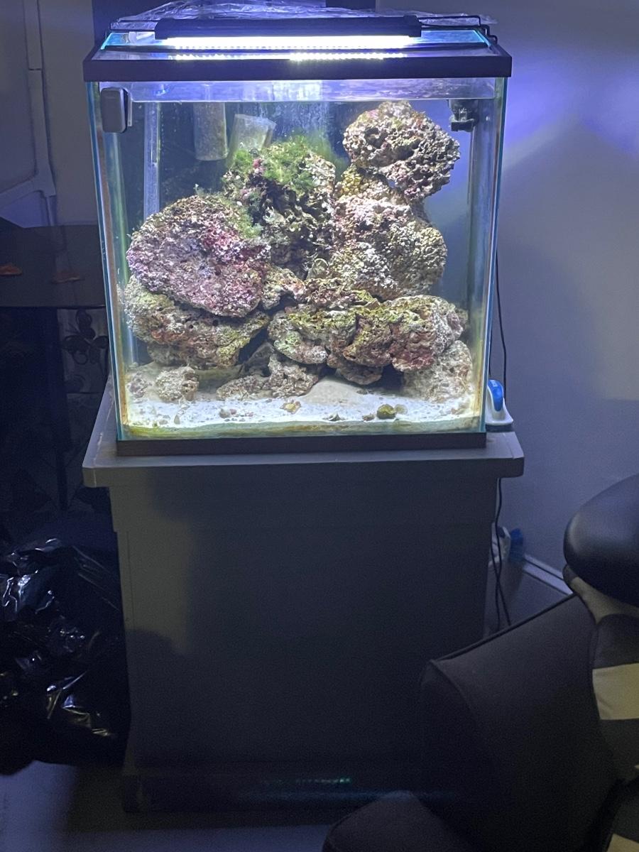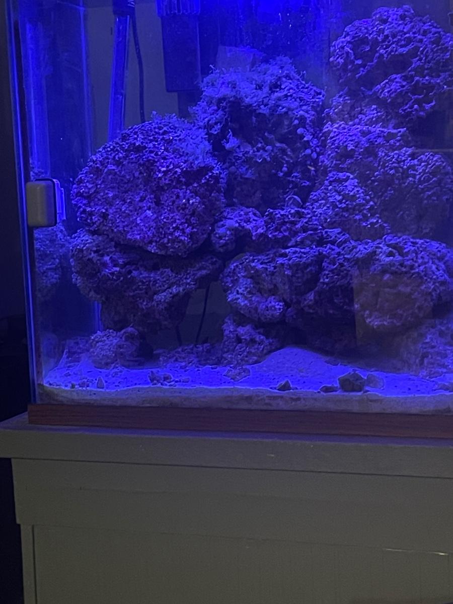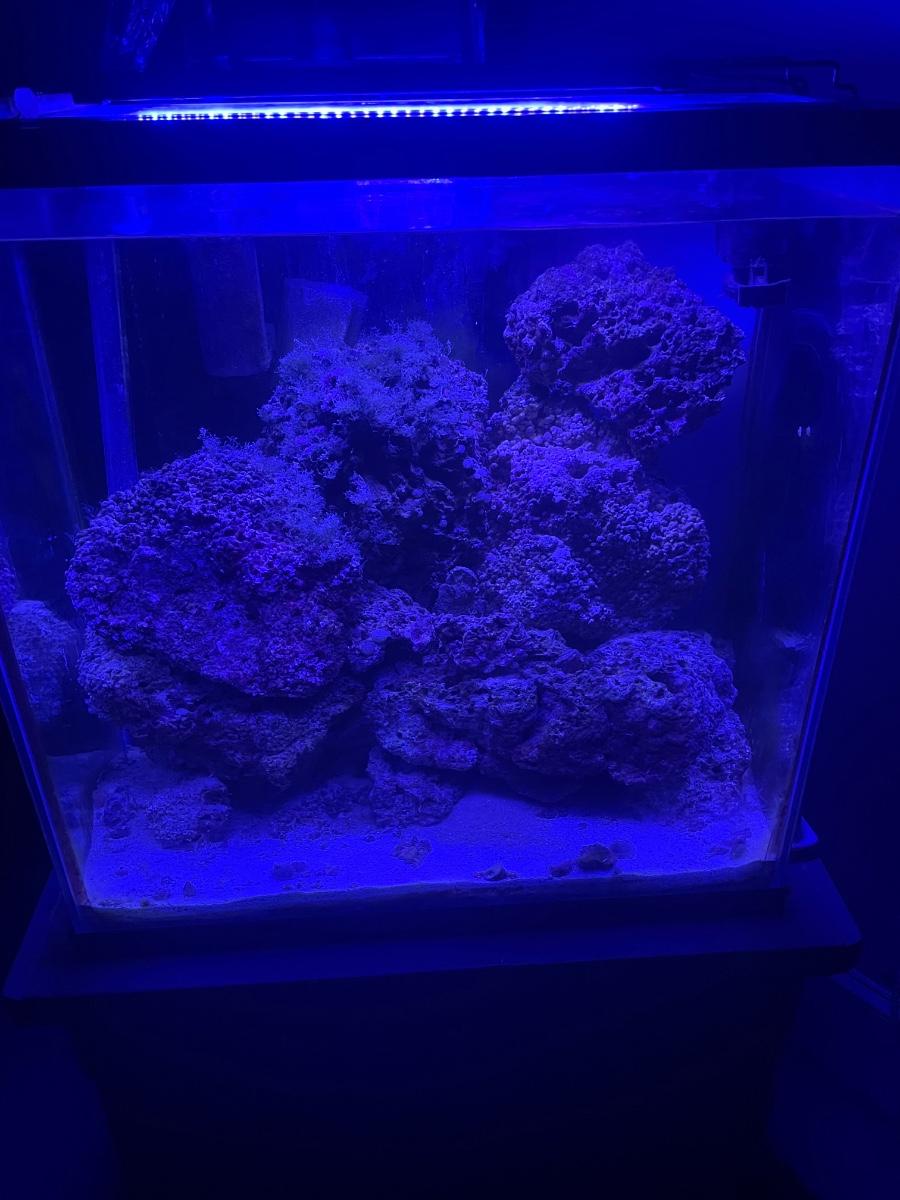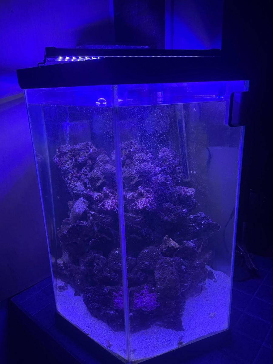 Includes live rock. Purchaser needs to be familiar with taking down and transporting the live rock safely. Lights on tank create a bright white to deep blue color. New lights.