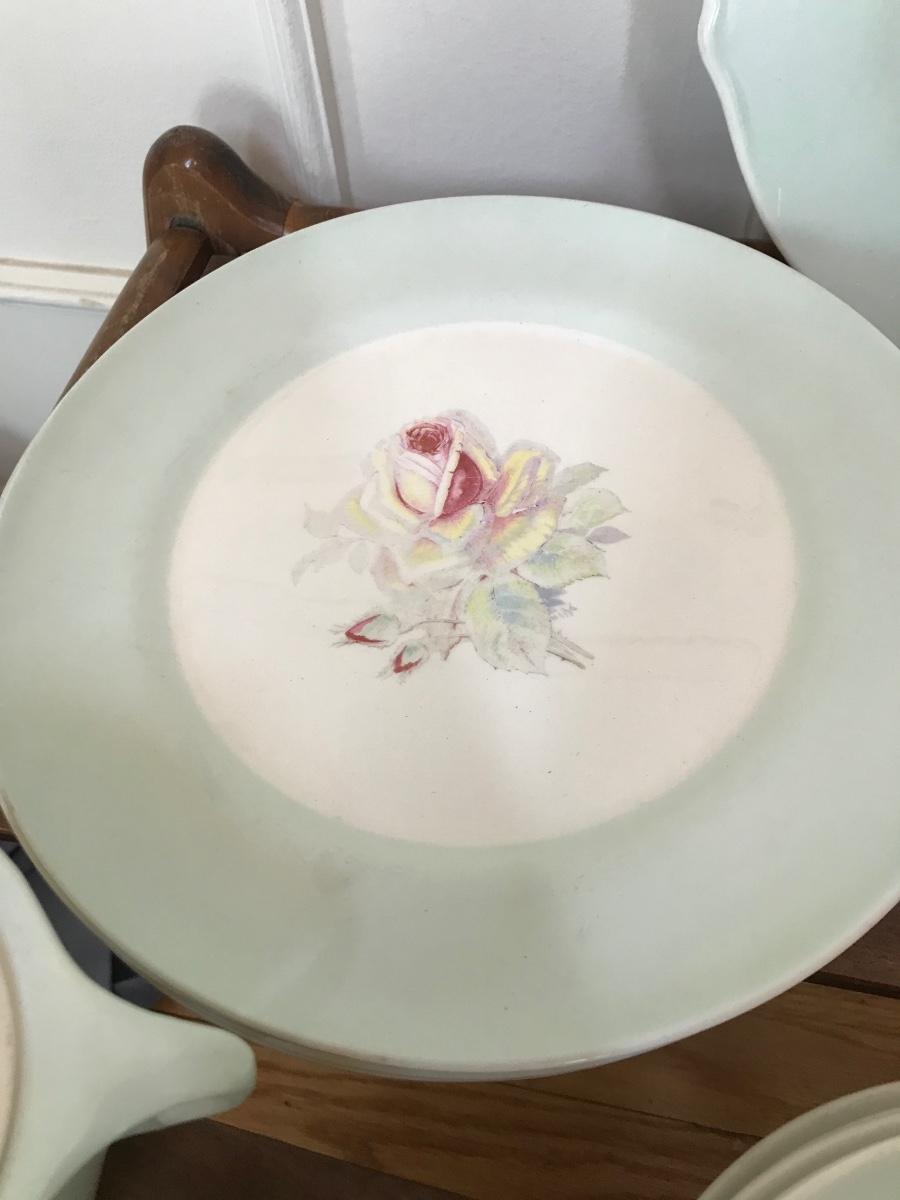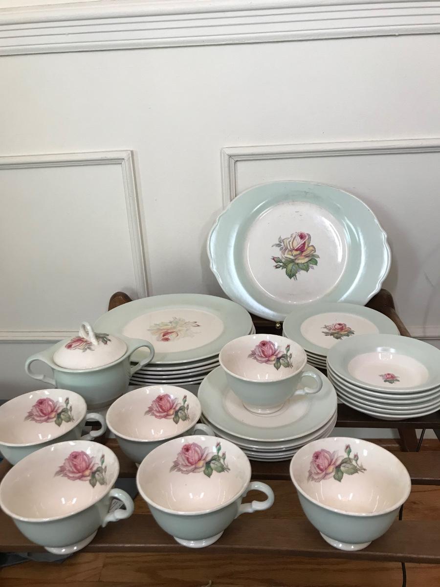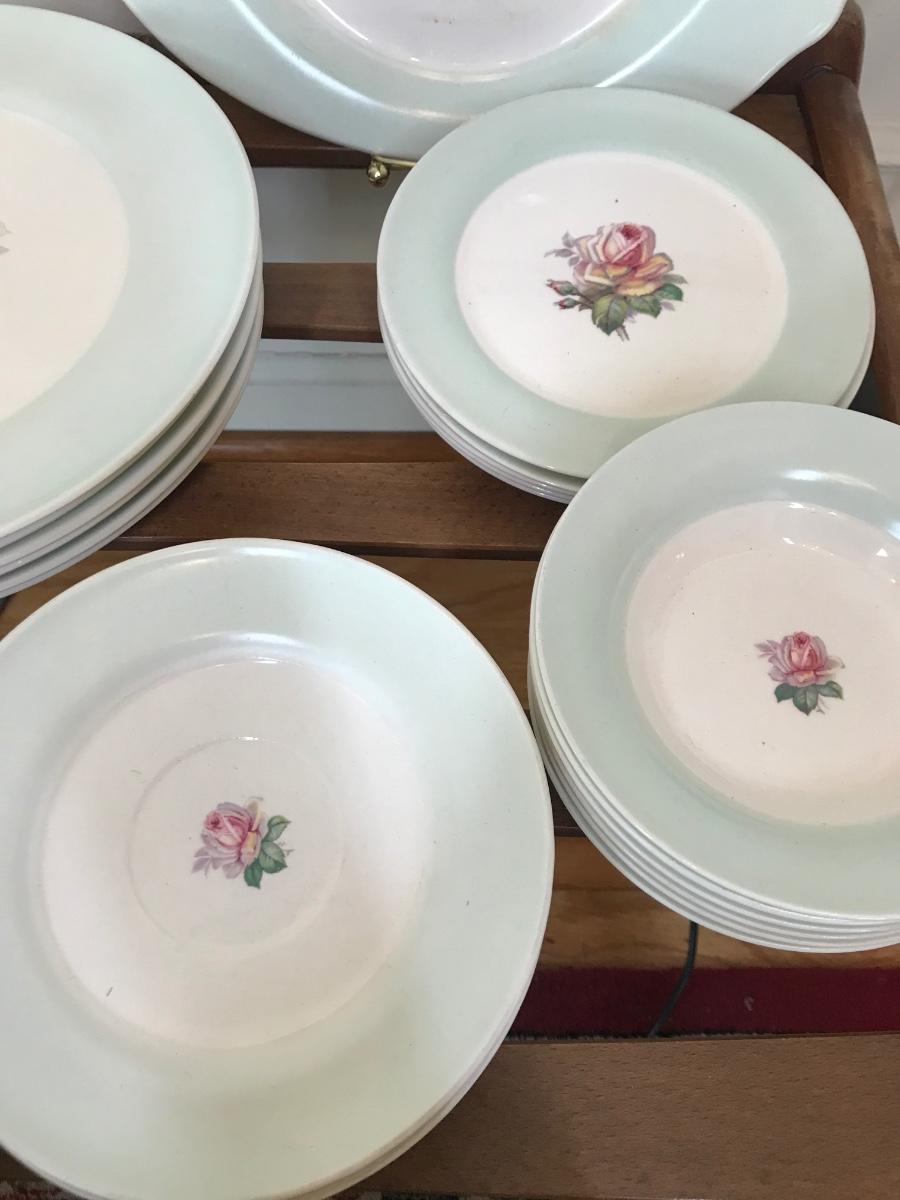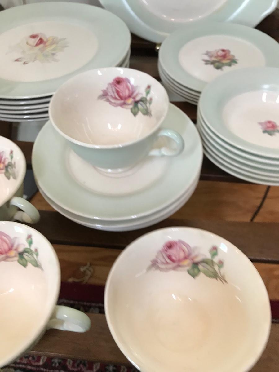 Tea Rose-LC #D-47, Dustitone Green, has green border, with a tea rose in center. One tea cup is missing handle, most of the plates are faded as shown in pictures, set has wear. Tags: vintage kitchen, dining