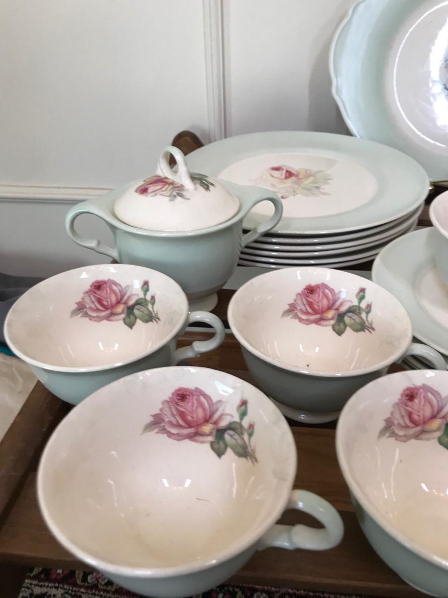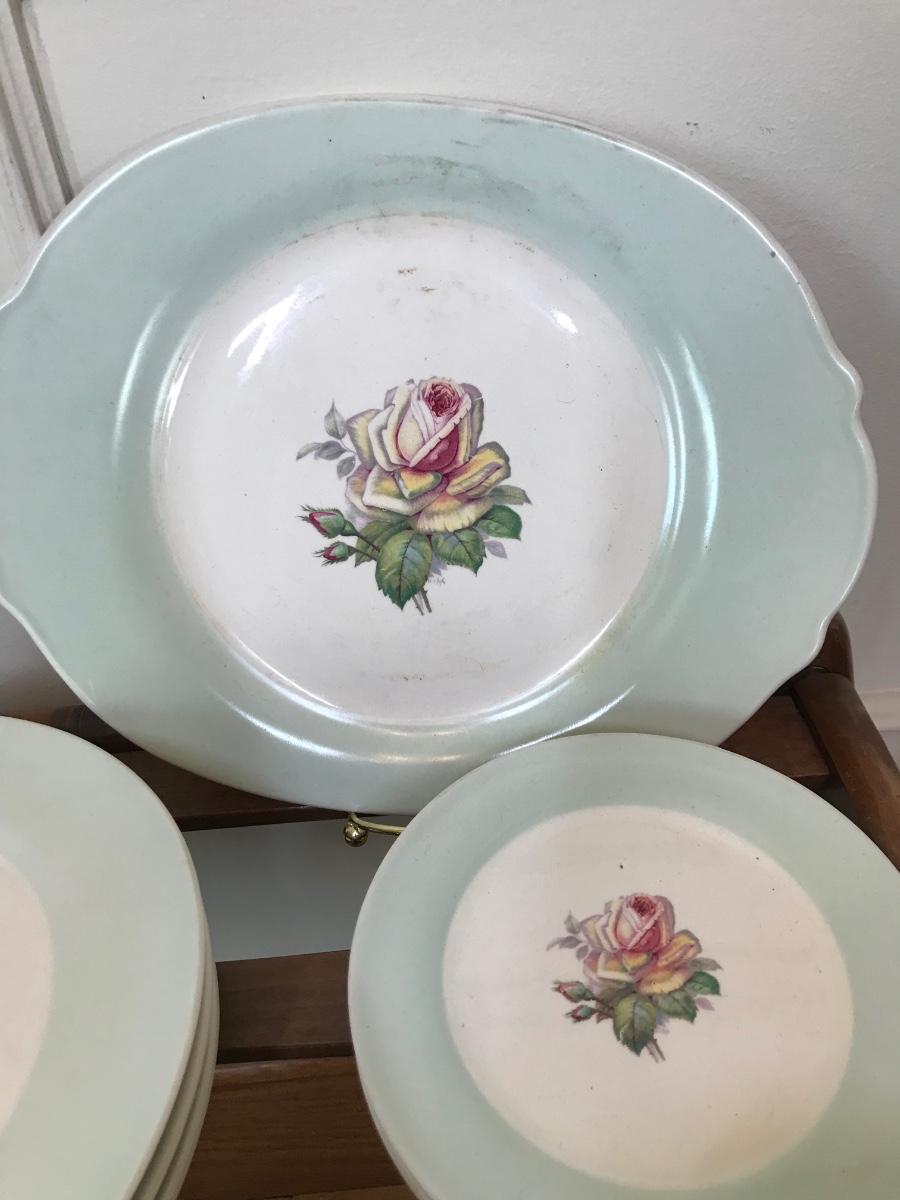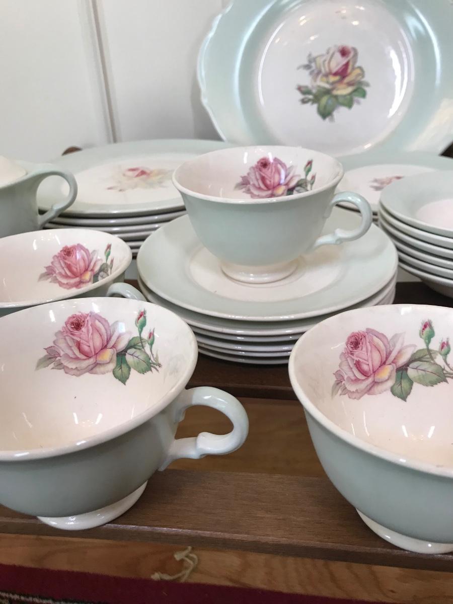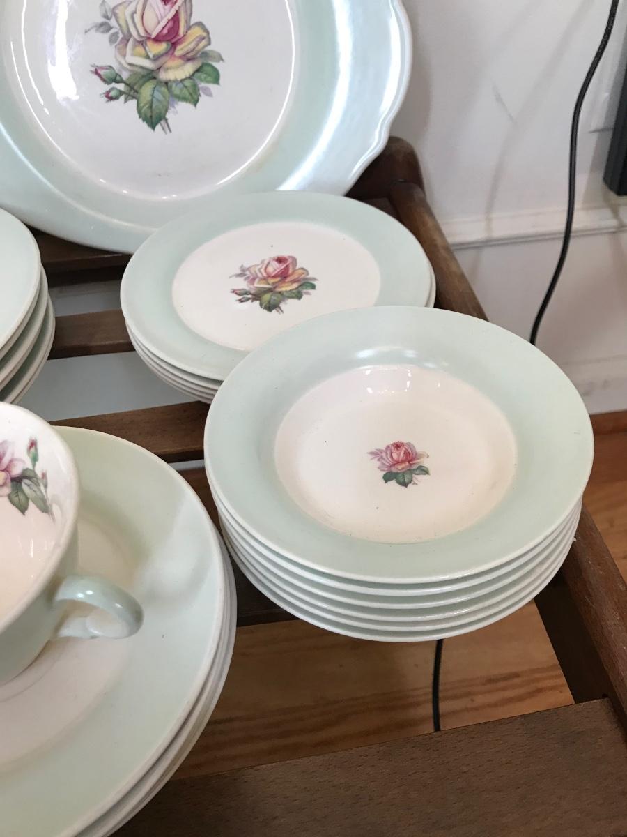 Tea Rose-LC #D-47, Dustitone Green, has green border, with a tea rose in center. One tea cup is missing handle, most of the plates are faded as shown in pictures, set has wear. Tags: vintage kitchen, dining