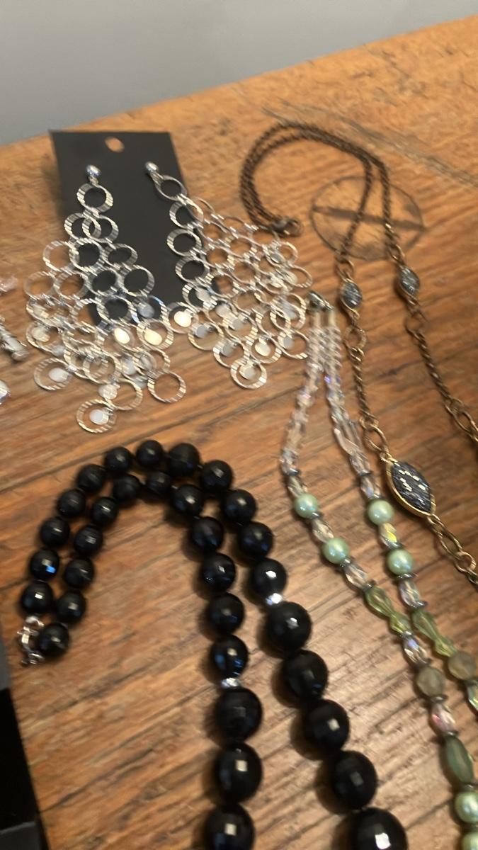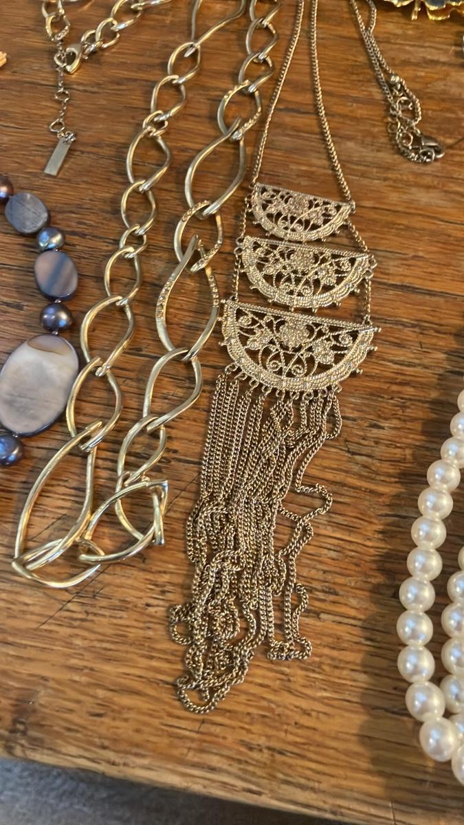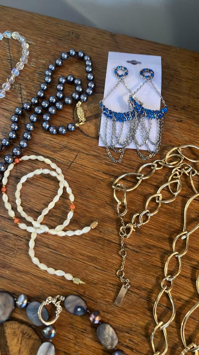 - Beaded, chain, and gemstone-style necklaces (blues, greens, blacks, pearls)