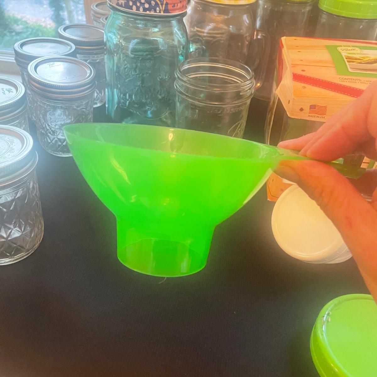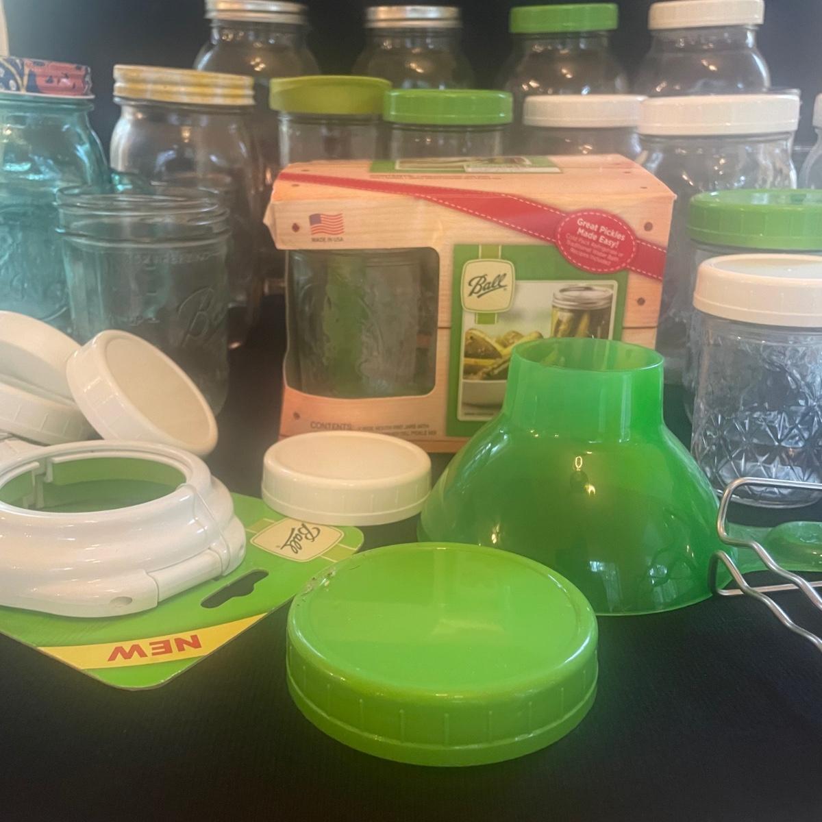 This large lot includes a wide array of glass canning jars, a lot of which are Ball brand. Lots of metal lids as well as plastic (many new) wide mouth lids. Lot also includes a funnel, jar grabber, and a sure tight band tool.