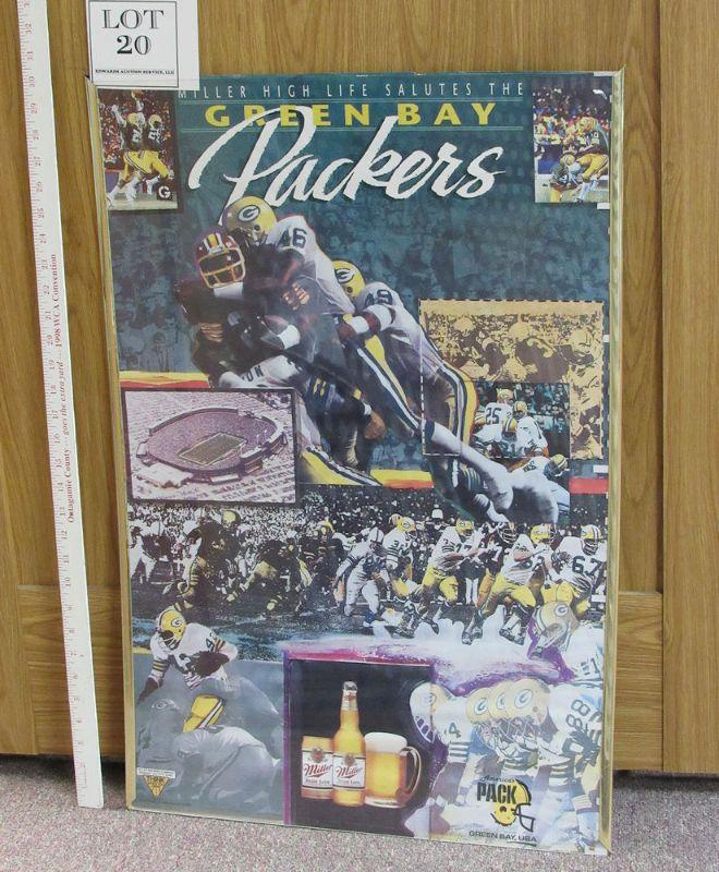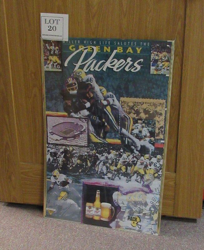 30" x 20" Miller High Life Salutes the Green Bay Packers poster, top and bottom of frame are missing, and the poster may be a little faded.