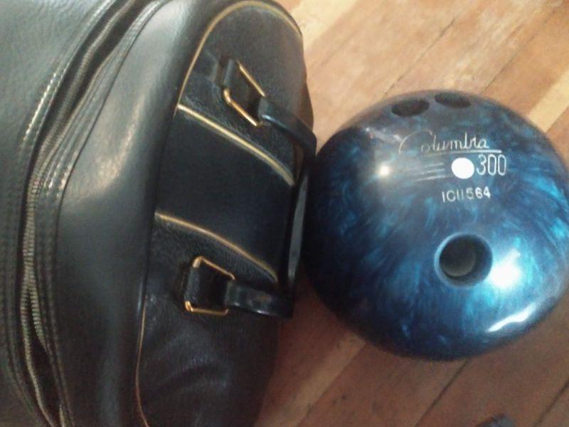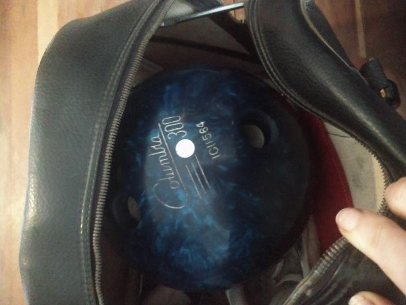 300 Columbia White dot bowling ball, bag, shoes, and ball rack.