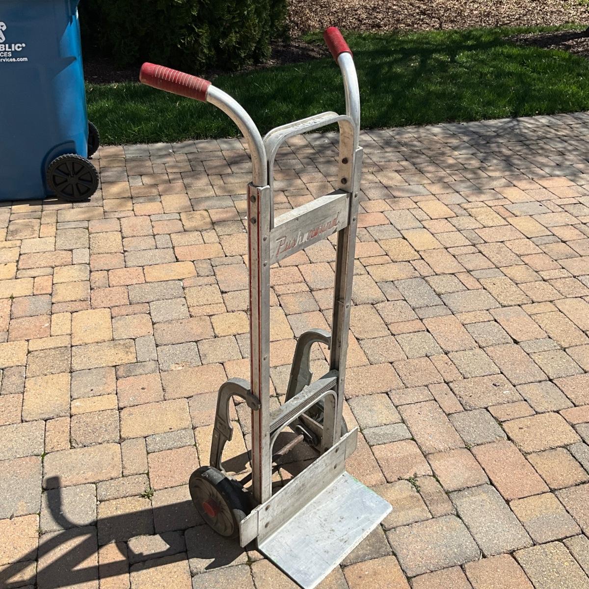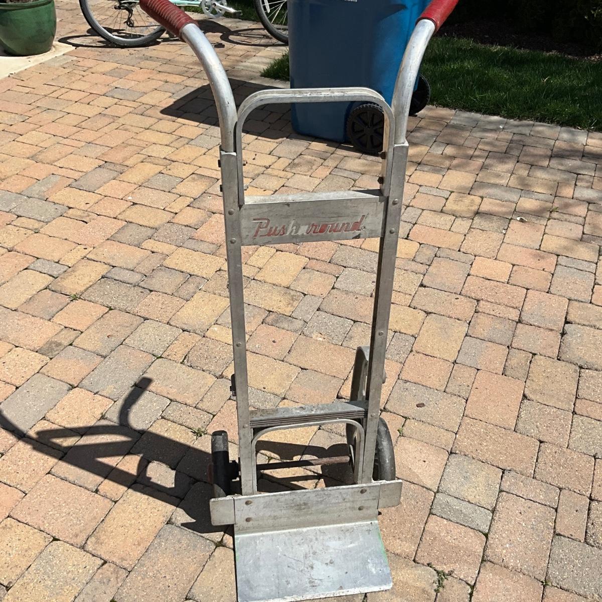Pushround metal dolly with rubber wheels.