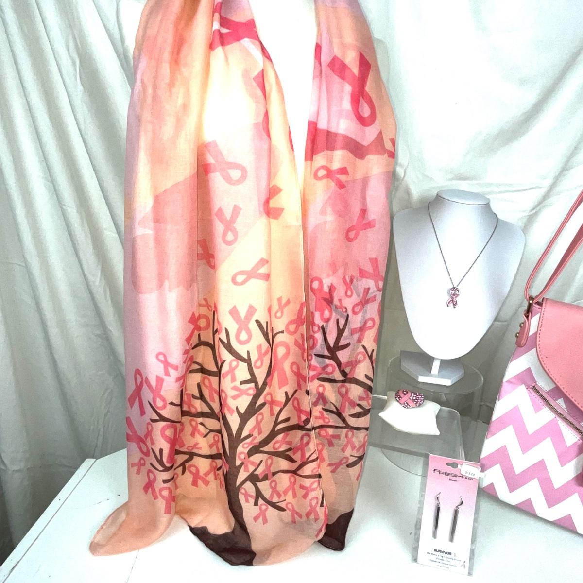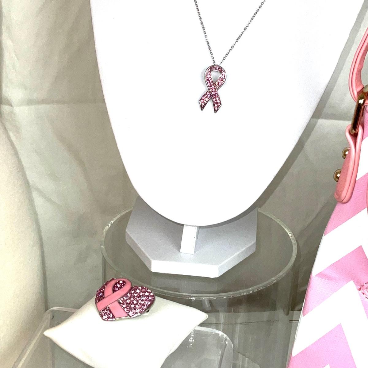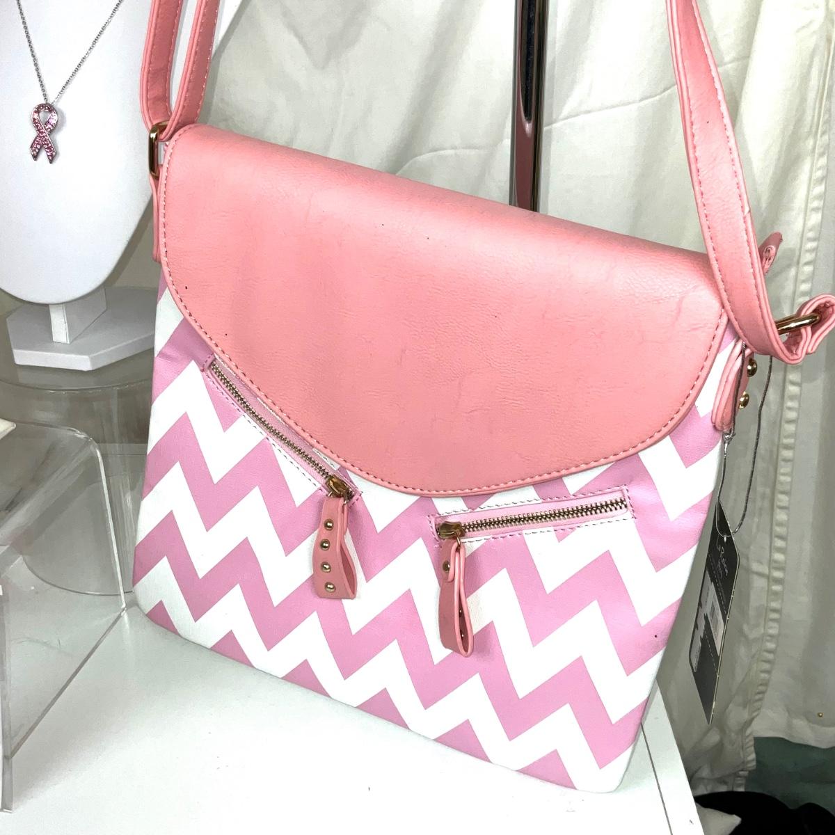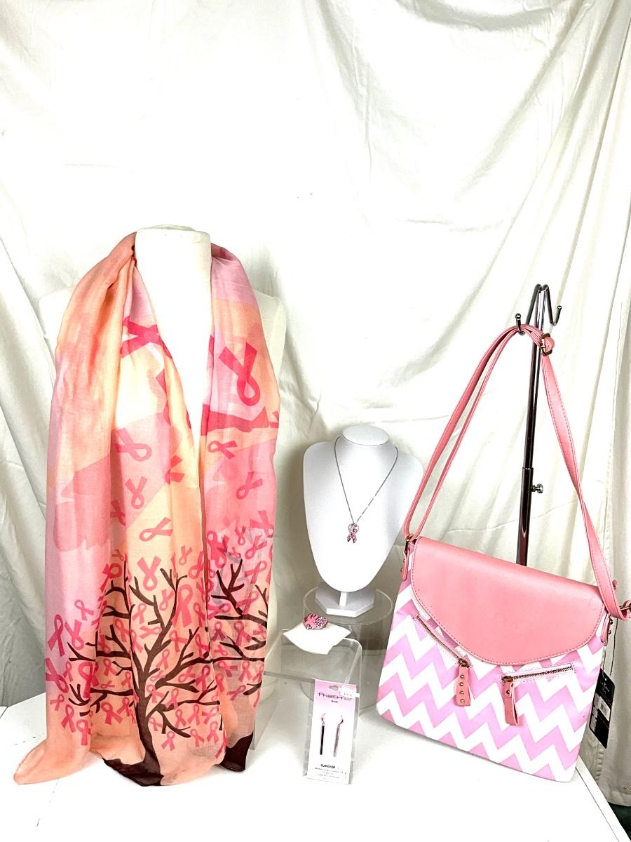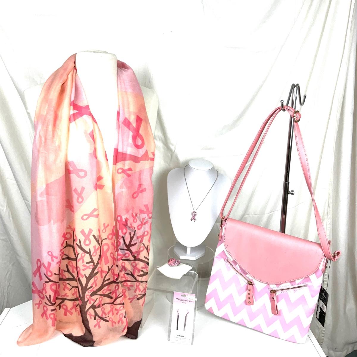 300 Pink Cancer Survivor Lot with Pink Chevron Purse, Necklace, Earrings, Brooch
