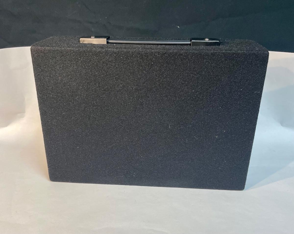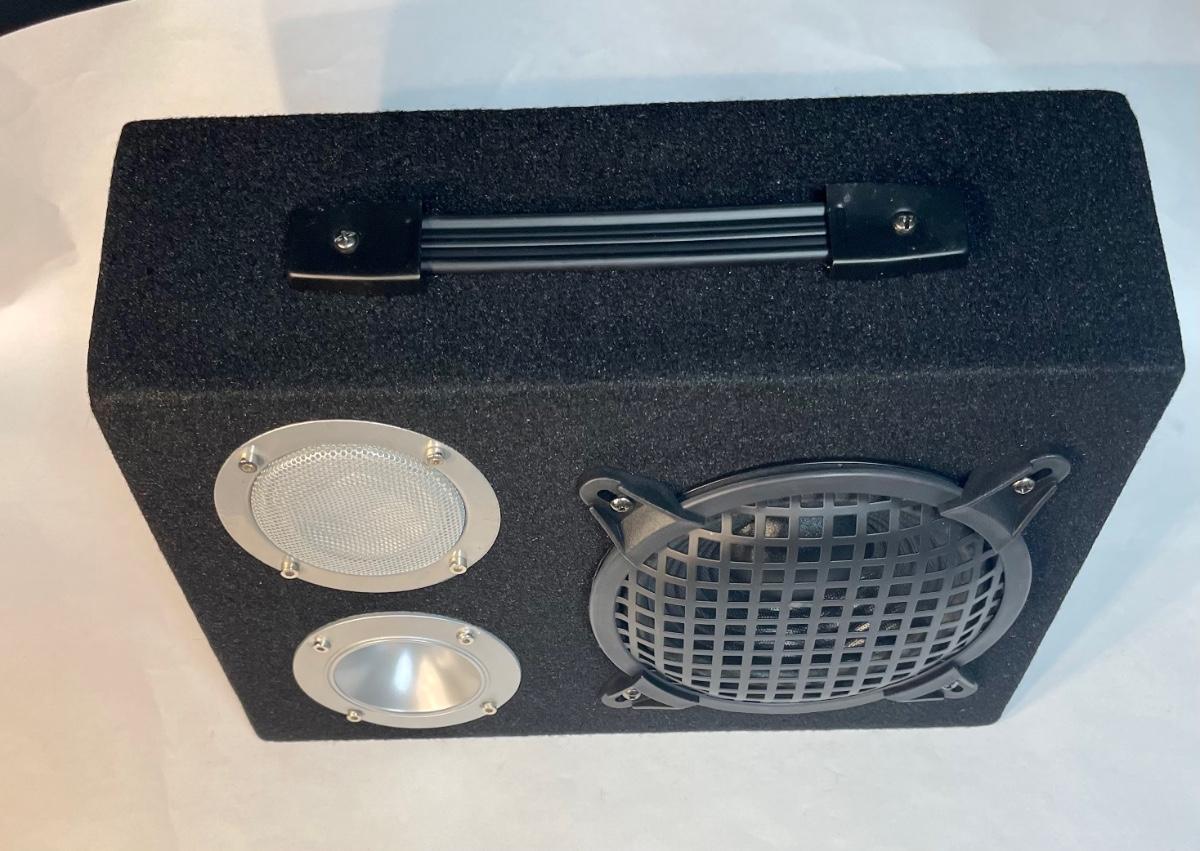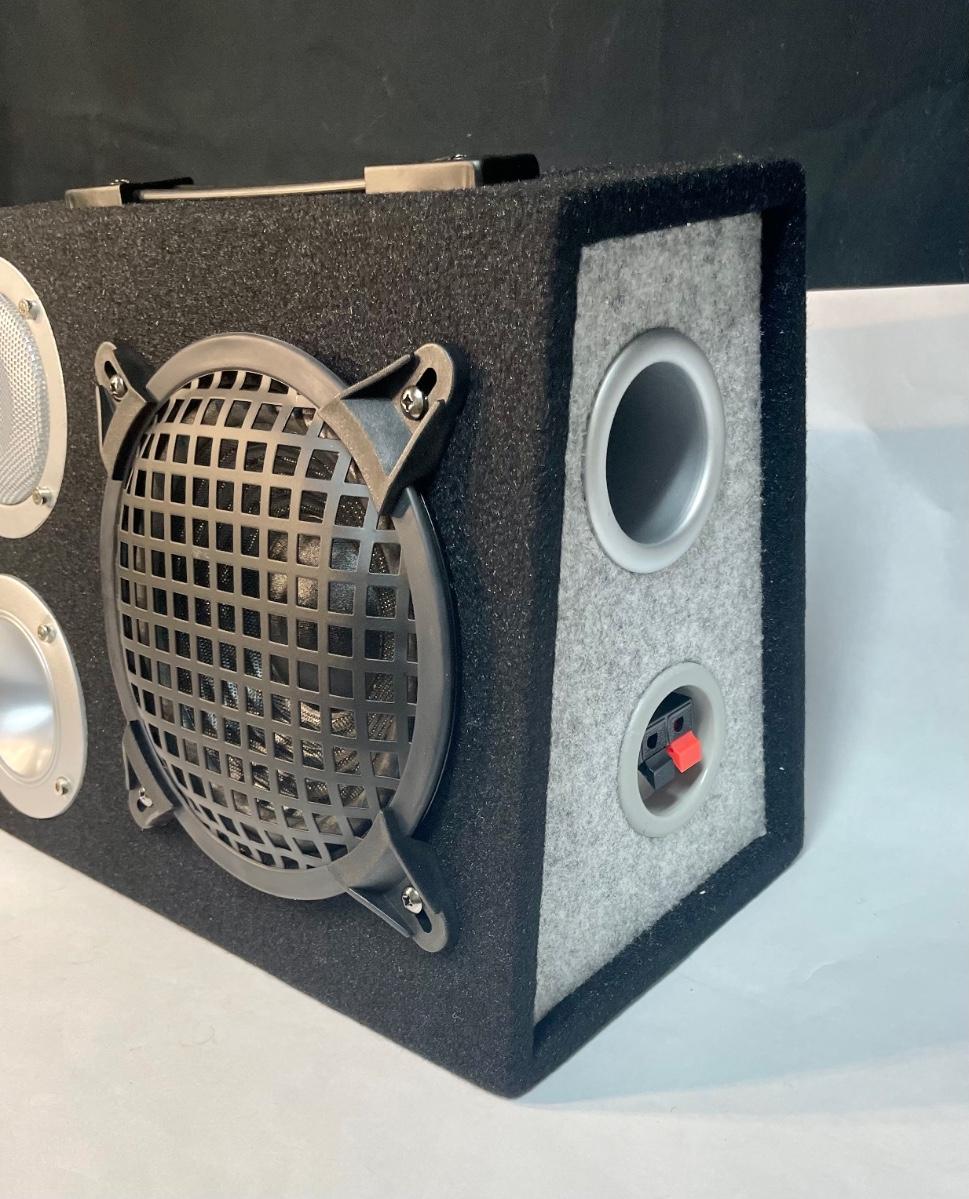 Pair of new in box speaker boxes. Speakers included: Tweeter, Midrange, and 6.5" subwoofer in each box. Boxes har covered in black carpet and have carrying handles. 300 Watt power. Each box measure approx. 14" x 9" x 7".