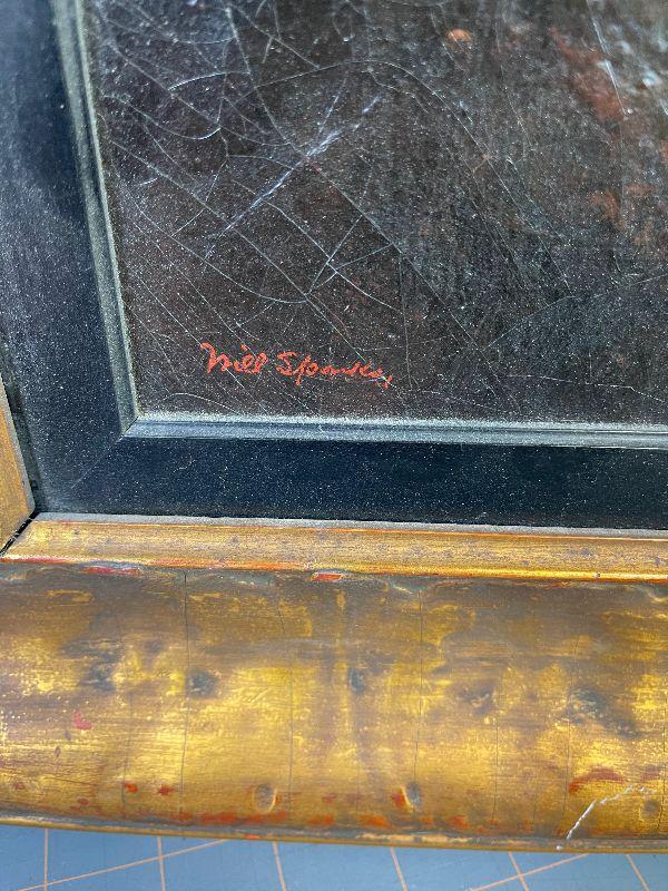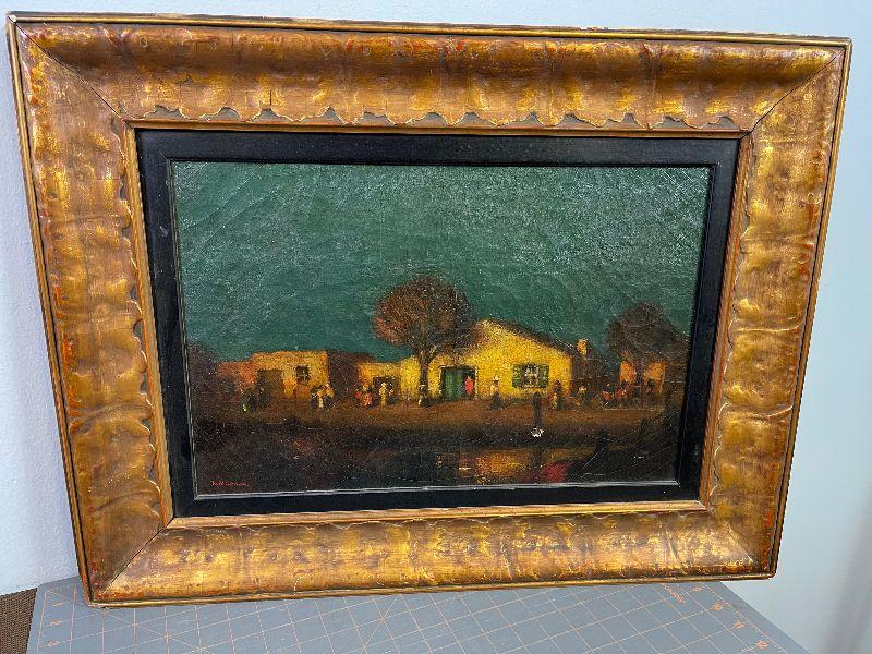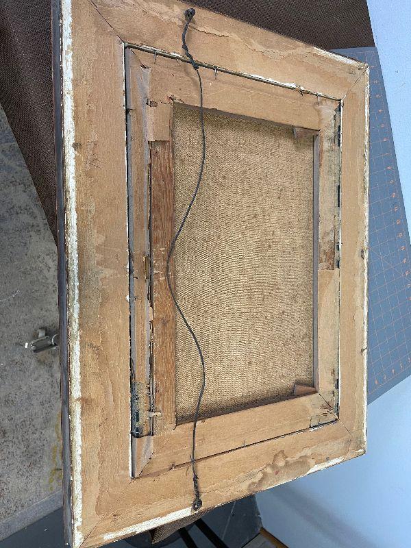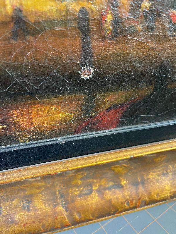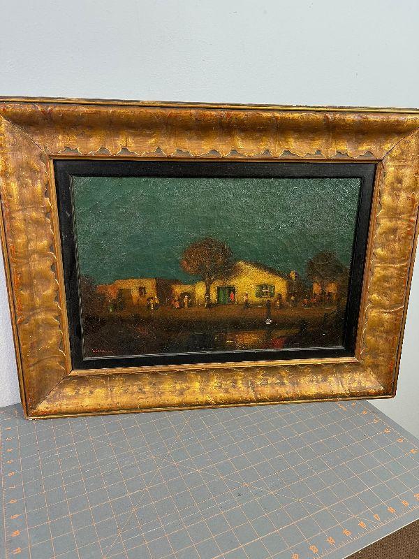 Framed 20 x 26 Has a hole or chip in the paint . At least 100 years old.