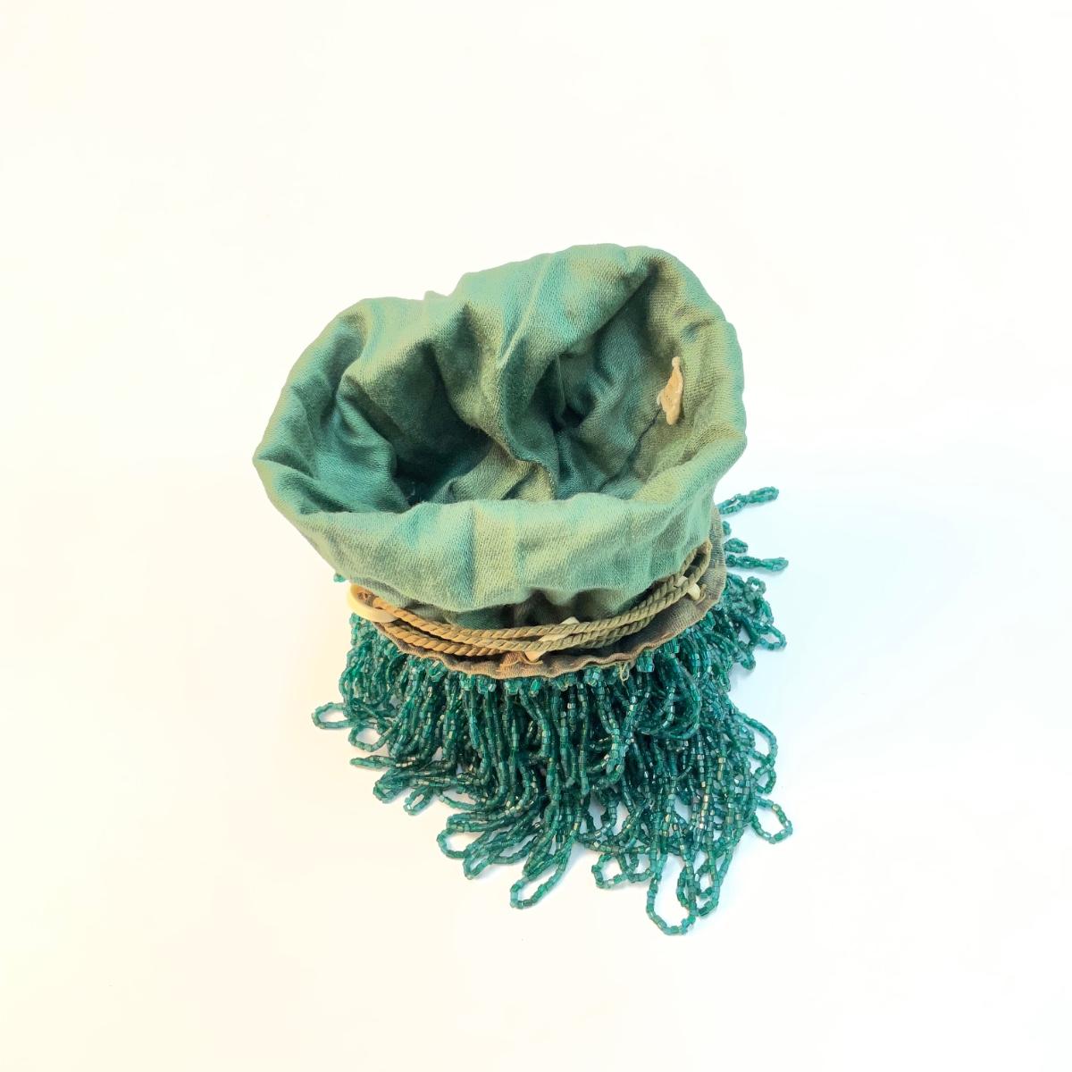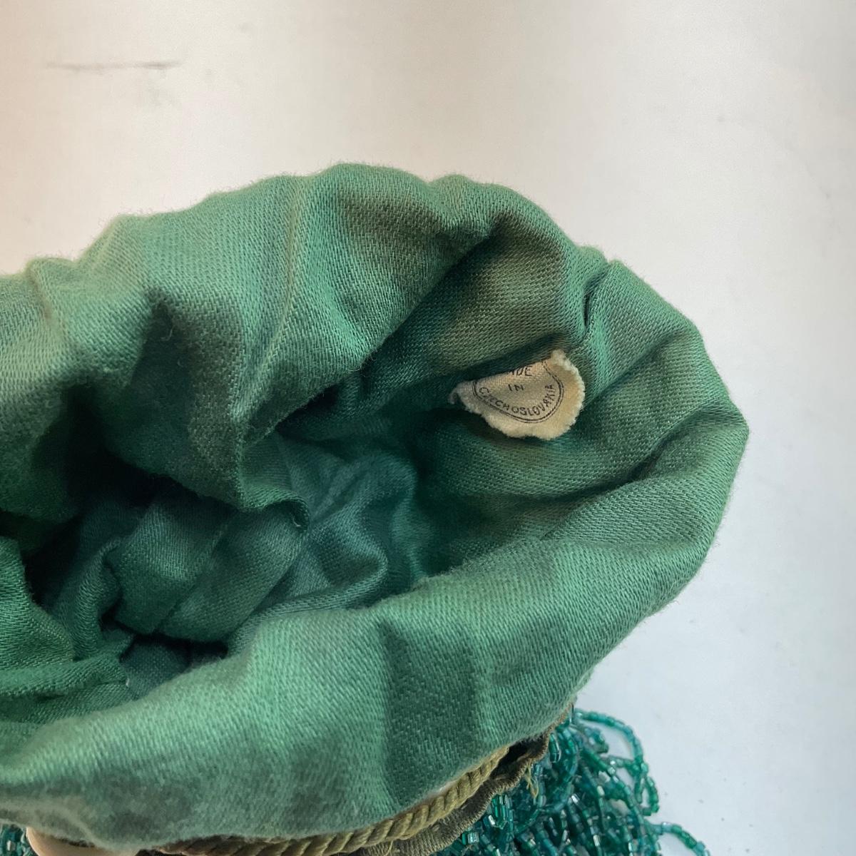 302 Vintage 1920s Emerald green fully beaded knit evening bag with tassel fringe