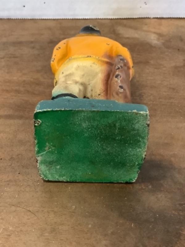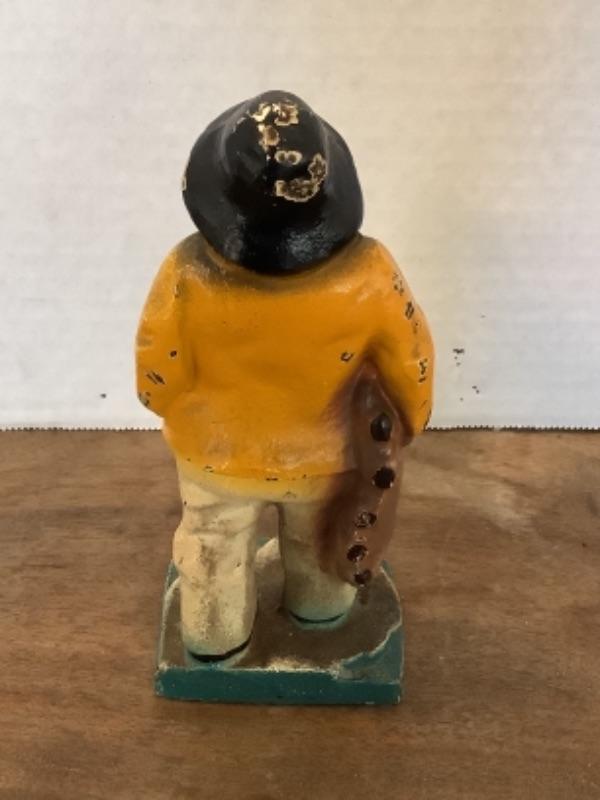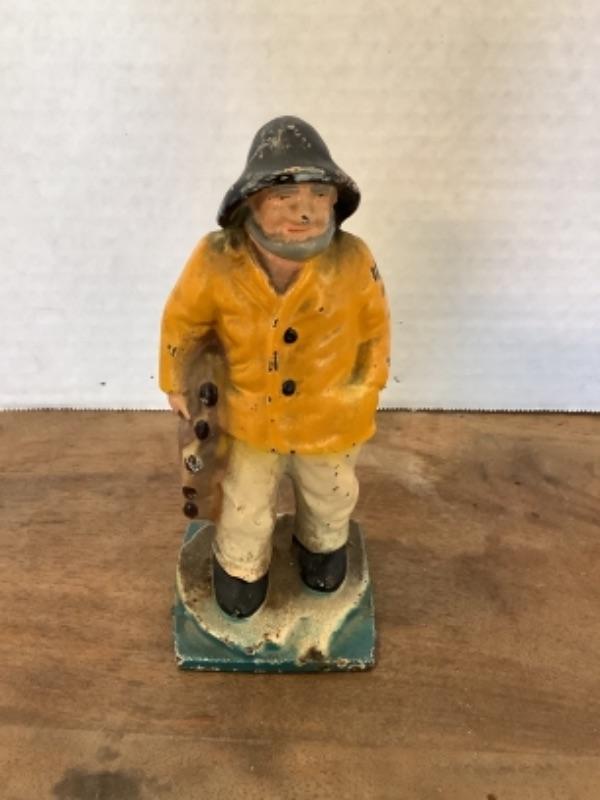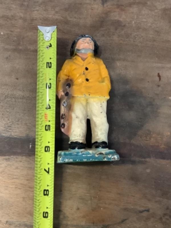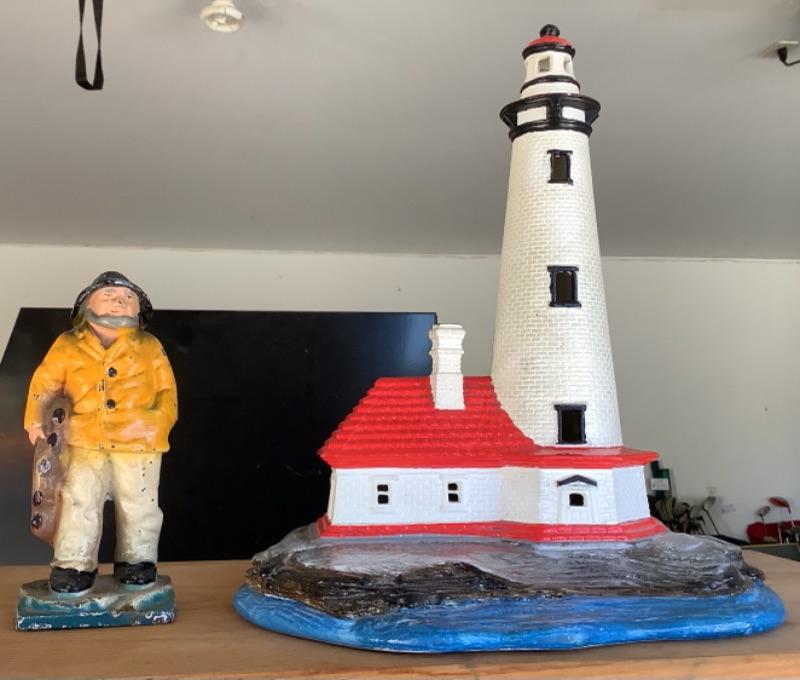 Small cast iron sea man figurine , has some wear, measures approximately 6” tall. Ceramic lighthouse signed Jeannie 1981